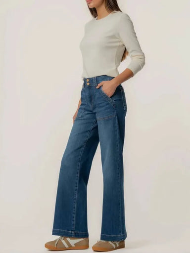 These high-rise wide leg jeans feature stylish patch pockets and a versatile medium wash for a timeless look. Crafted from very stretchy material,...