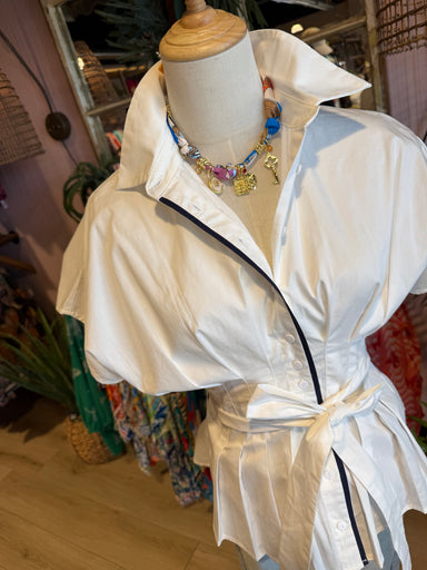 The Sabra Rae Top is a white button-down shirt crafted from 100% cotton, featuring cap sleeves and pleated details. Its navy stripe adds a refined ...