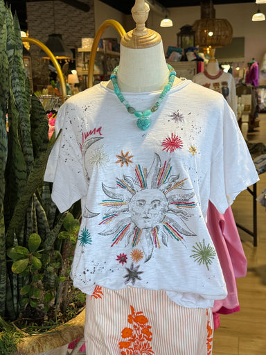 Design: The shirt has a large, central graphic of a sun and a crescent moon, both depicted with faces in an illustrated style. Details: The graph...