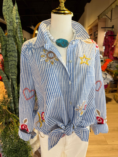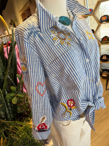 This long sleeve shirt features a blue and white striped design, complemented by embroidered stars, flowers, and intricate squiggly patterns. Made ...