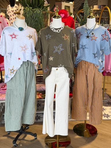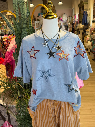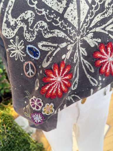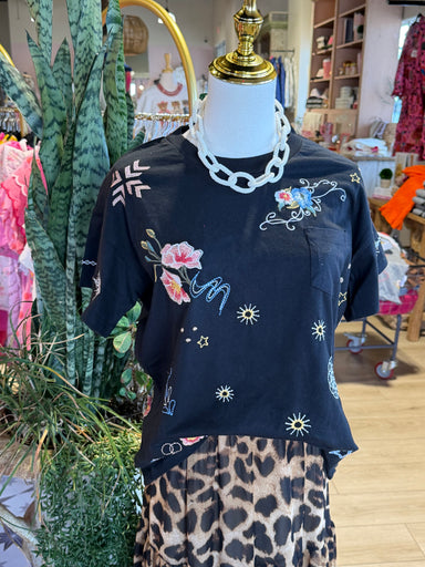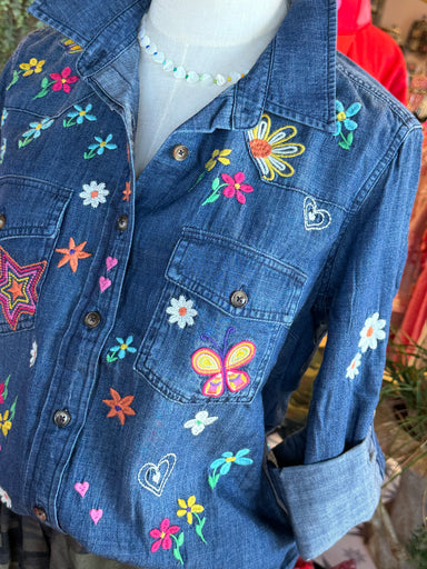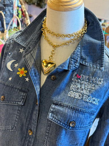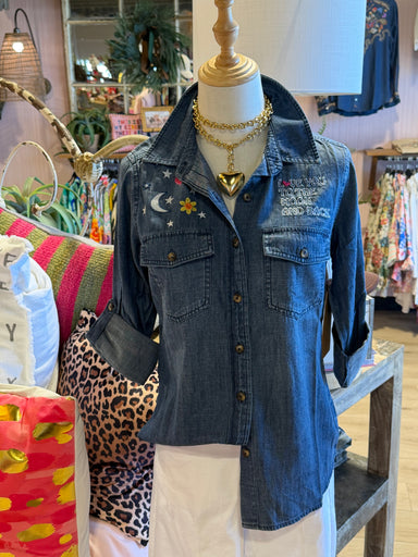 The "To The Moon & Back" denim top features intricate embroidery that adds a unique aesthetic appeal. Constructed from durable denim, this garm...