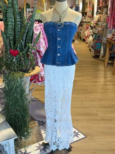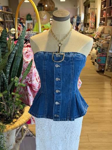 Strapless denim top, meticulously crafted in a contemporary corset-inspired style. It features prominent vertical stitching that accentuates its fi...