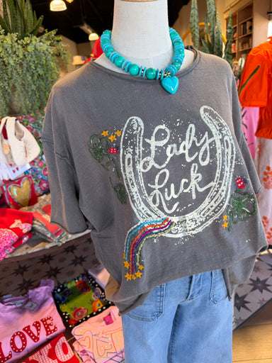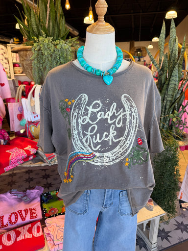 The Dionne Tee is crafted from 100% cotton, offering comfort and breathability. Its dark gray fabric features the phrase "lady luck" alongside a ho...