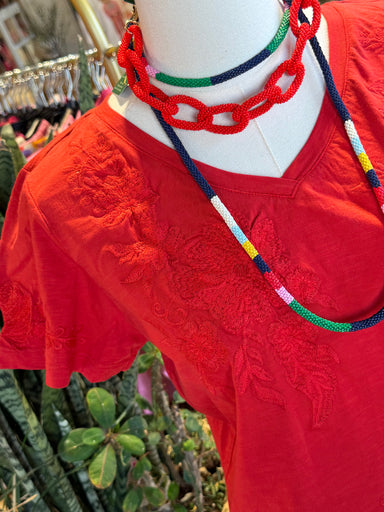 This image displays a red, V-neck t-shirt with intricate, tone-on-tone floral embroidery on the front. True fit