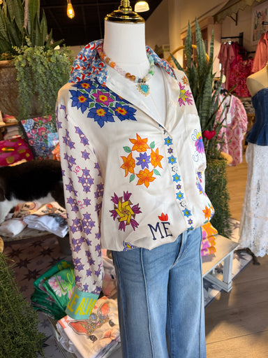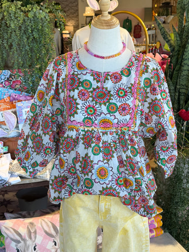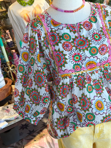 The Chrissy Top is crafted from a durable rayon nylon blend, featuring a folk art-inspired vibrant print. Its relaxed silhouette ensures comfort, w...