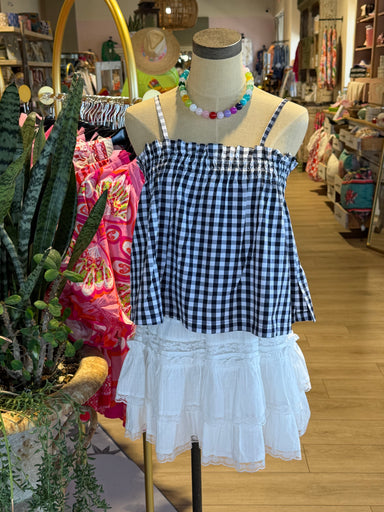 The Daphne Top features a flowy, swingy silhouette with adjustable shoulder straps and an elasticized ruched bodice for a flattering, flexible fit....