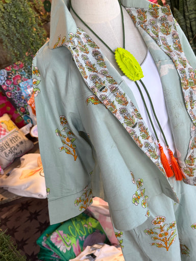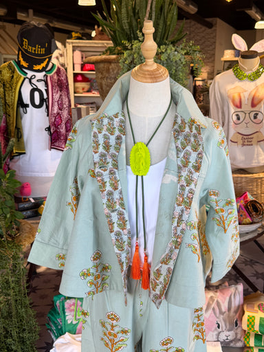 The Aqua Print Swing Jacket features a custom Mint print and flower button detailing, crafted from high-quality cotton. This jacket combines aesth...
