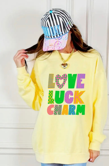 Celebrate the season of Luck in cozy style with the Love Luck Charm sweatshirt ^ Adult printed on a yellow 50% cotton 50% sweatshirt