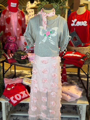The Kelly Rose Tee features a delicate lace bow print and an embroidered rose at its center, crafted from 100% soft cotton. This combination ensure...