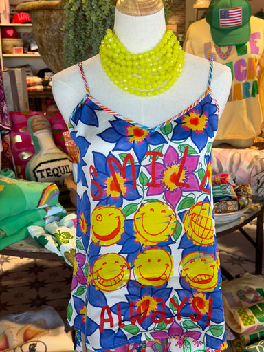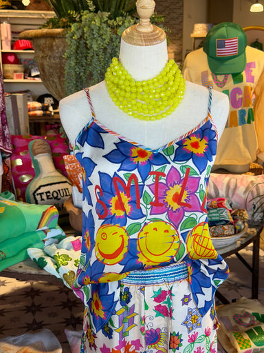 Radiate happiness with the Angelique camisole from our Markers collection, featuring bright yellow smiley faces across a bold blue geometric star p...