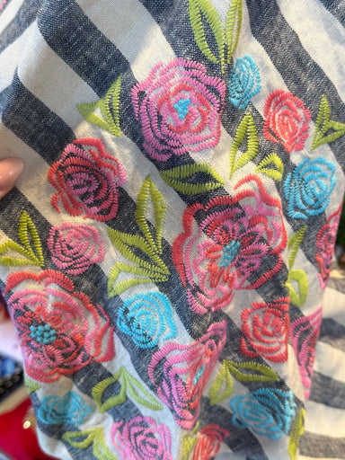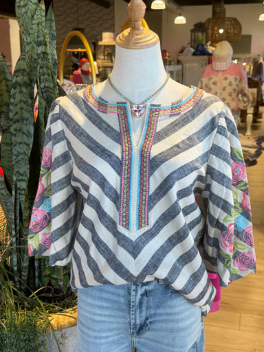 The Leishon Gray Top features a linen blend fabric with a distinctive blue stripe pattern, enhancing breathability and comfort. It is adorned with ...