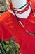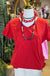 This image displays a red, V-neck t-shirt with intricate, tone-on-tone floral embroidery on the front. True fit