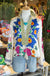 Mia blouse from our Markers collection, featuring a stunning chain of printed yellow flowers with orange petals cascading down the back center. Sharp geometric cube patterns in purple, lime, and turquoise create striking contrast, while large blue flowers and pink roses bloom on the sleeves.