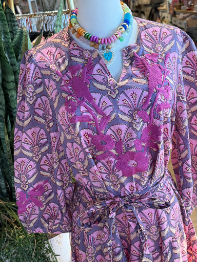 The Mayra Top features a lilac and pink floral design with intricate embroidery detailing. Constructed from cotton, it offers breathability and com...