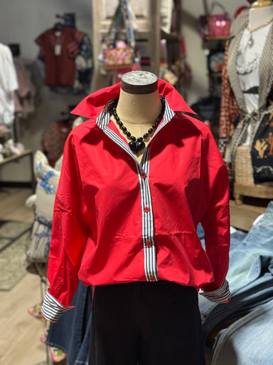 The Katherine Top is a professional and stylish addition to any wardrobe. Made with 100% cotton, this button down top features a bold red collar an...