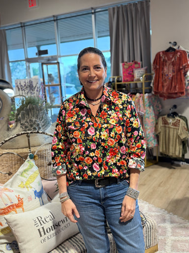 Introducing the Valerie Floral Top - your next go-to transitional piece! This elegant top features a stunning floral pattern and a chic button-down...