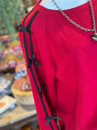 Get ready to elevate your wardrobe with the Maddie Rae Top. This stunning red scuba sweatshirt features chic black ribbon bow detailing for a touch...