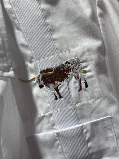 Great white top with embroidered longhorn. Button up. Great paired with khakis mens