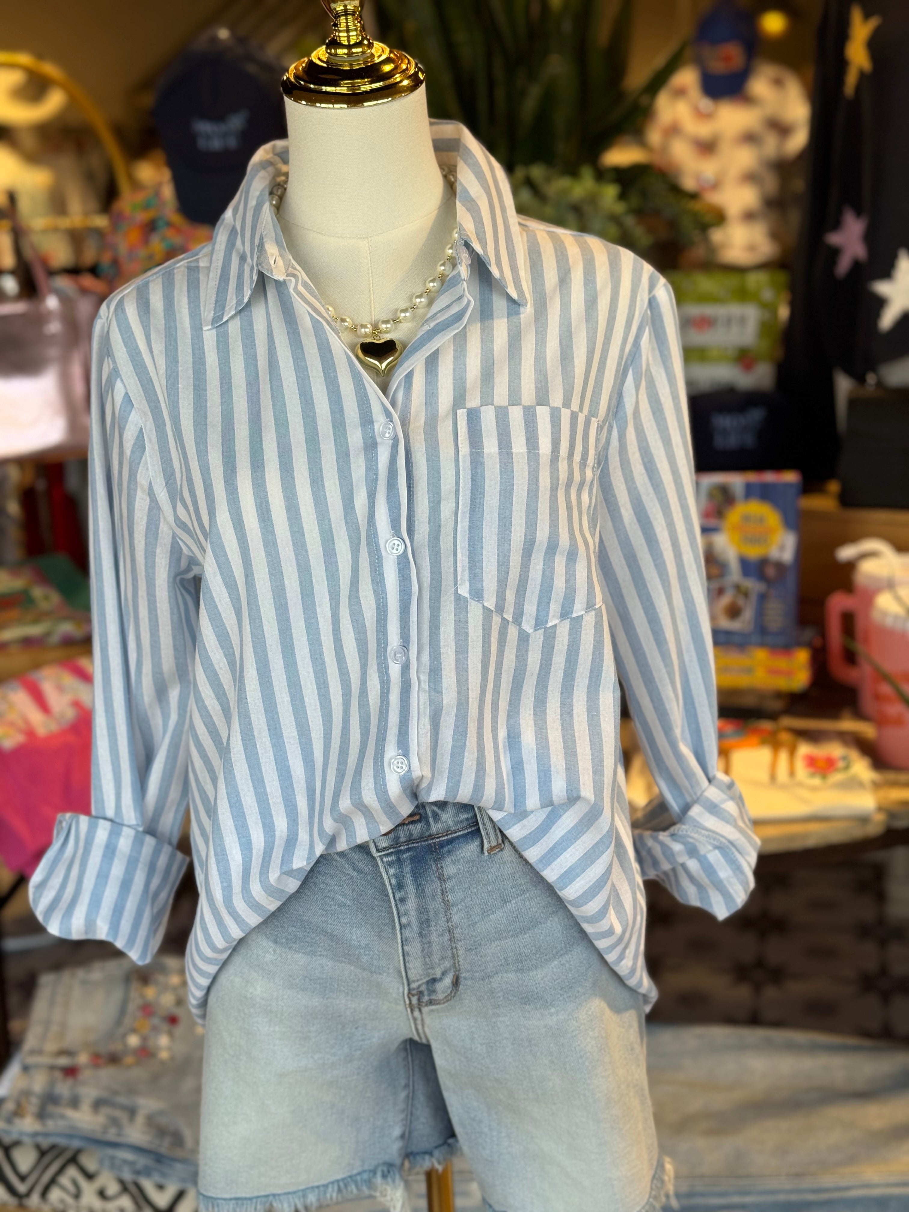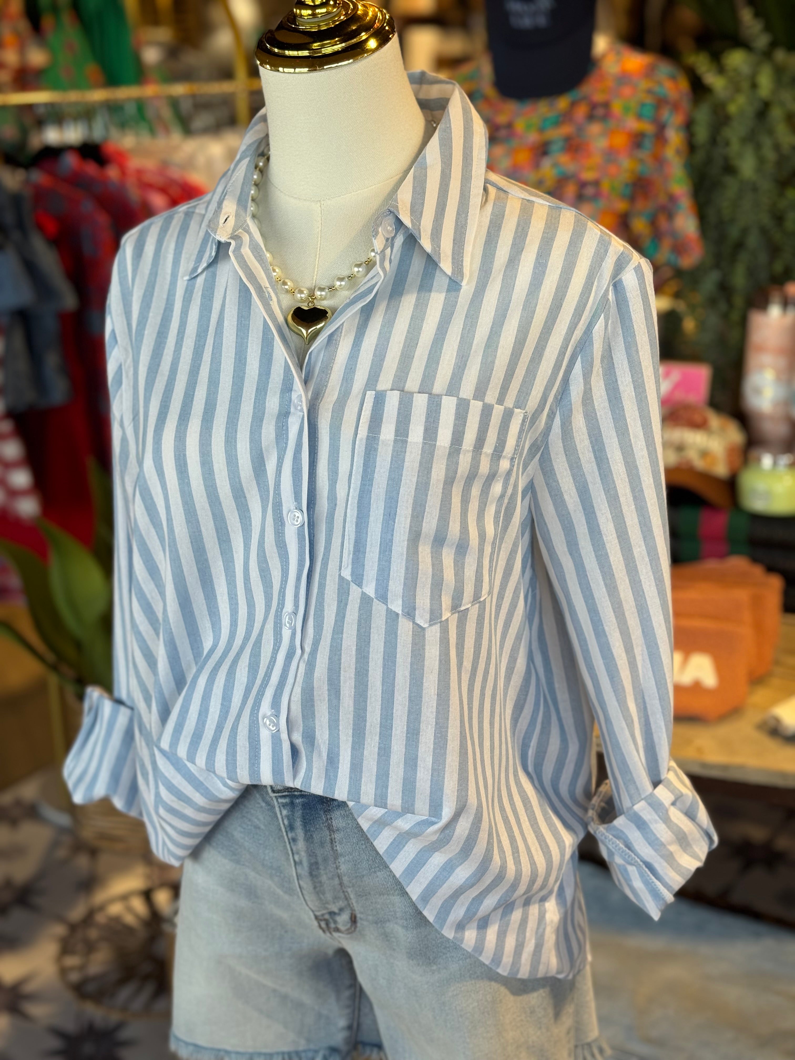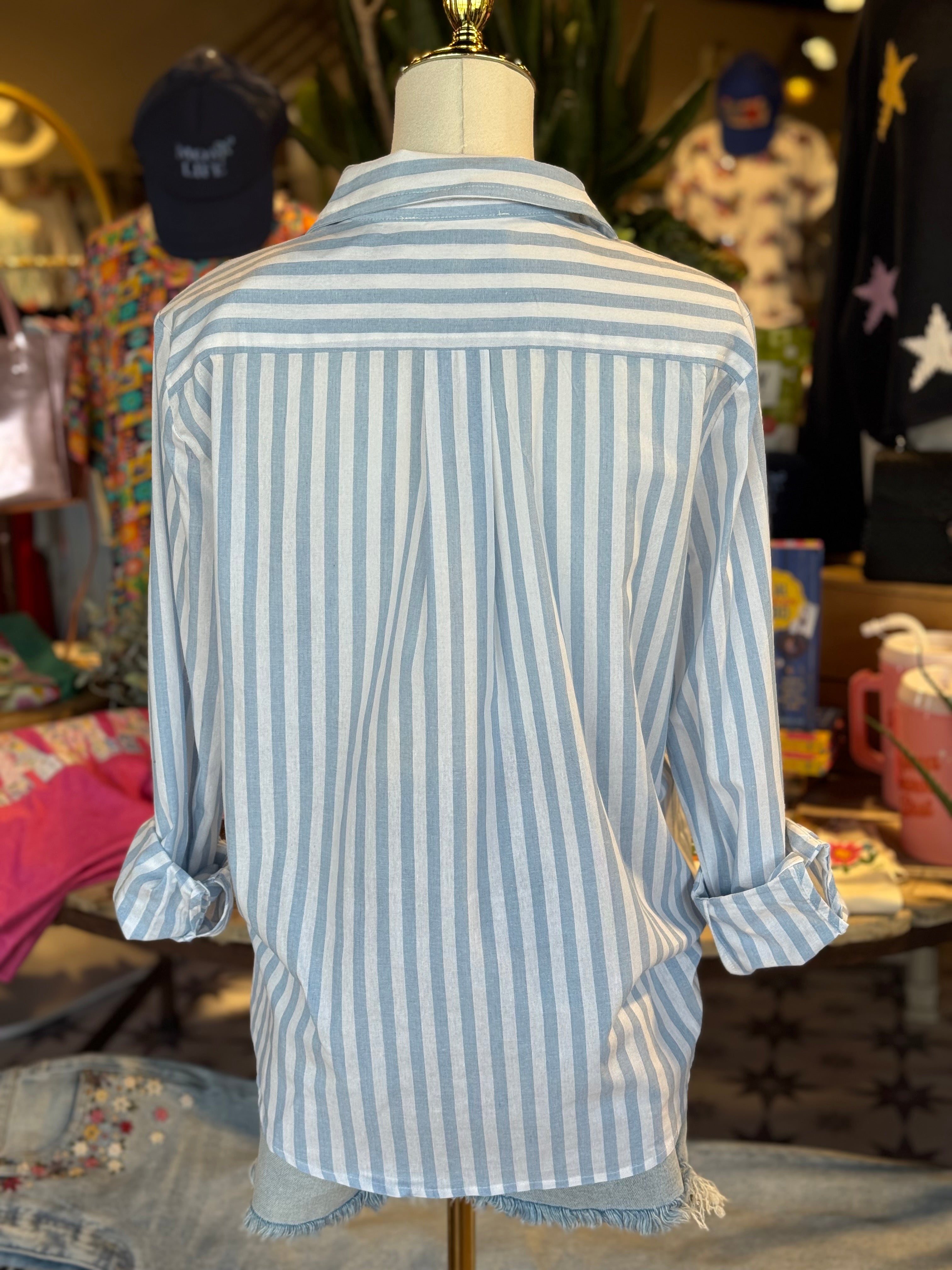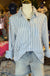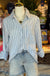Blue and white stripe Cotton button up blouse. Easy to wear.
