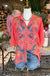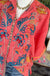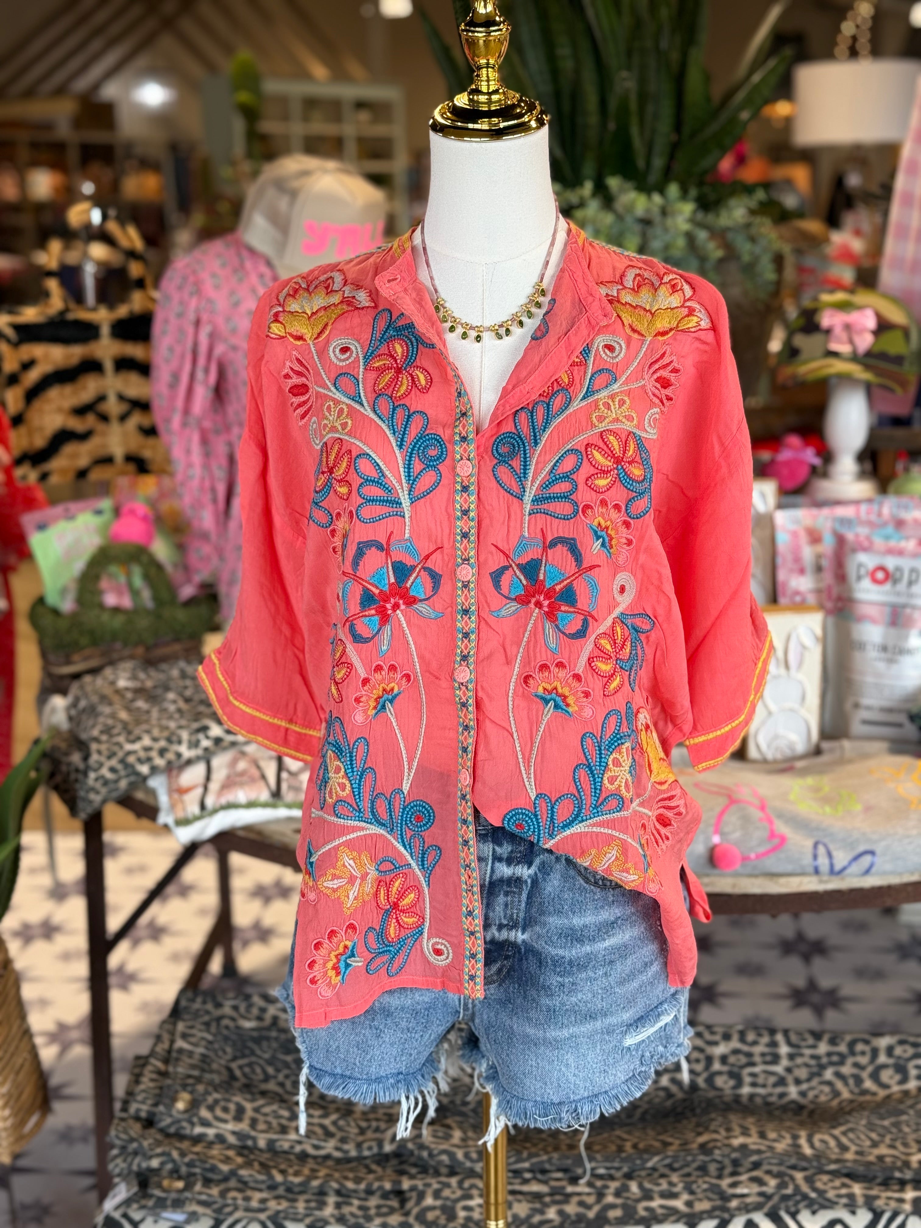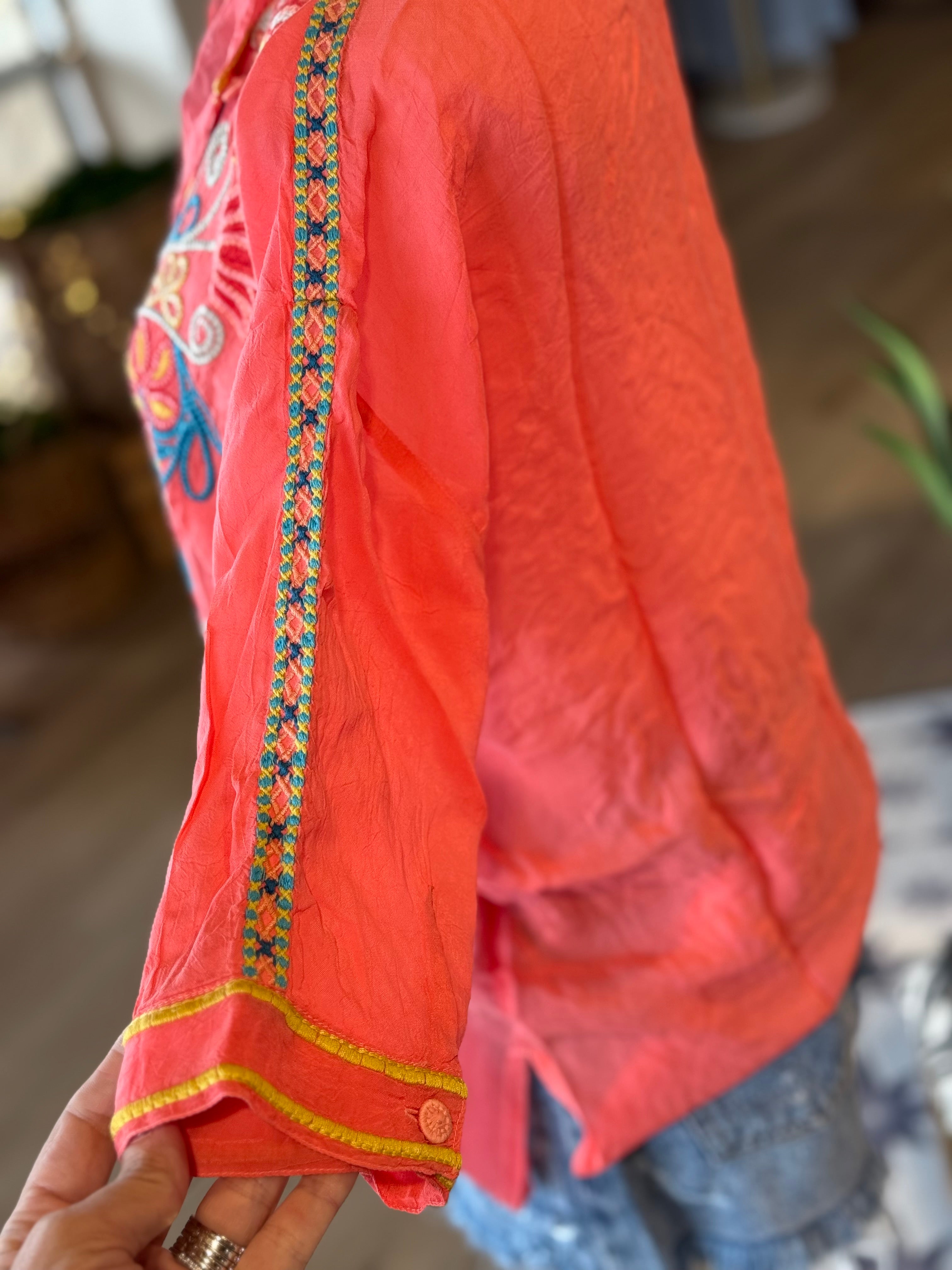 Stunning coral 3/4 sleeve silk blouse with bright embroidery detailing. True to size