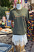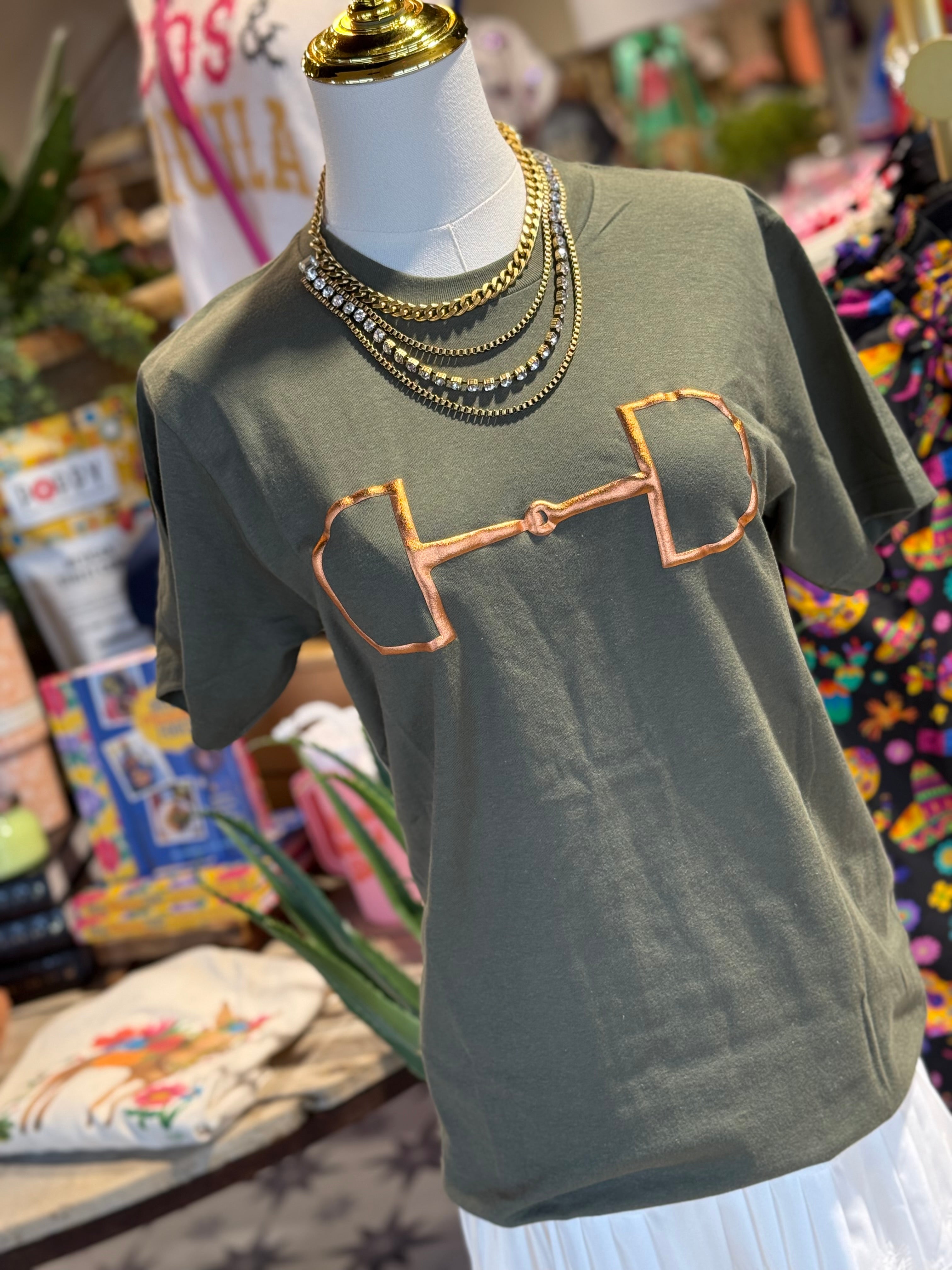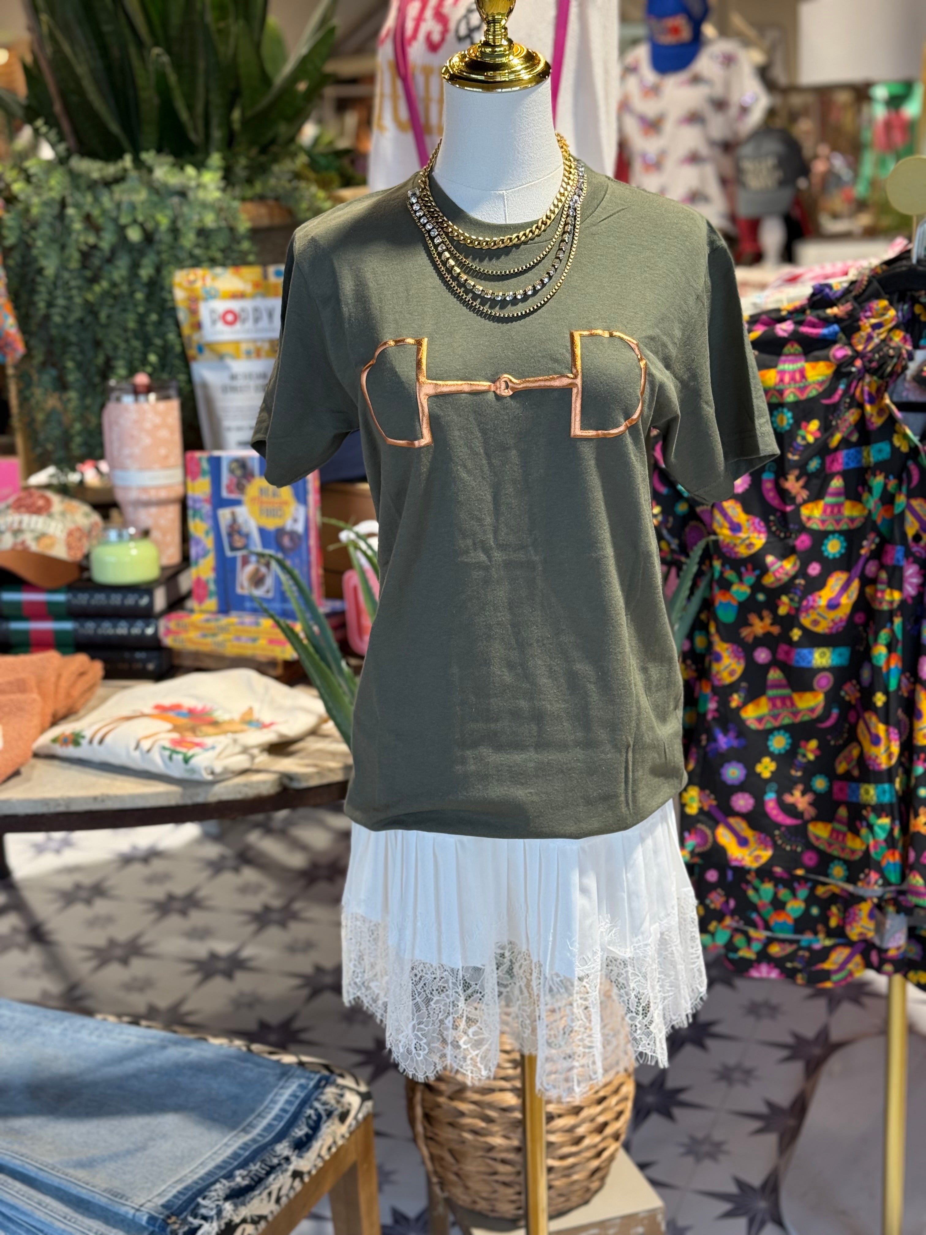 Unisex army green tee with bronze puff bit