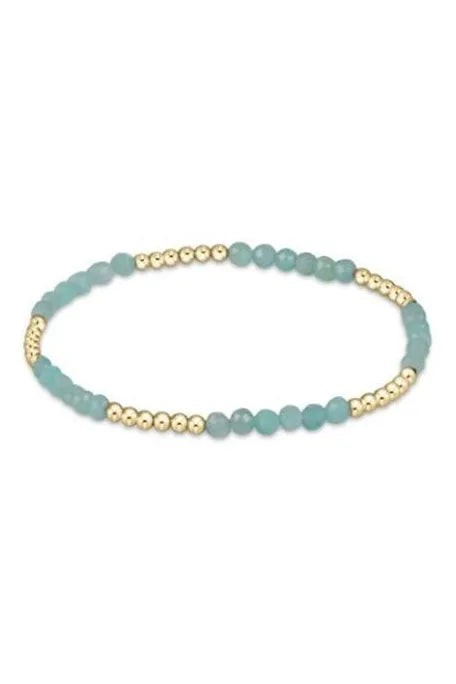 New blissful pattern in gemstones! -Made with 2.5mm, 14kt gold-filled beads and 3mm gemstones -Worry-free wear‚ which means sleep, shower and sweat in it -Hand beaded on high performance elastic for a slight stretch to easily roll on and off your wrist -Measures: standard (6.25")