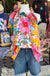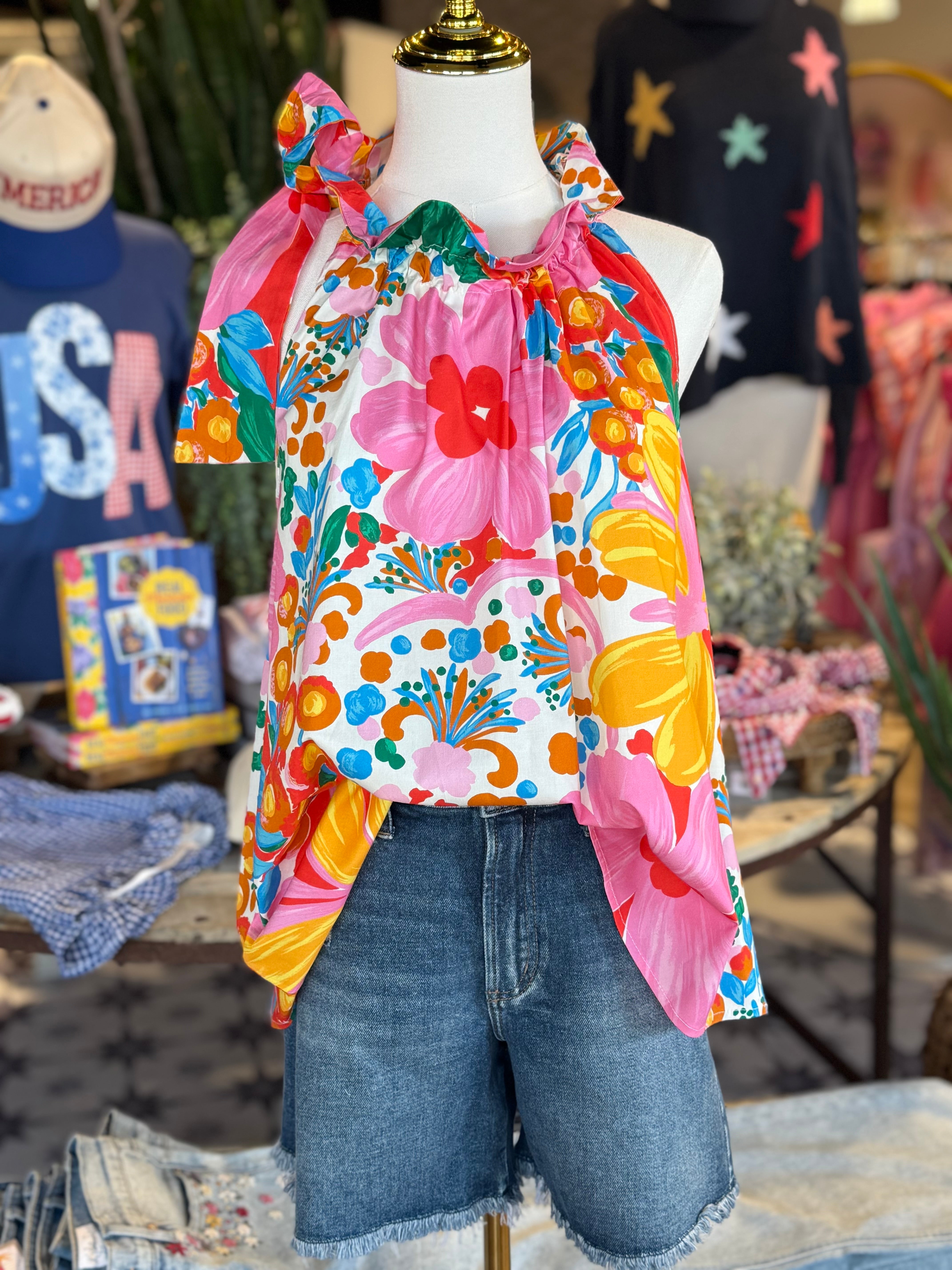 "Be the life of the party with our Bridgett Top! This fun and flirty top features a playful floral gardens cape print and a ruffle tie neck. Made with a comfortable cotton and spandex blend, it's super flattering for any body type. Get ready to turn heads and have a good time!"