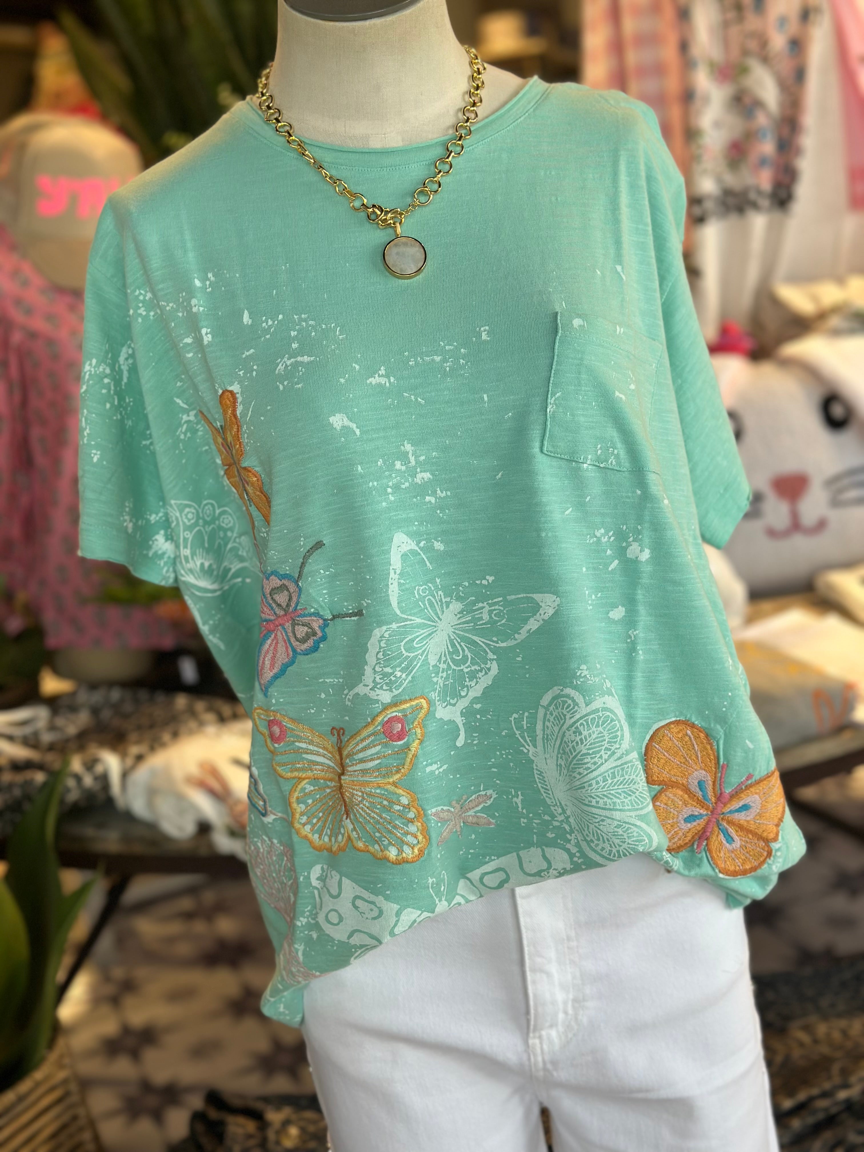 Piercing Turquoise tee with Embroidered butterflies. Cotton