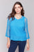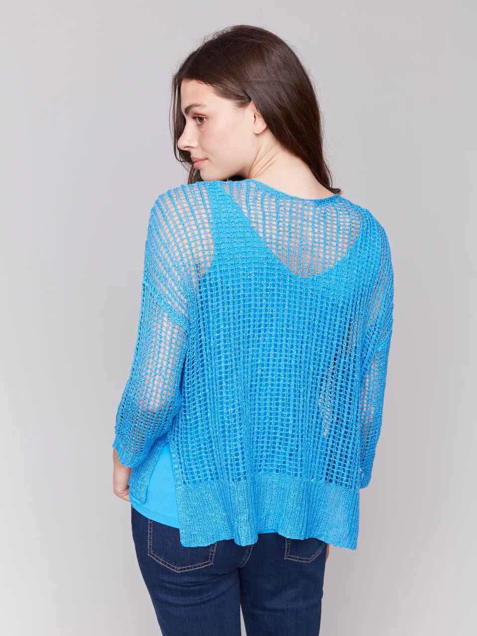 Discover the perfect blend of comfort and practicality with our lagoon blue V-neck fishnet crochet sweater. Its loose, airy design is ideal for layering, while the drop shoulder and 3/4 sleeves add a chic, laid-back vibe this spring.