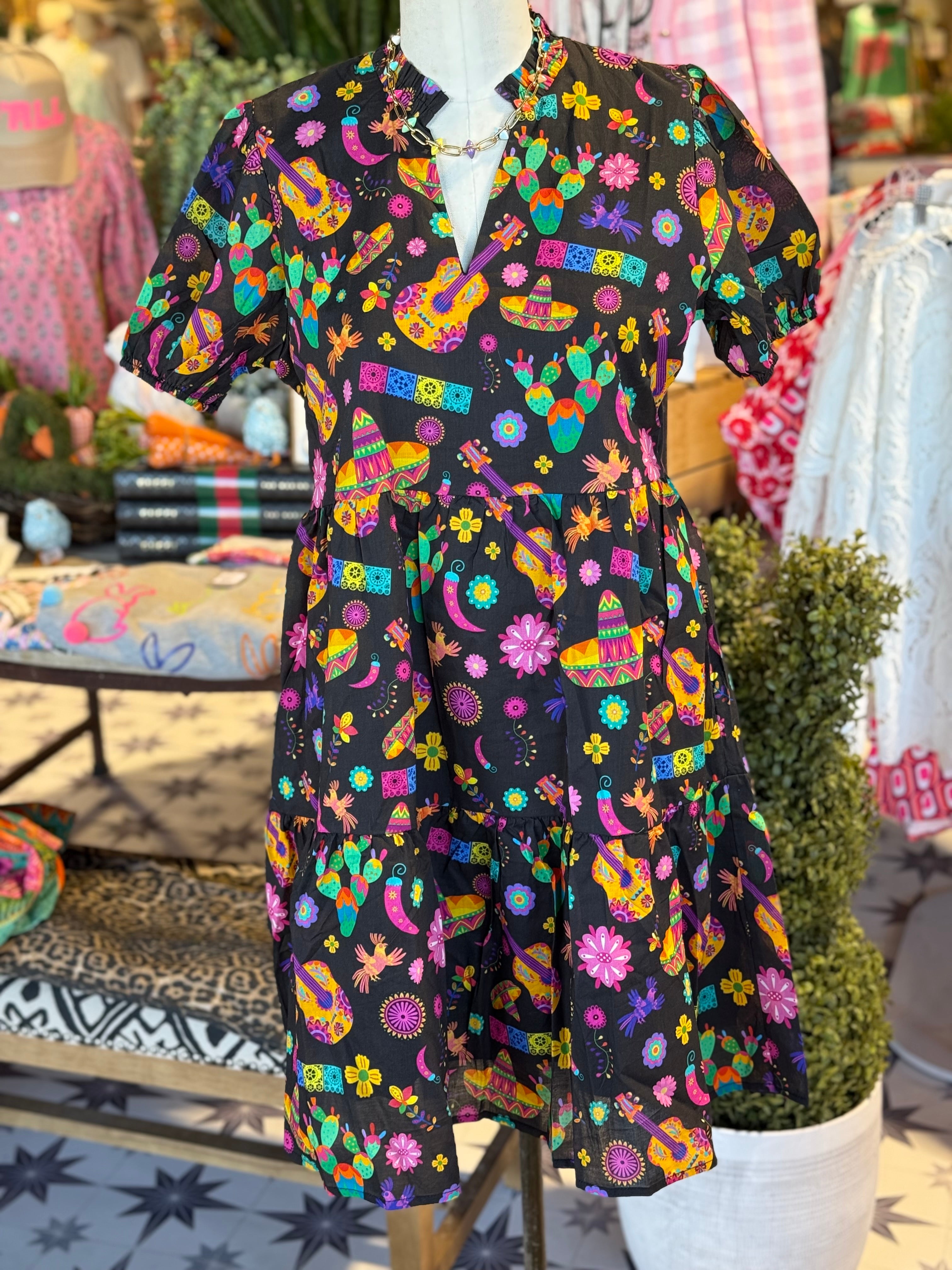 The Claire Fiesta Dress is a super fun dress for your fiesta events! This dress is a v-neck with a small puff sleeve and pockets of course! Pair with a fun-colored sandal!