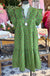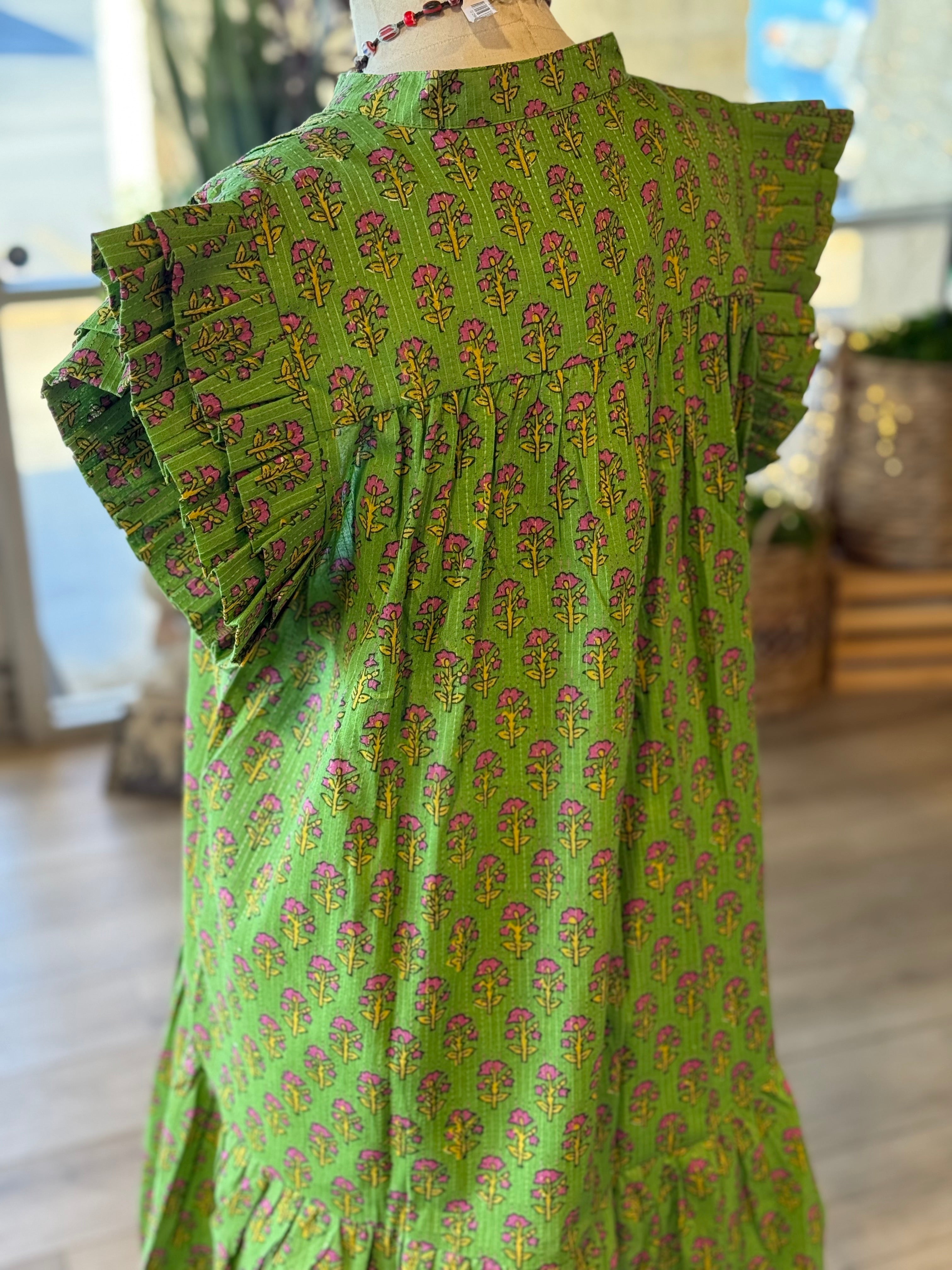 This dress as all the details that you will fall in love with. The Collins dress is a beautiful green floral stamped fabric. It features a subtle double ruffle sleeve and the prettiest cutouts with pink stitching details around the top. this will be your new go-to dress during the spring and summer to dress up or dress down.