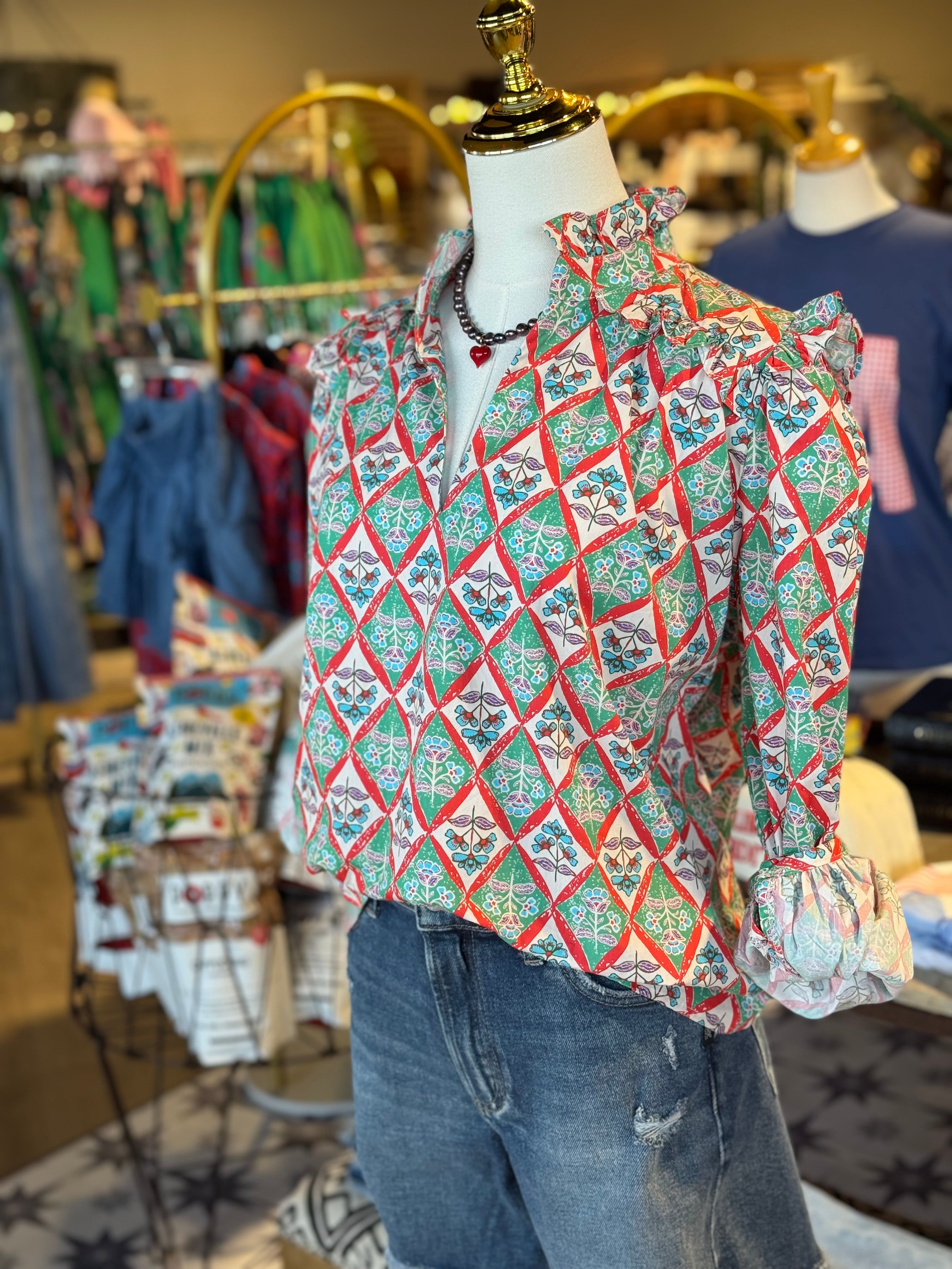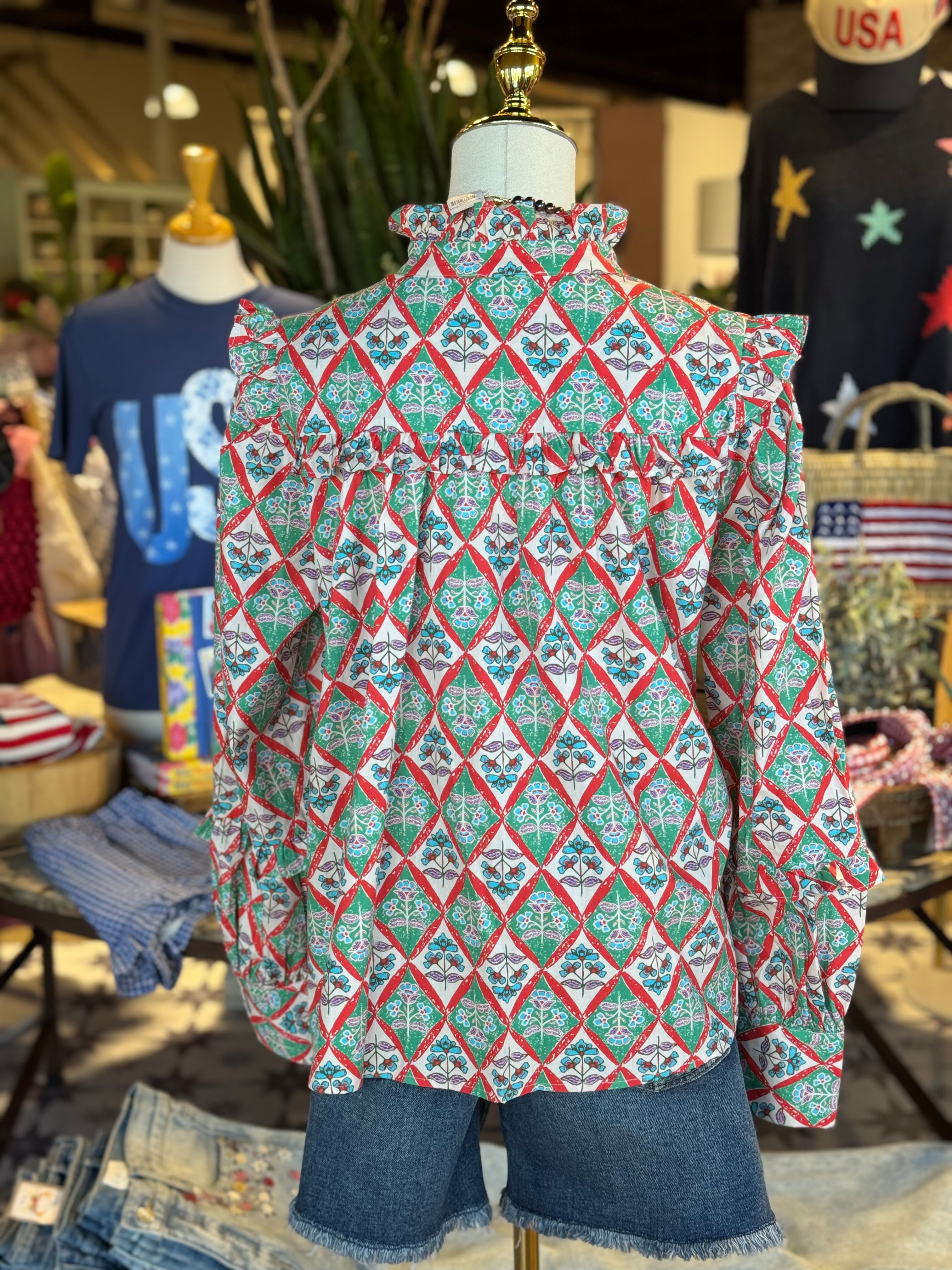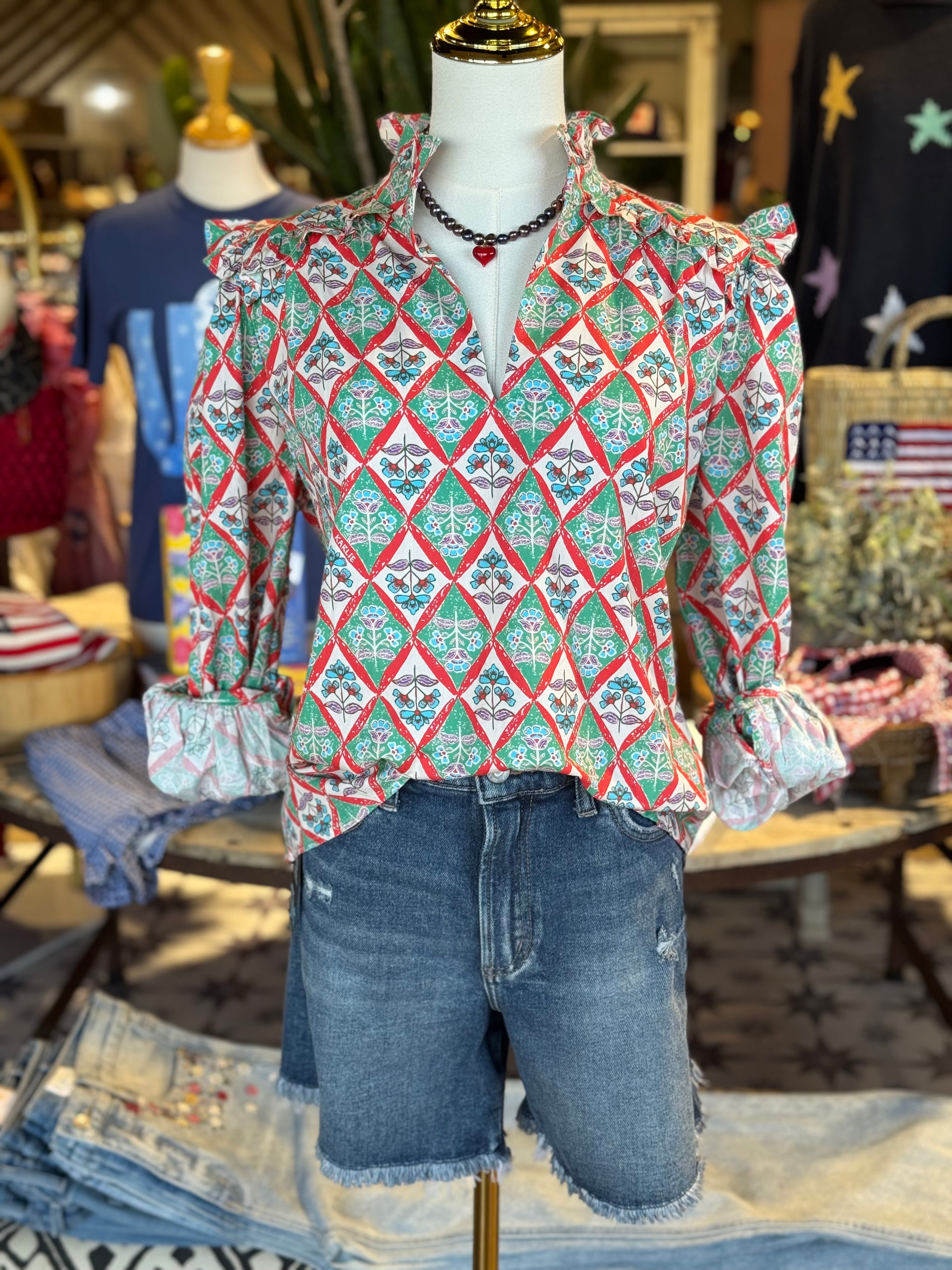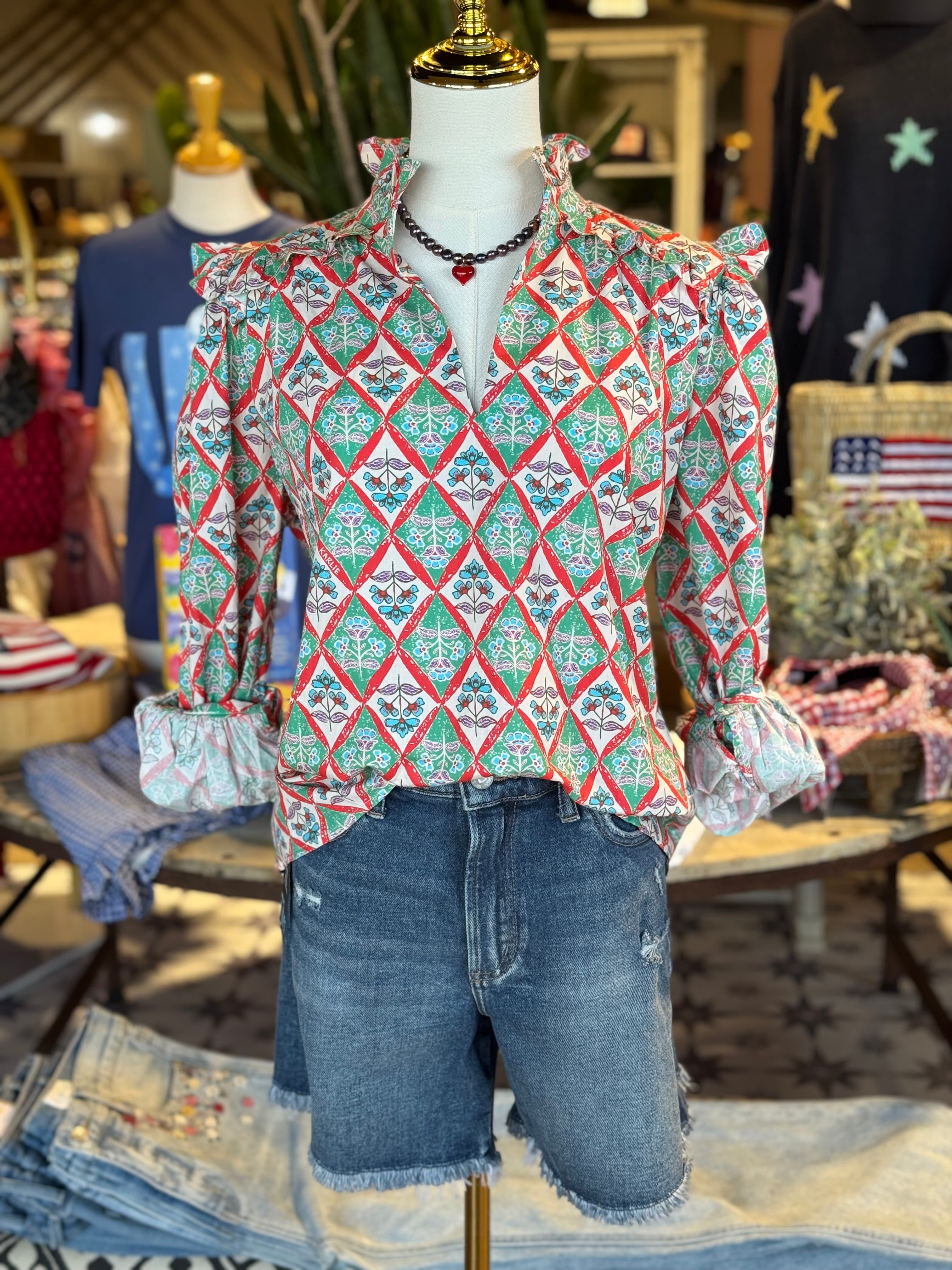 The Crimson Top features a Paris floral design, v-neckline, and ruffle sleeves, all made from 100% cotton. With its elegant and feminine design, this top combines fashion and comfort for a truly versatile addition to your wardrobe.