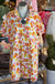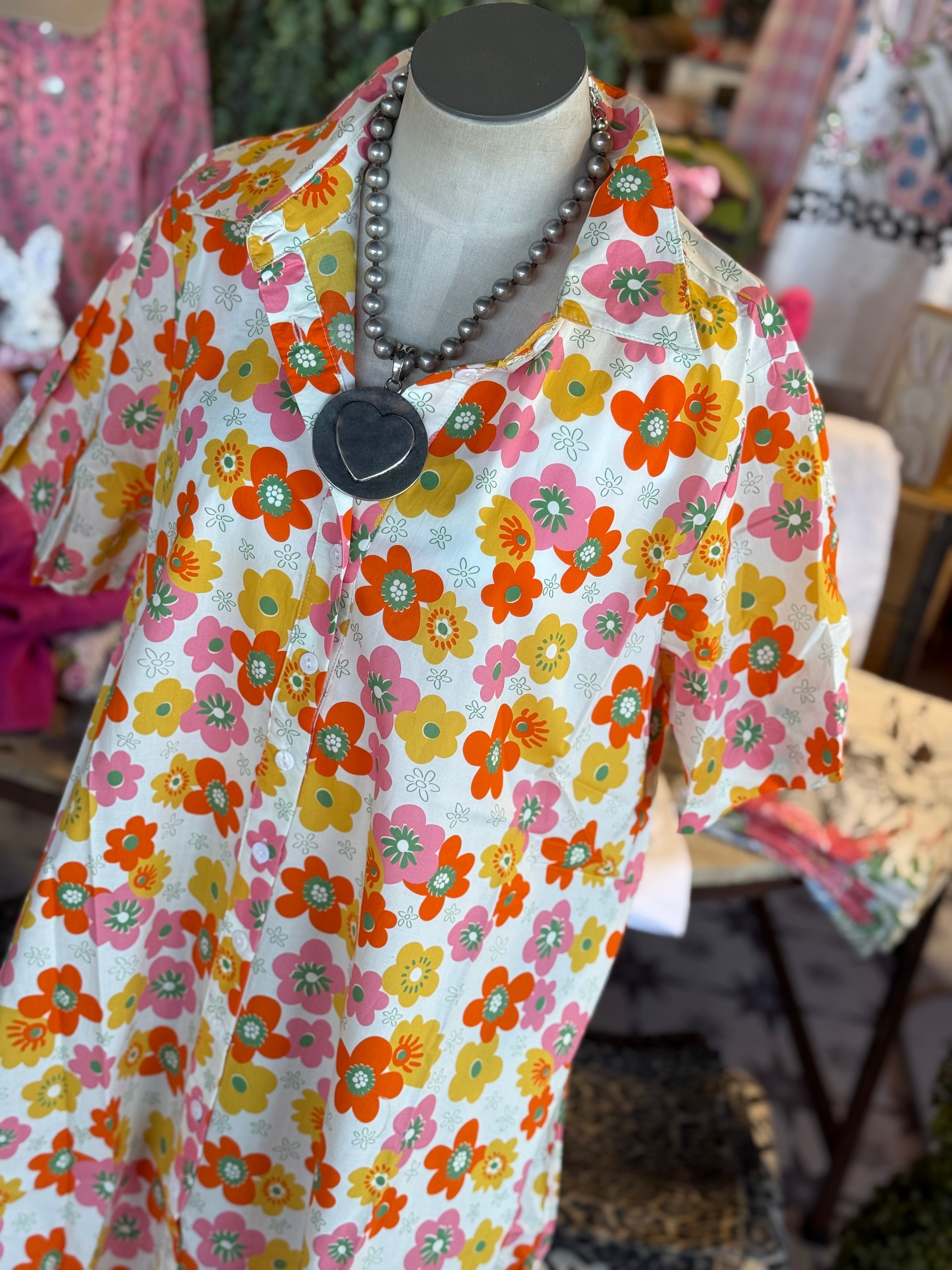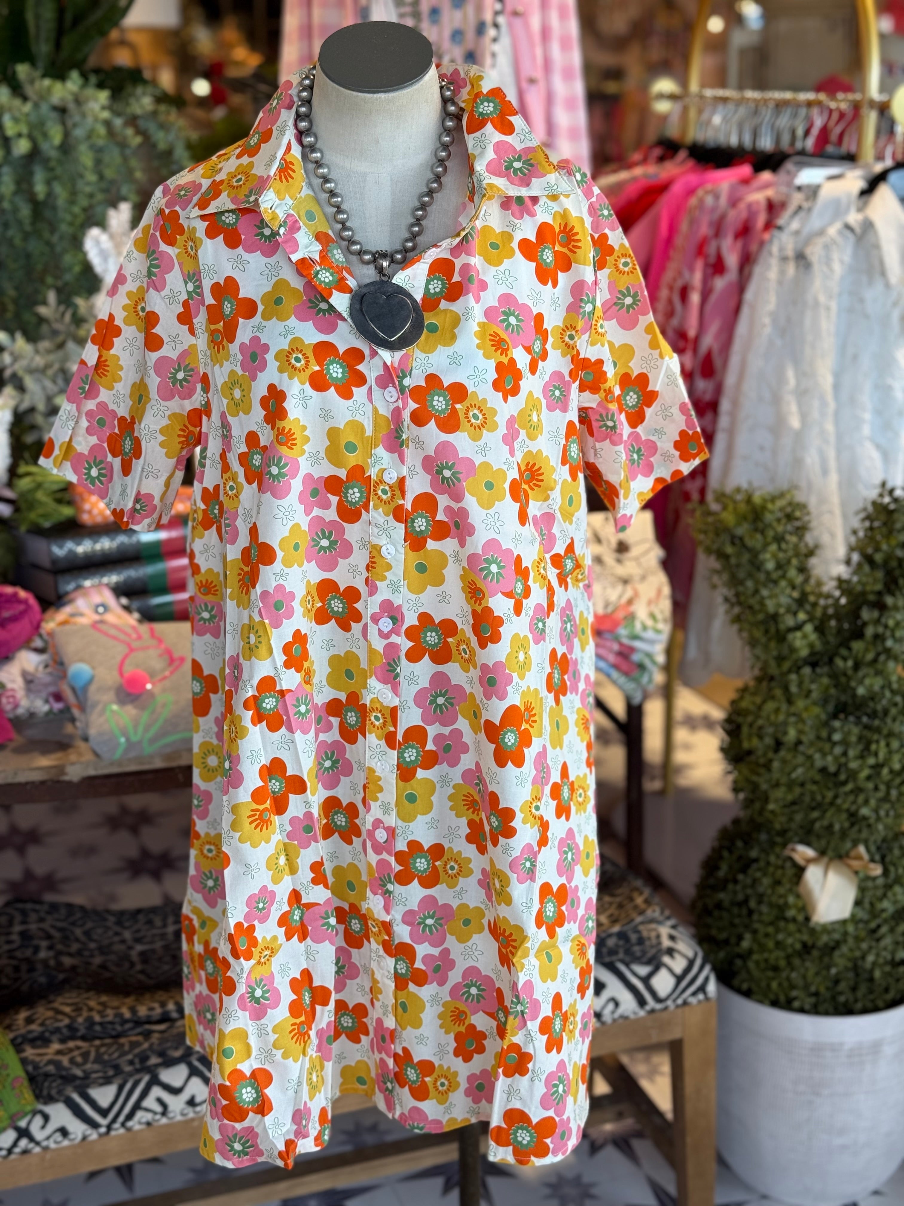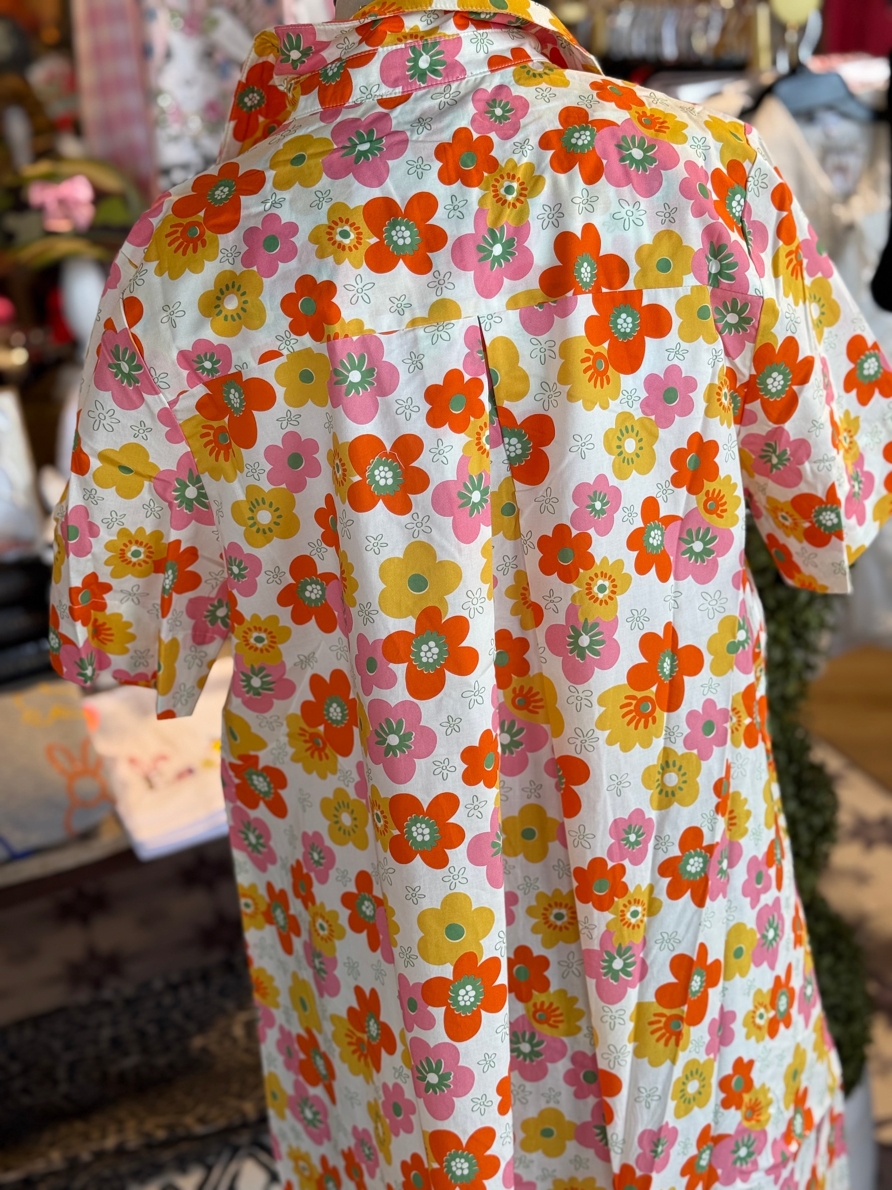 Adorable floral print in this shirt dress design.