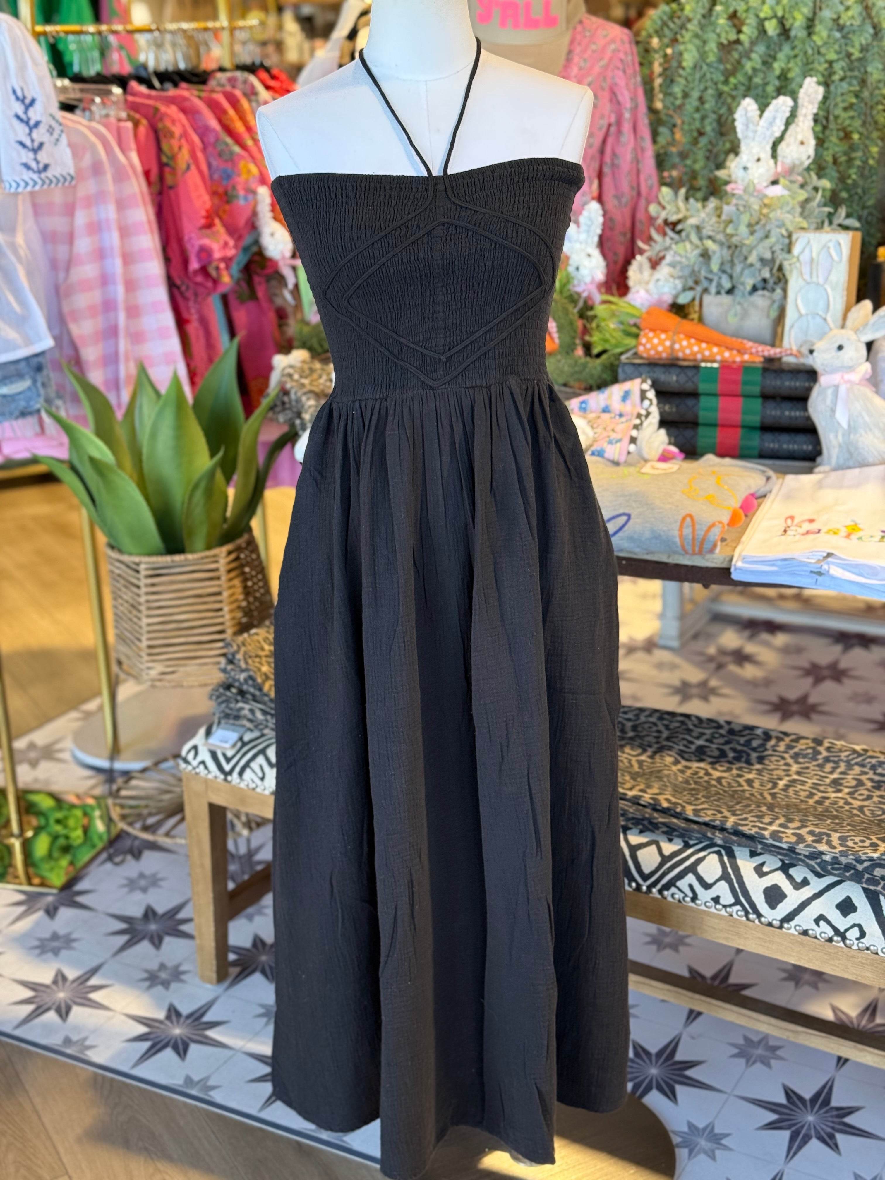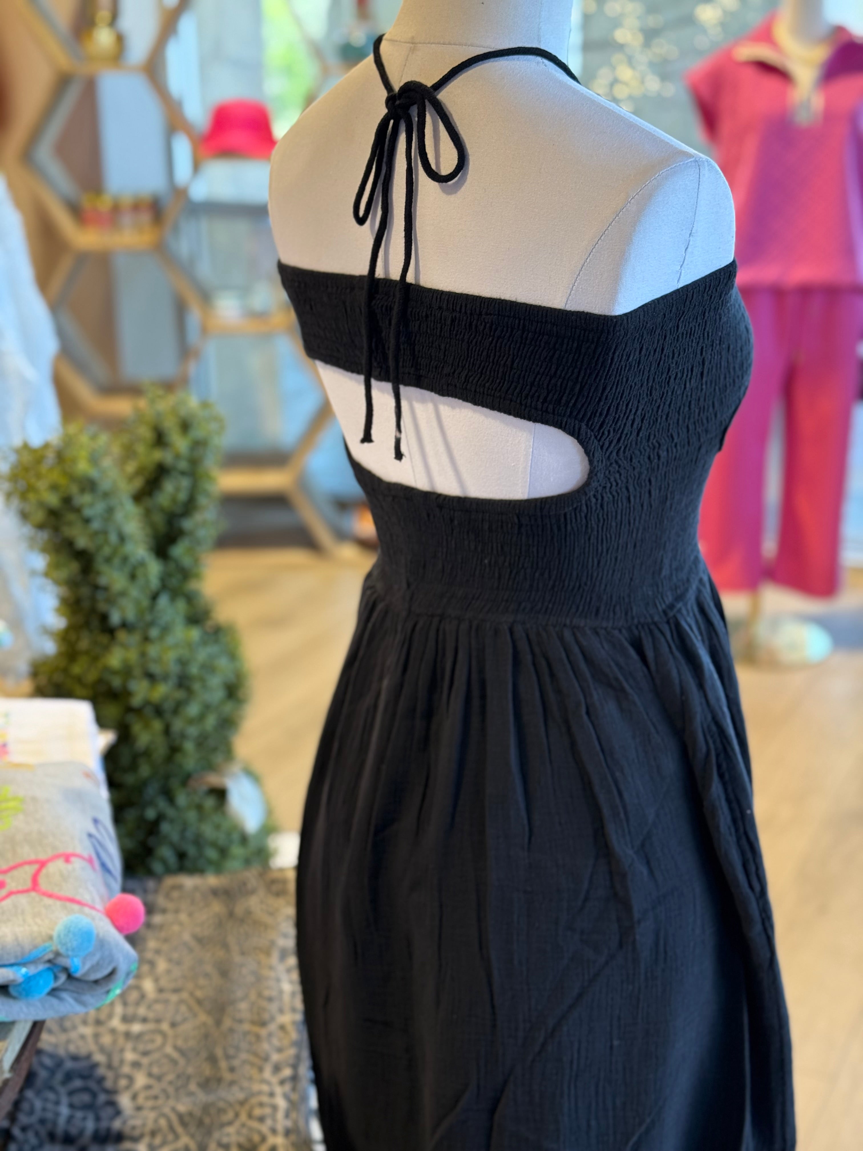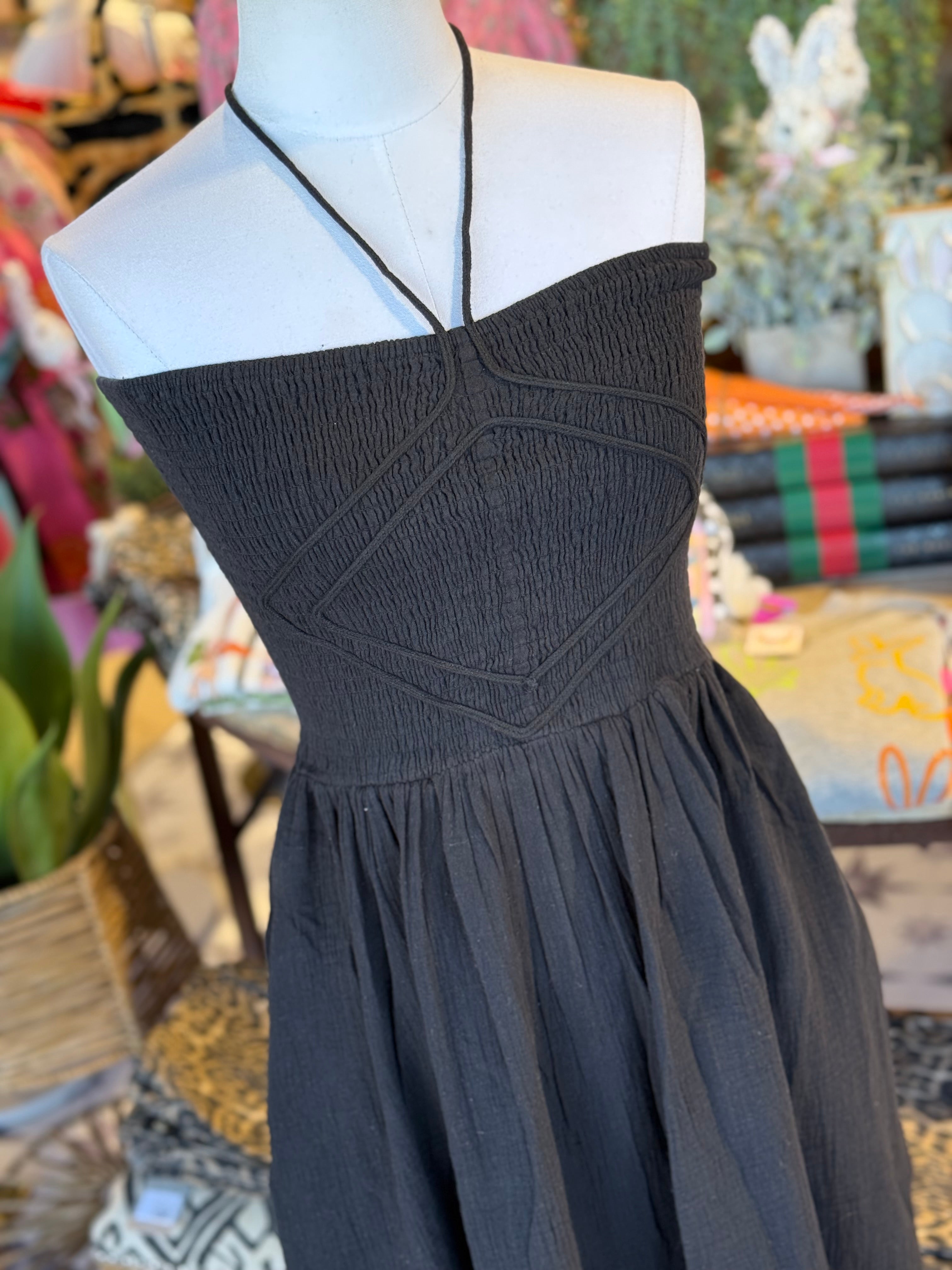 Black gauze strapless dress with cute tone on tone details and cut out in back.