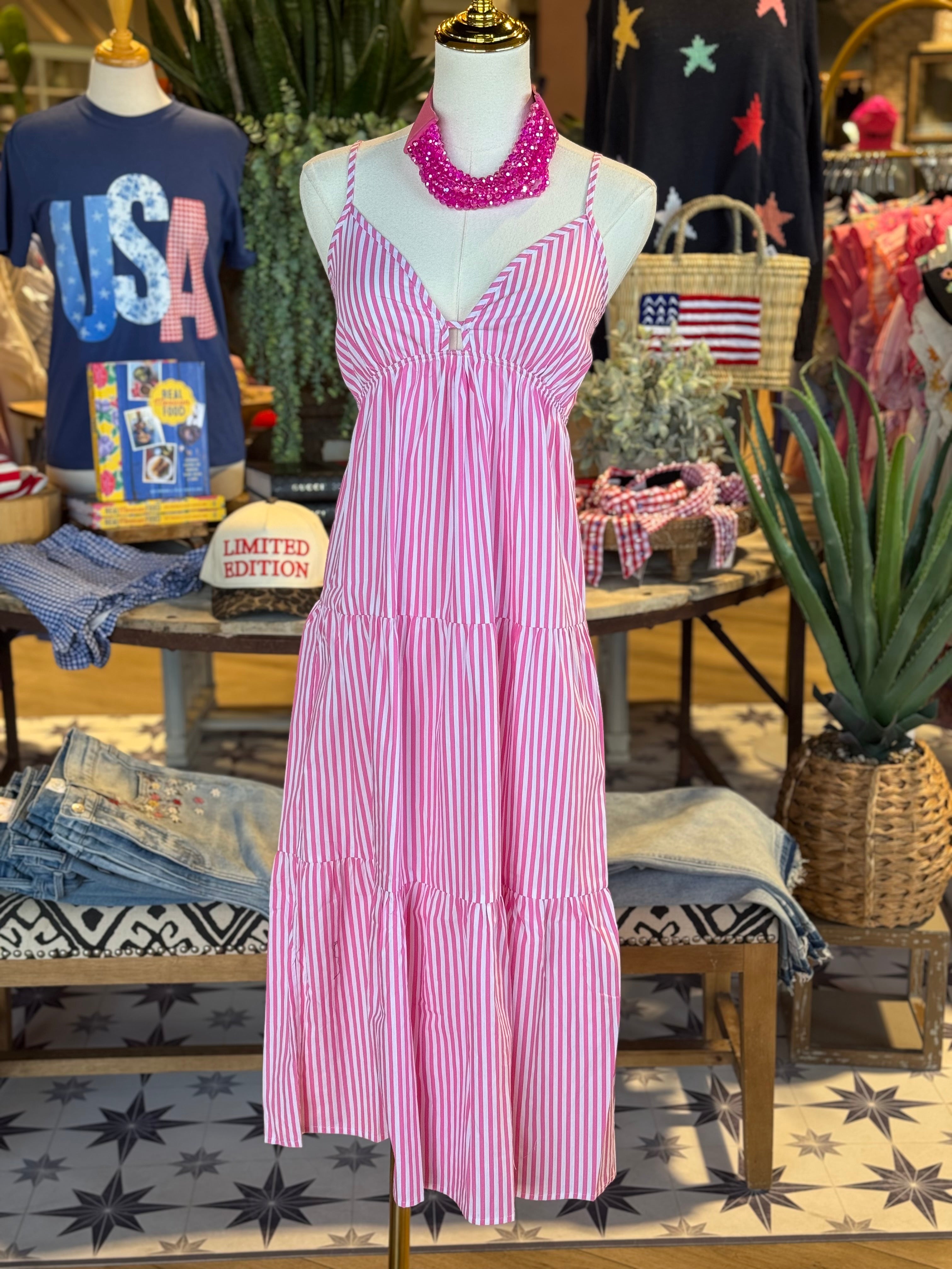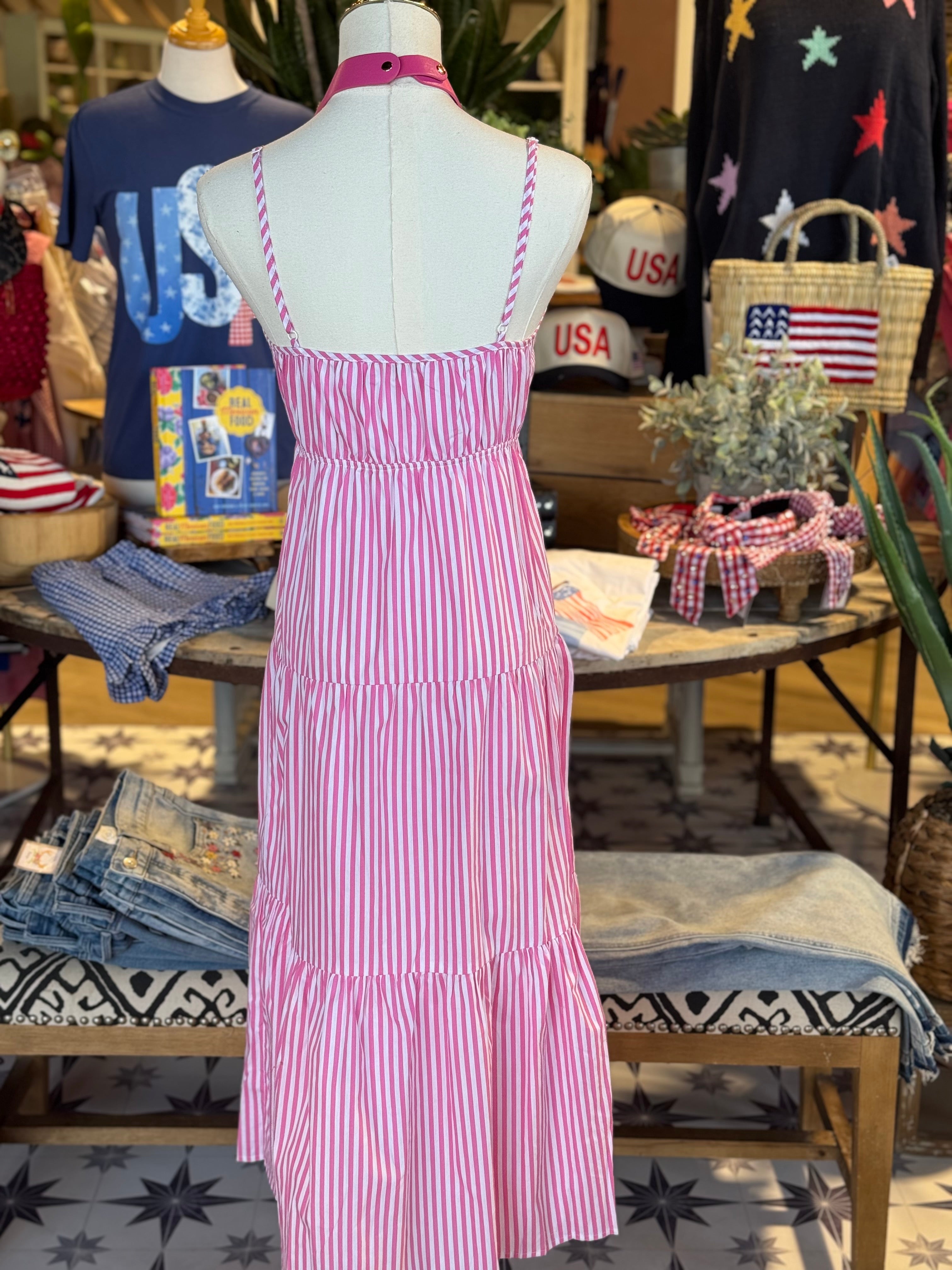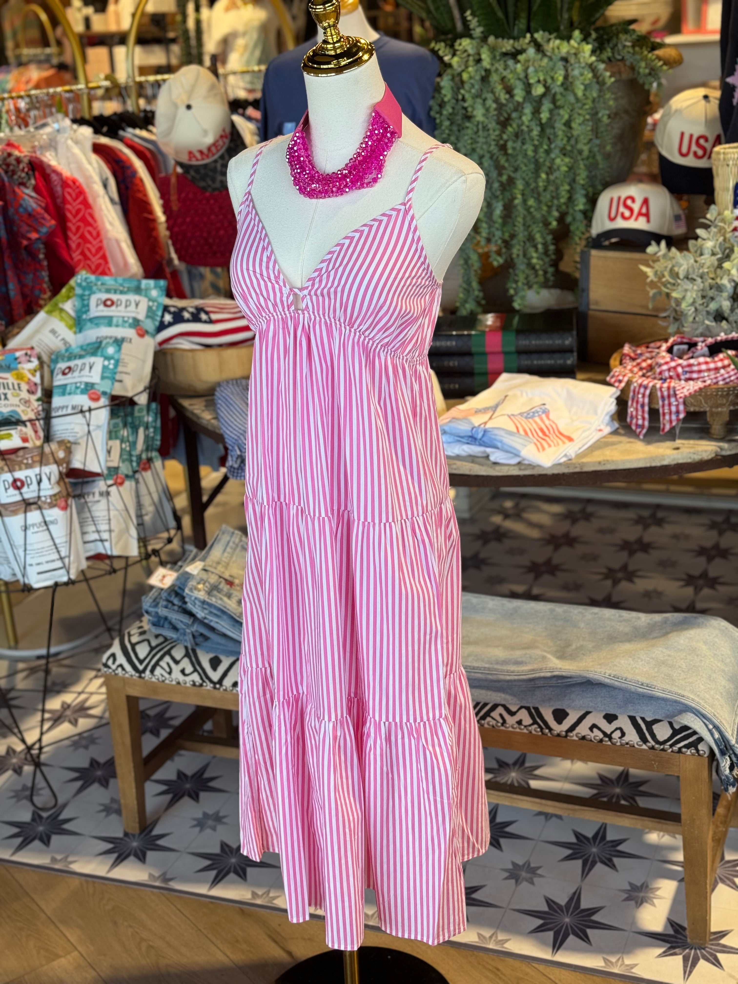 The Darla Stripe Dress is a stylish and comfortable choice for any occasion. Made from 100% cotton, the stripe poplin cami design and tiered midi length provide both breathability and elegant style. Perfect for any season, this dress is a must-have for any fashion-forward wardrobe.