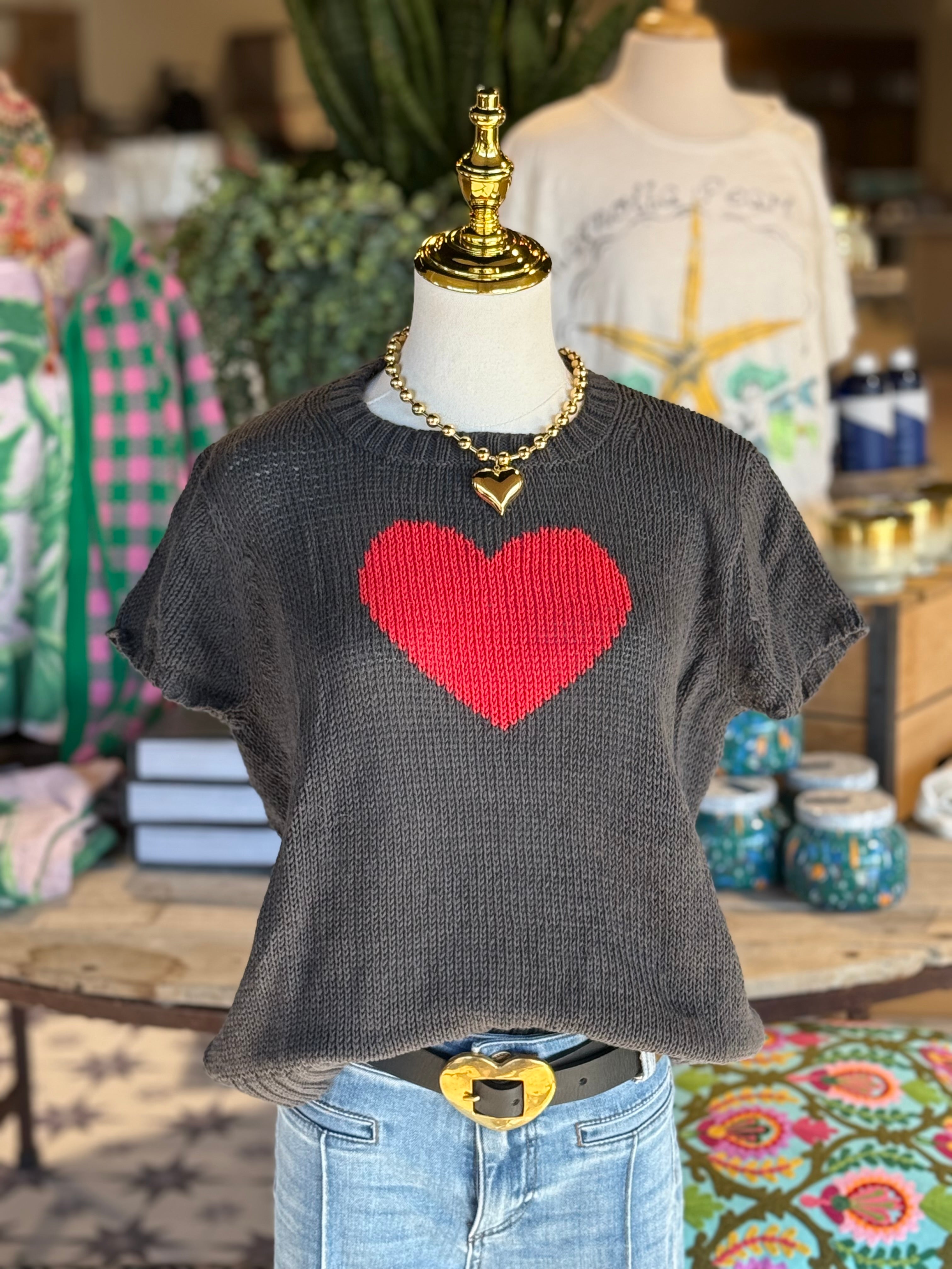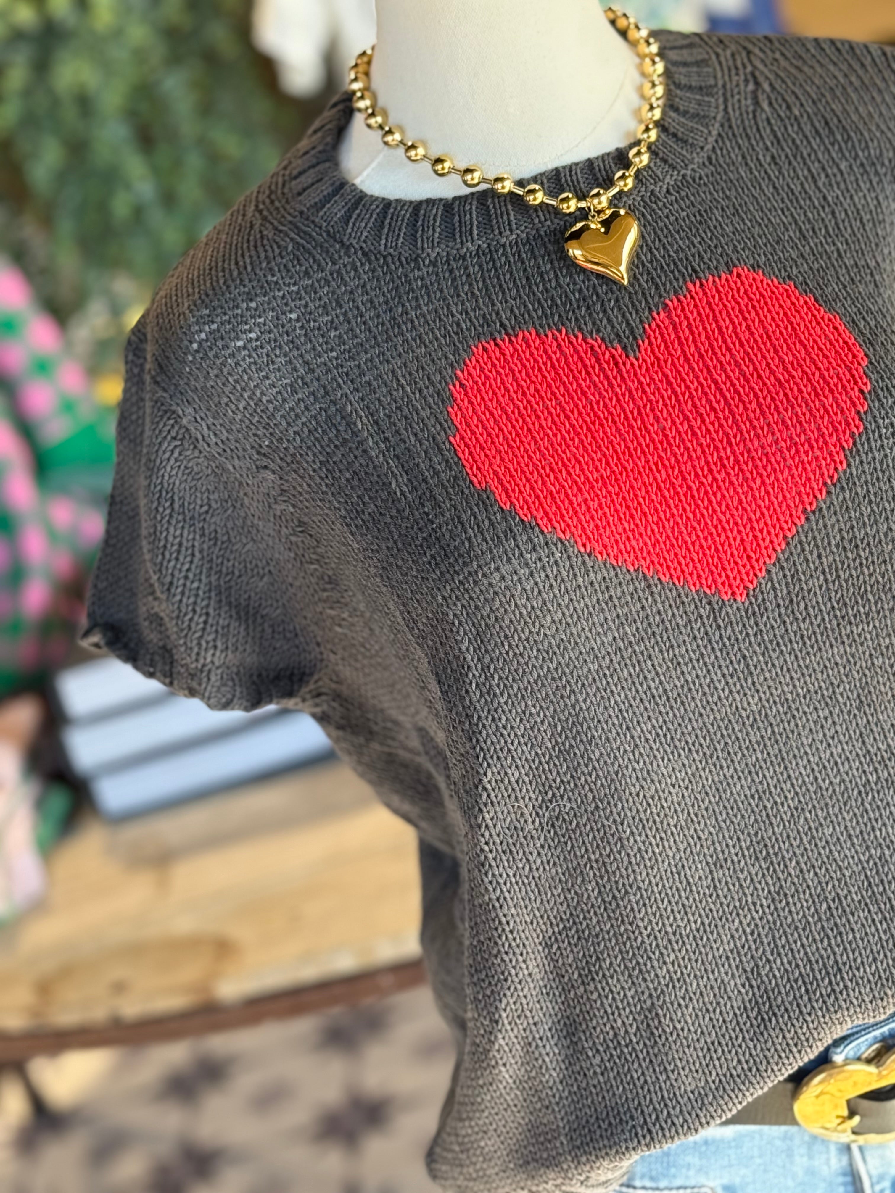 Short sleeve lightweight grey sweater with red hearts. Premium quality. Runs slightly roomy.