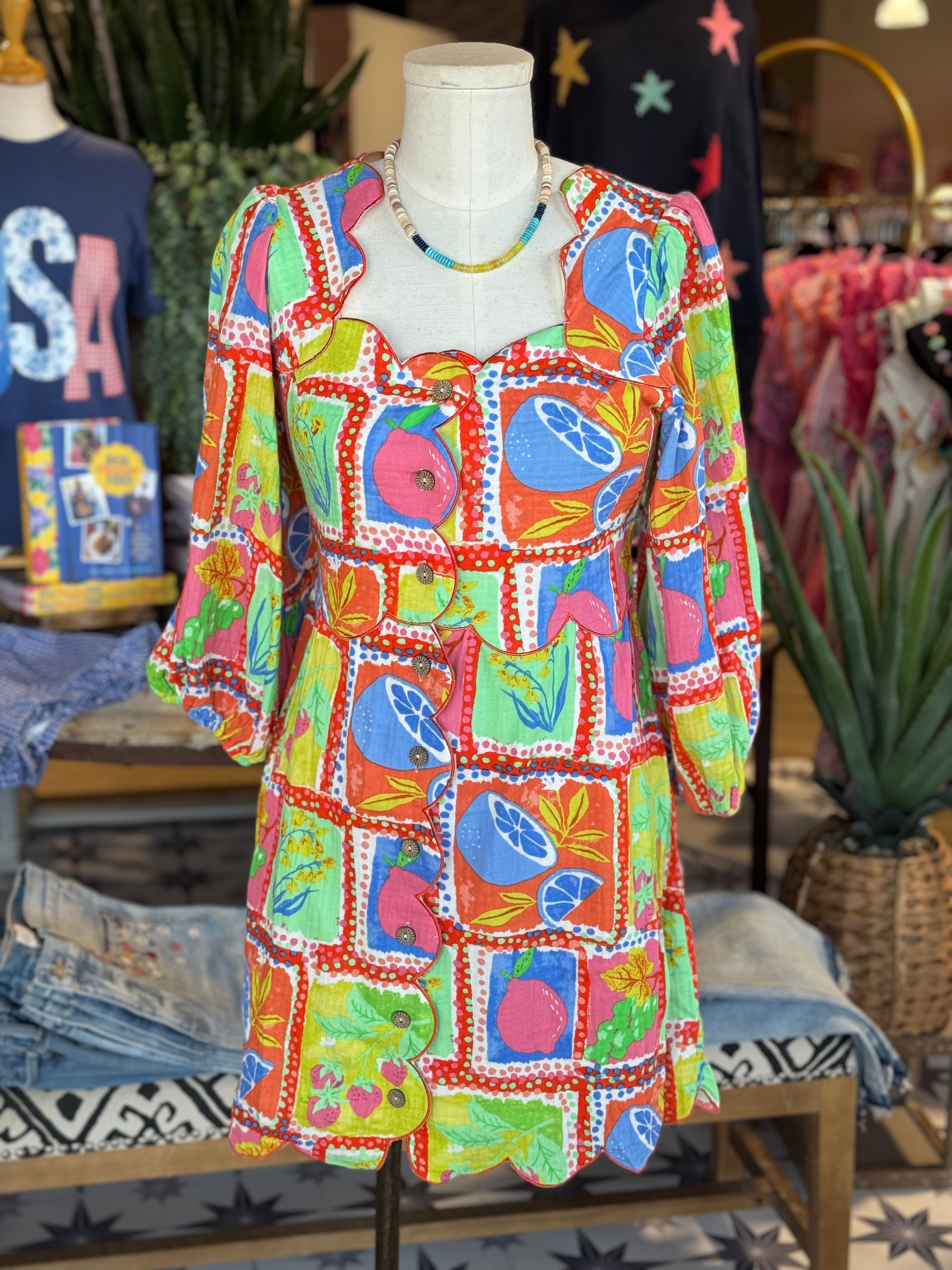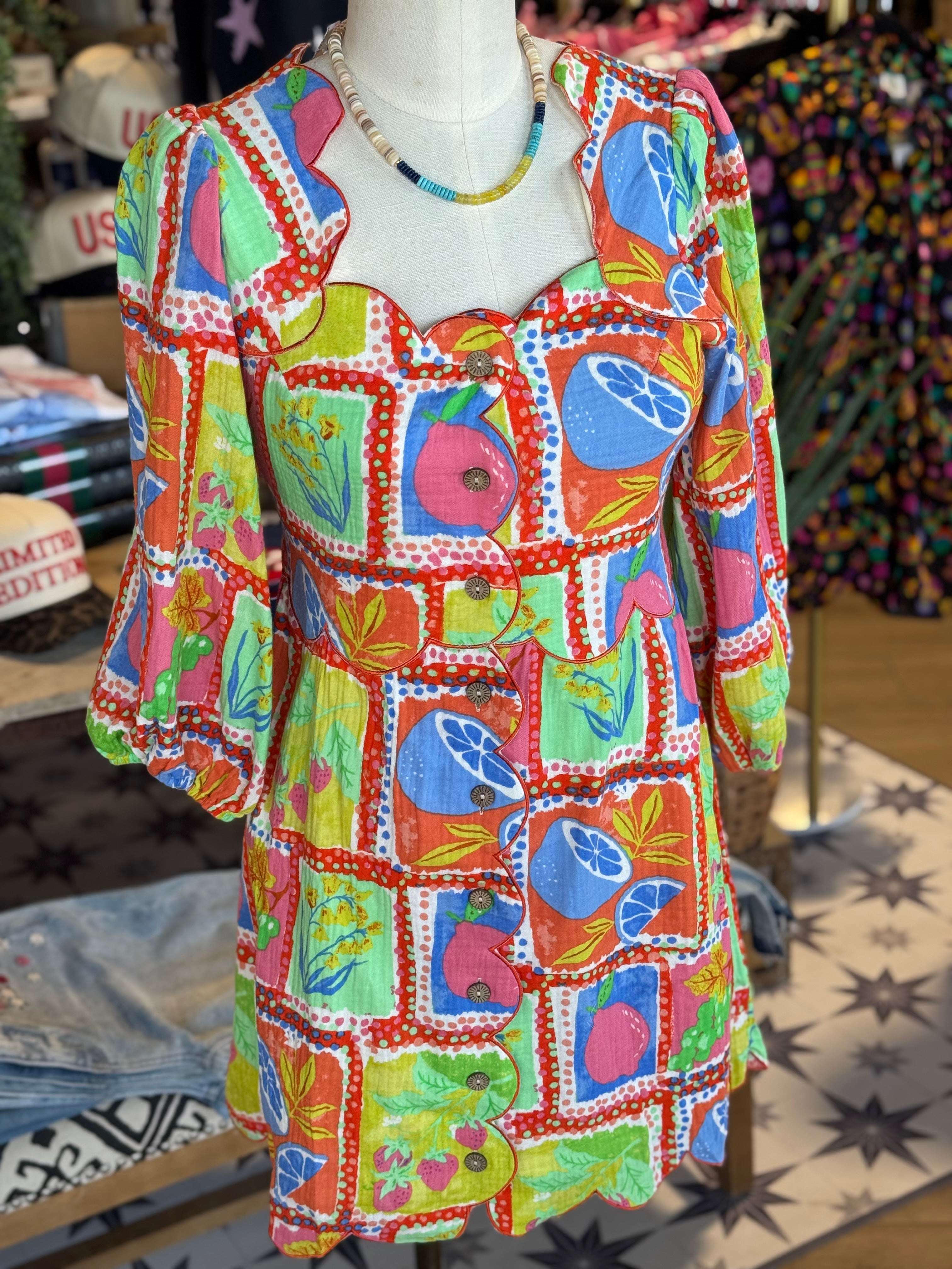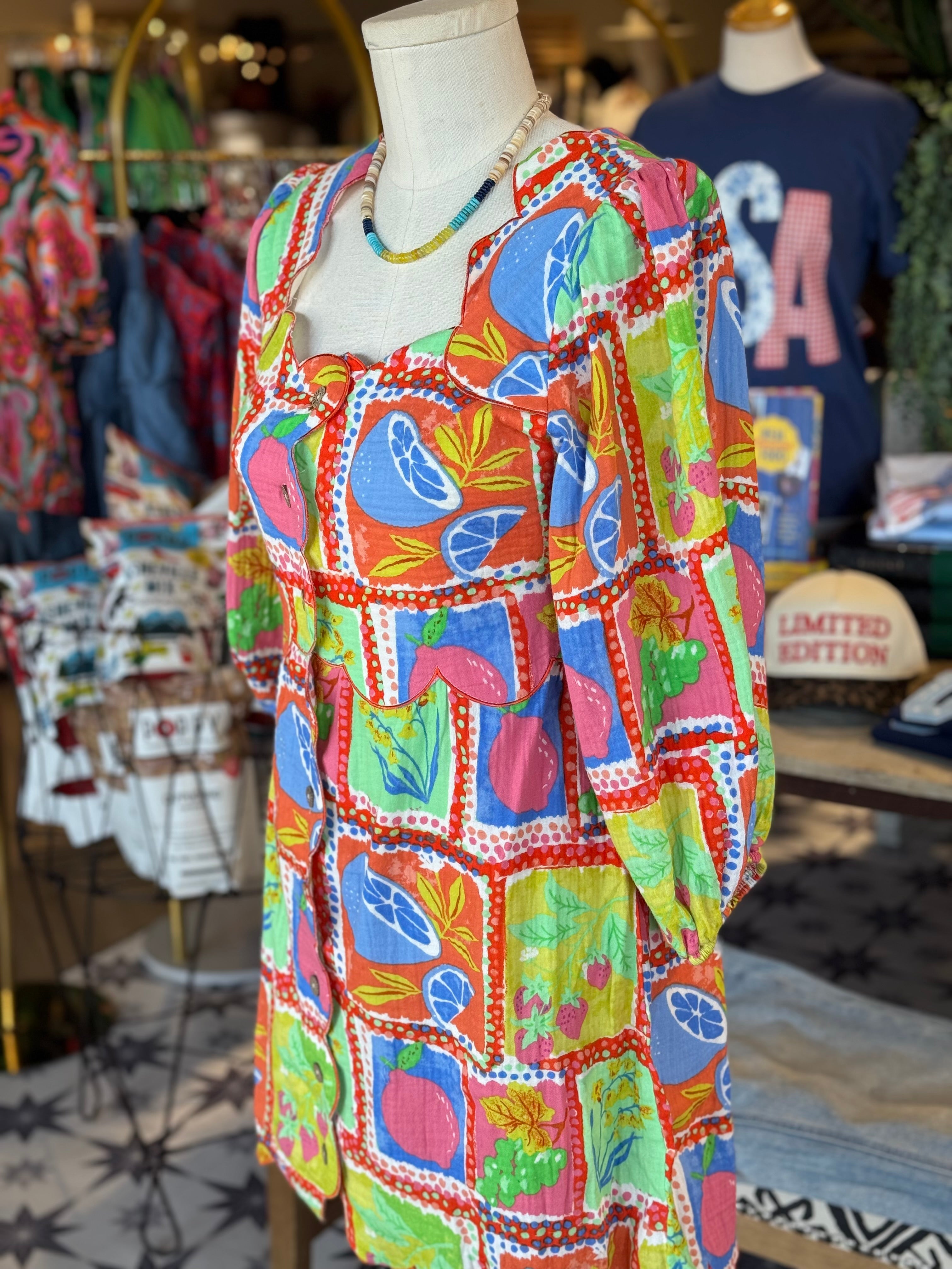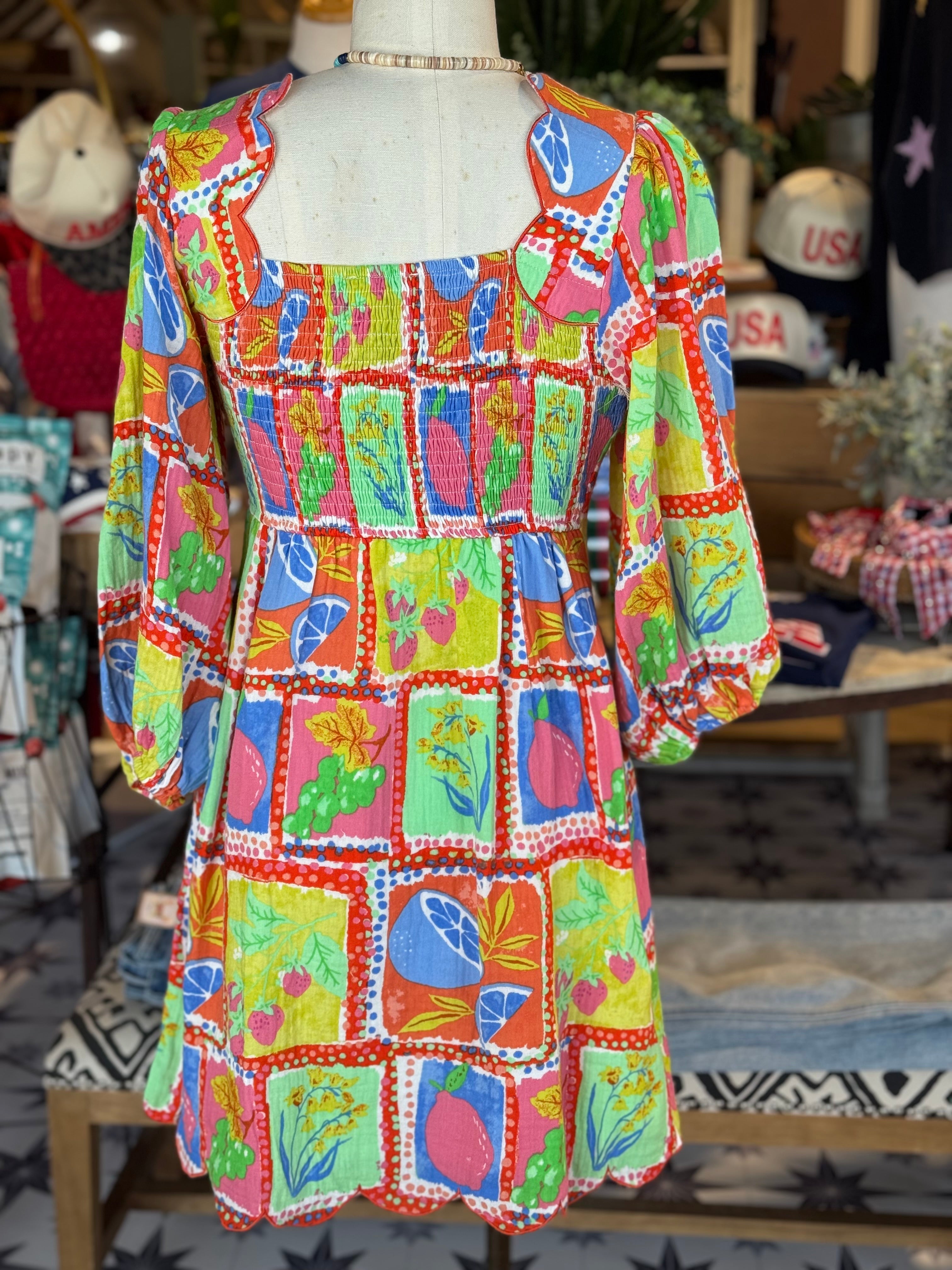 Introducing the Fruity Pebbles Dress. Made with a fruity smocked design, this dress is not only super flattering but also ultra-comfortable. Perfect for any occasion, it's a must-have addition to your wardrobe. Experience the unique blend of style and comfort with this dress. Cotton lined