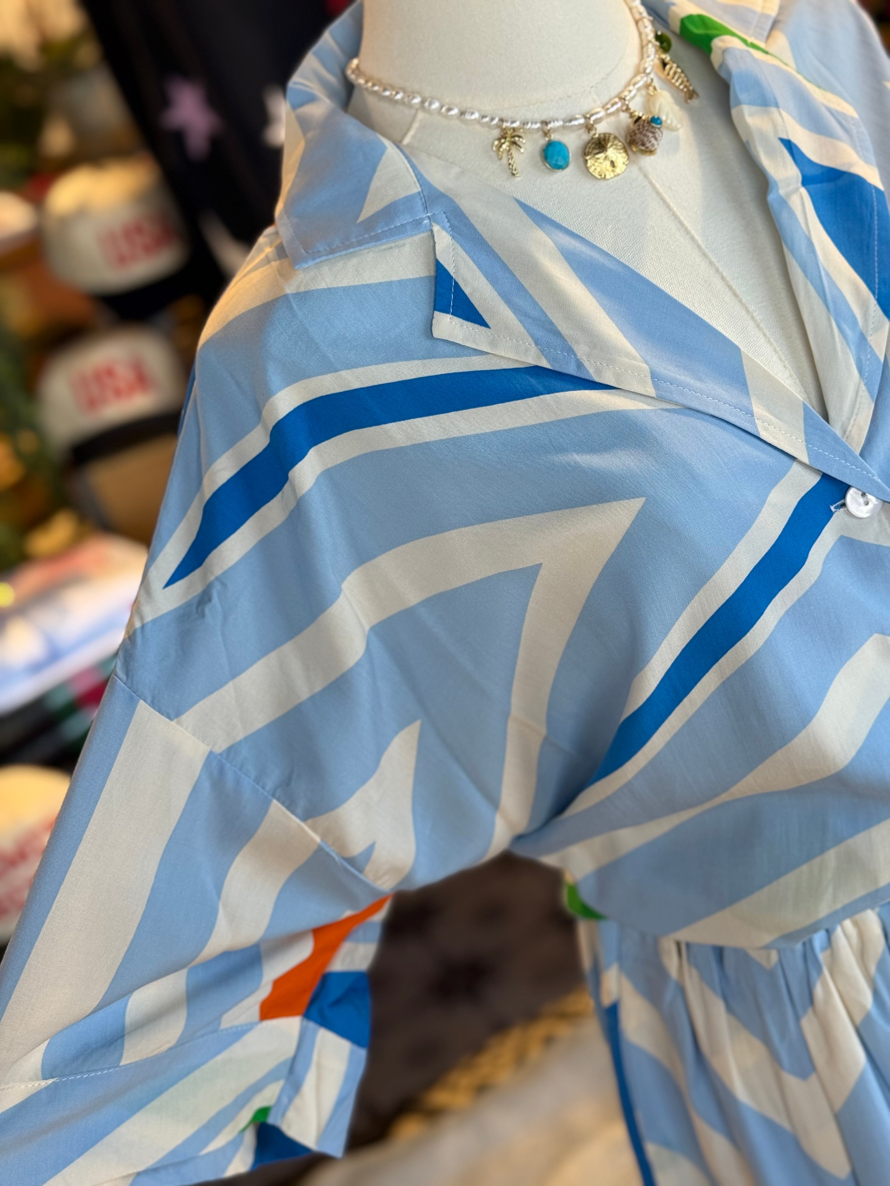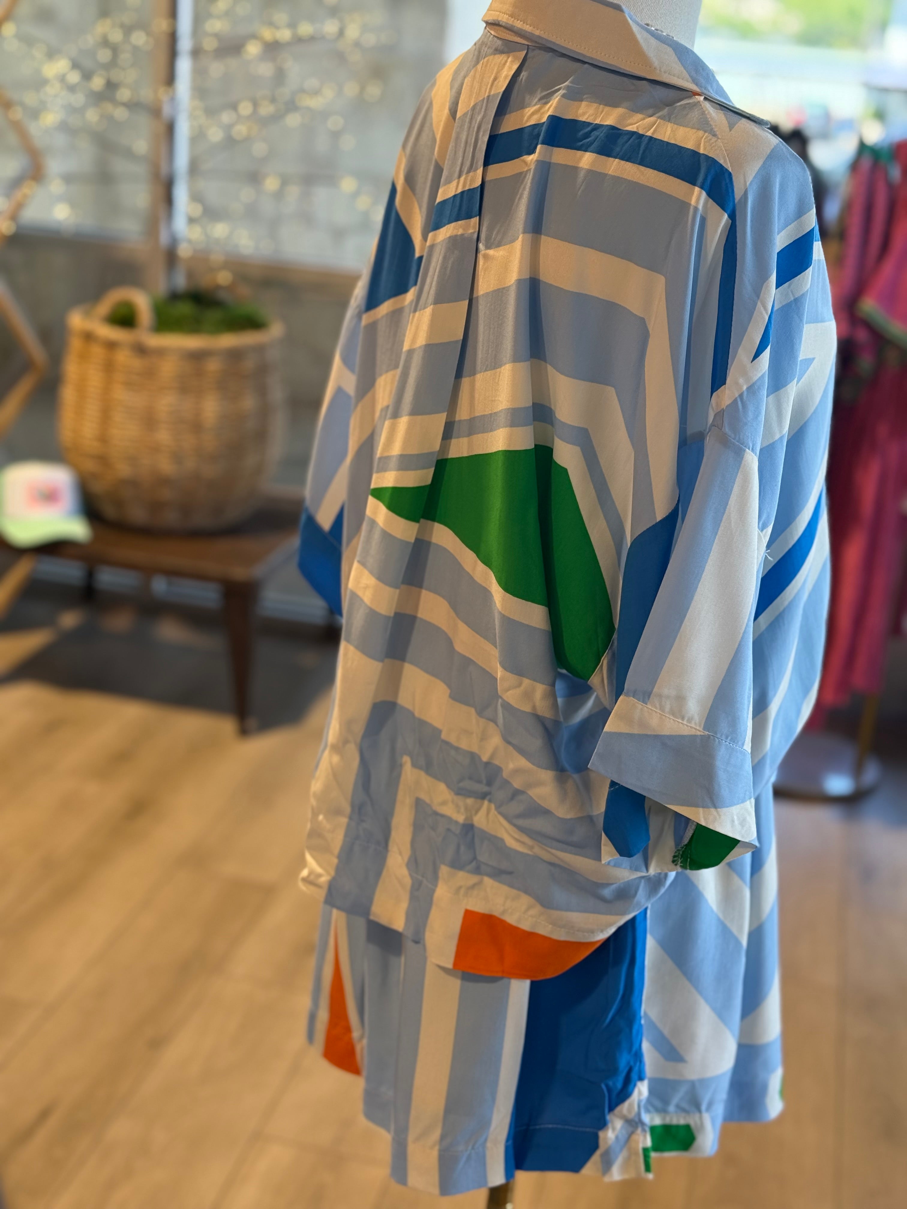 Stand out in this Geo Short Set! Featuring a playful geometric pattern in cool blue tones with a touch of vibrant orange. The button-up collared rayon top adds a touch of sophistication, while the pull-on elastic tie shorts keep it effortlessly comfortable. (Shorts and top sold separately.) Rayon