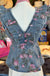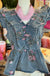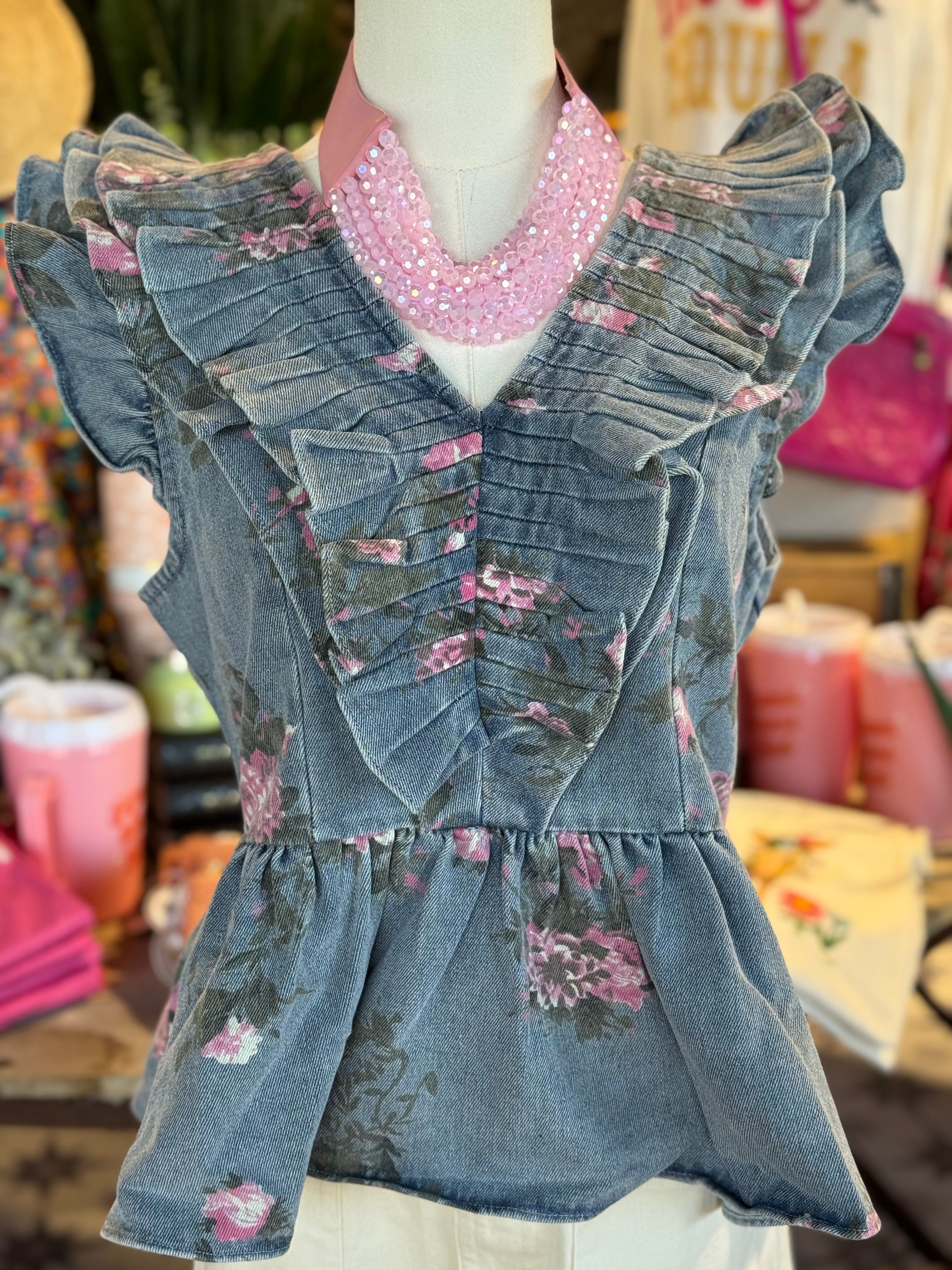 Adorable denim peplum top with pink floral accents. Stretchy. Cotton