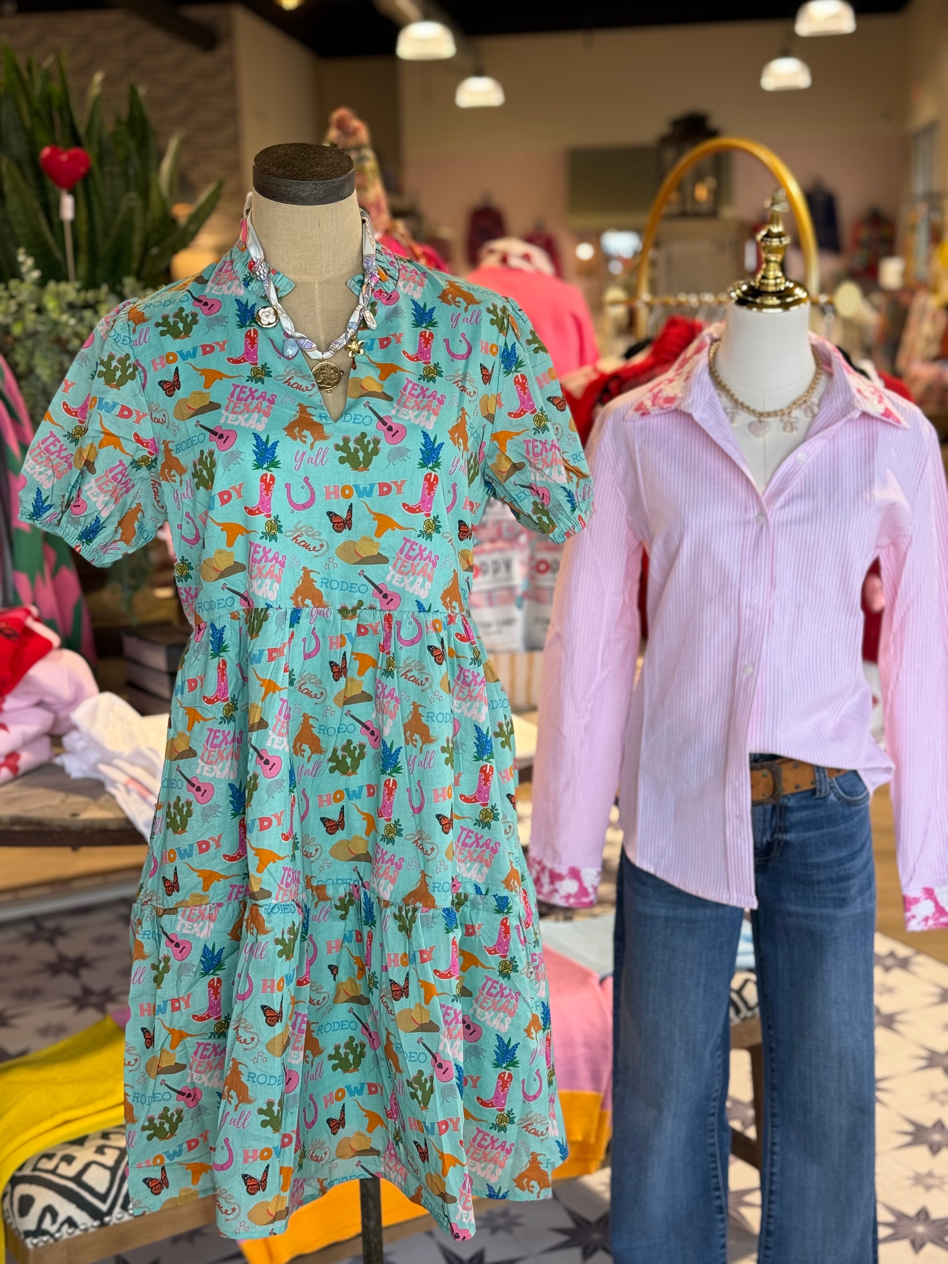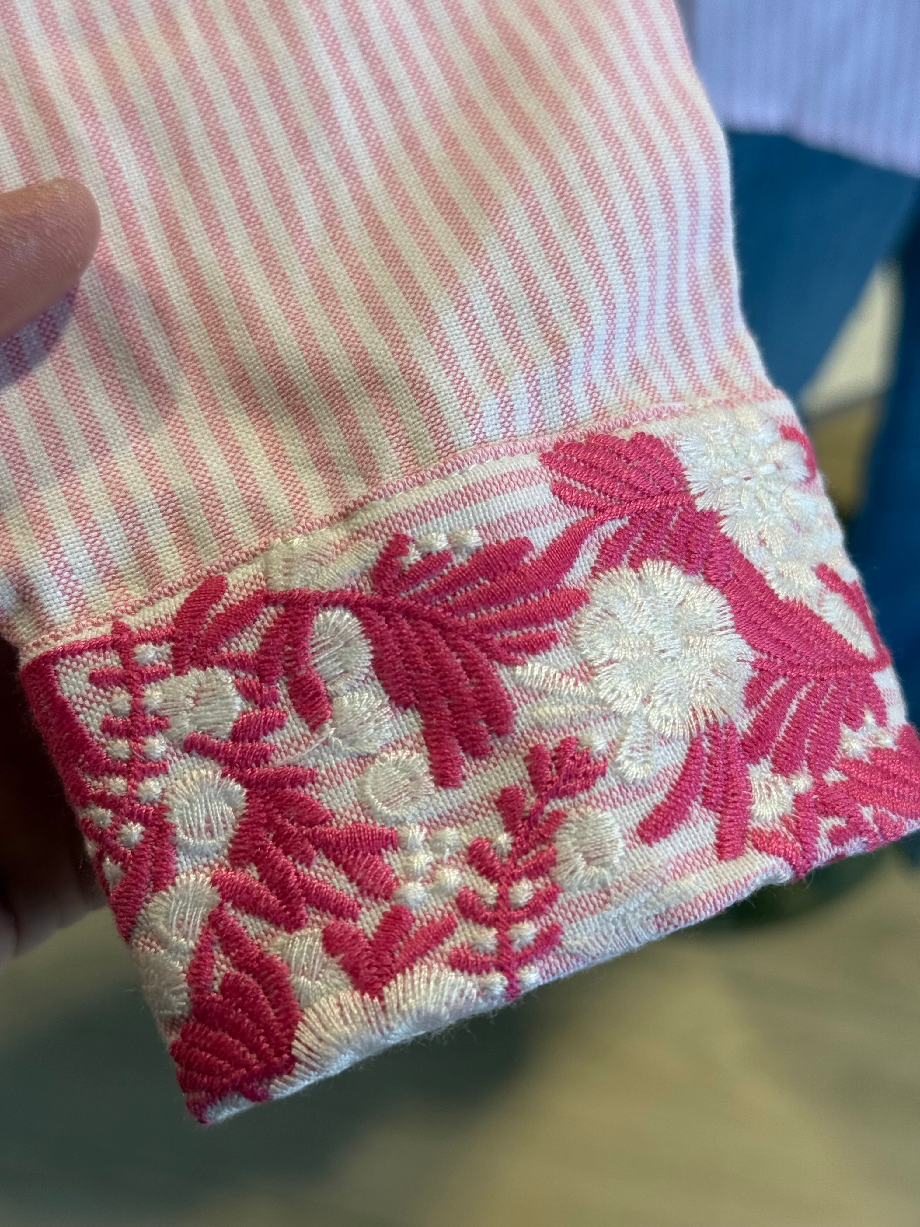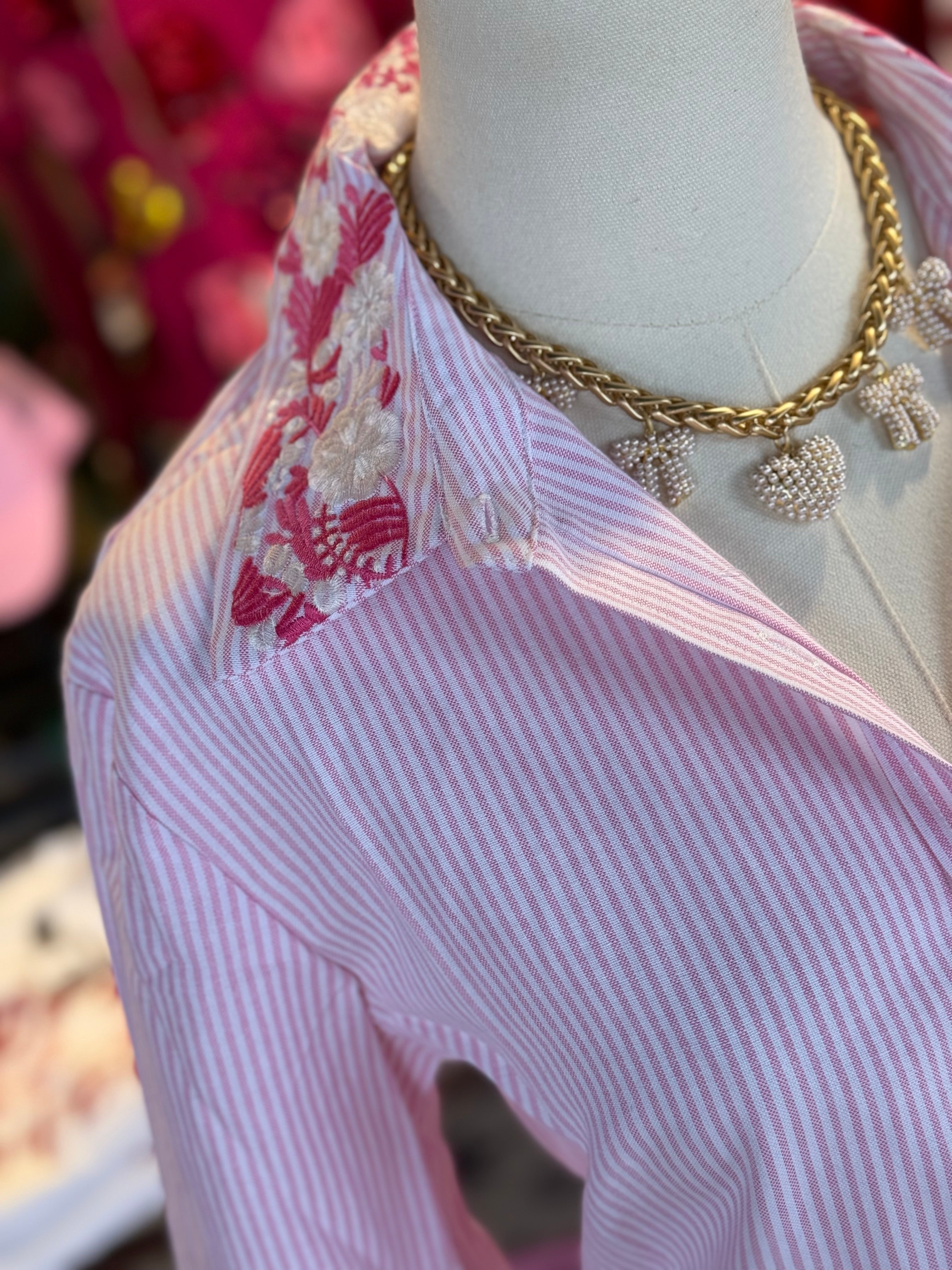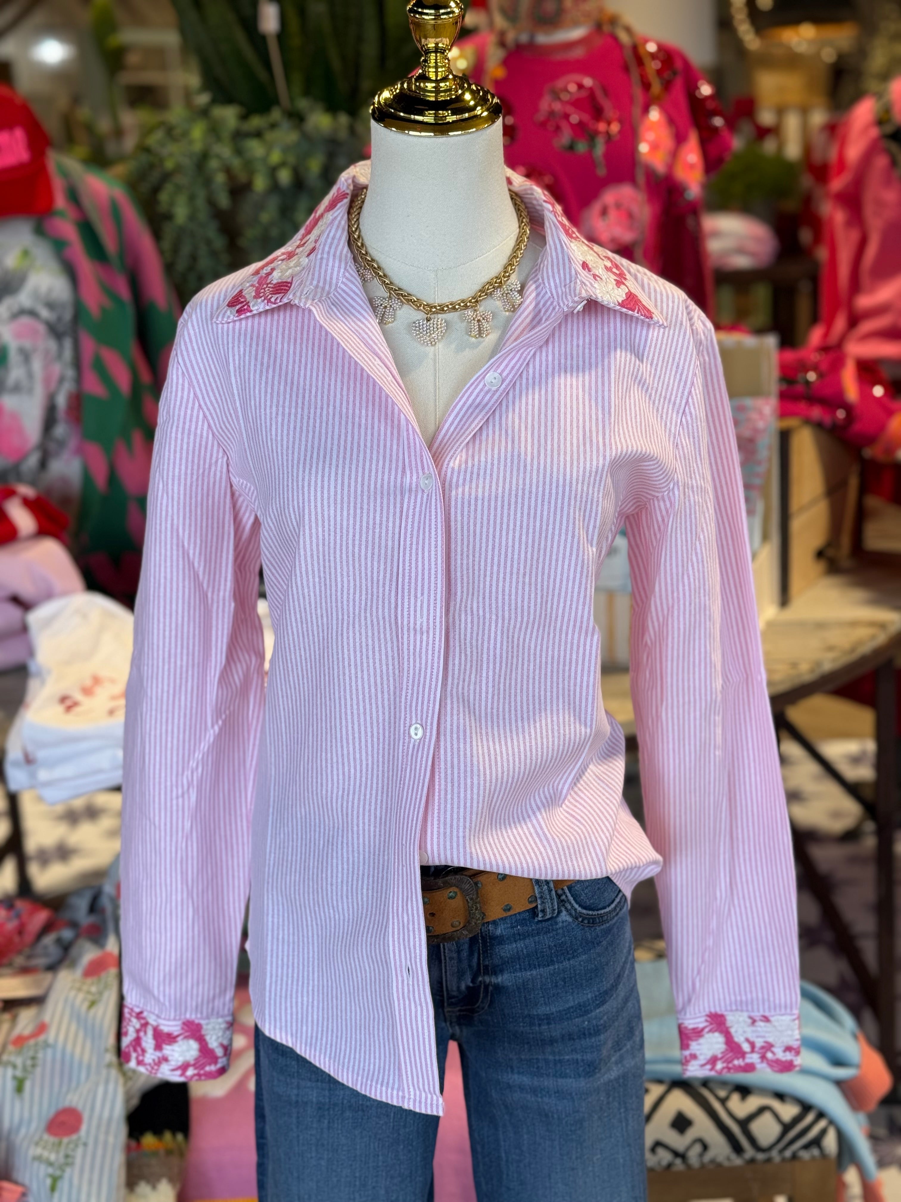Pink and white stripe button up with embroidery detailing. Runs true.