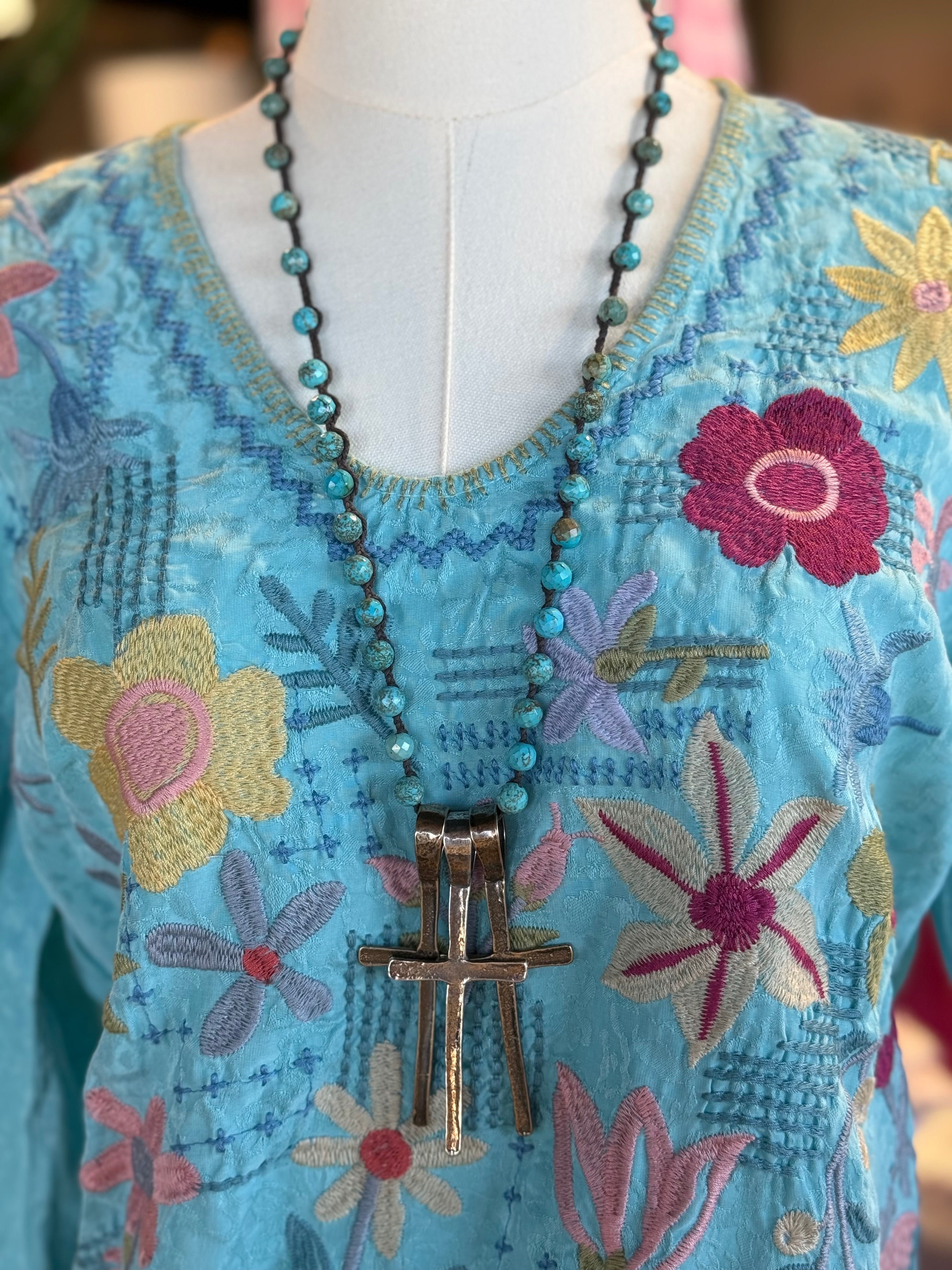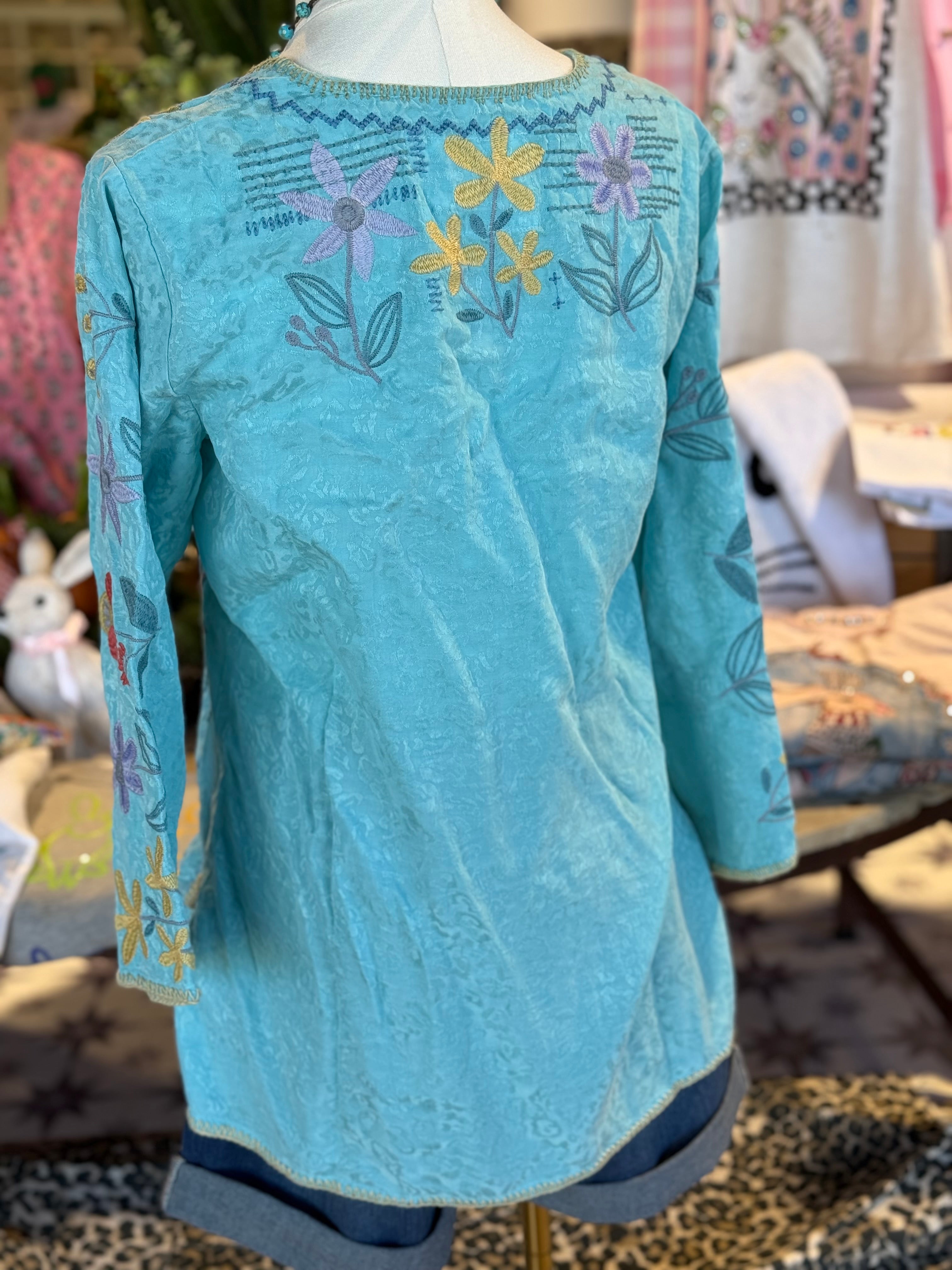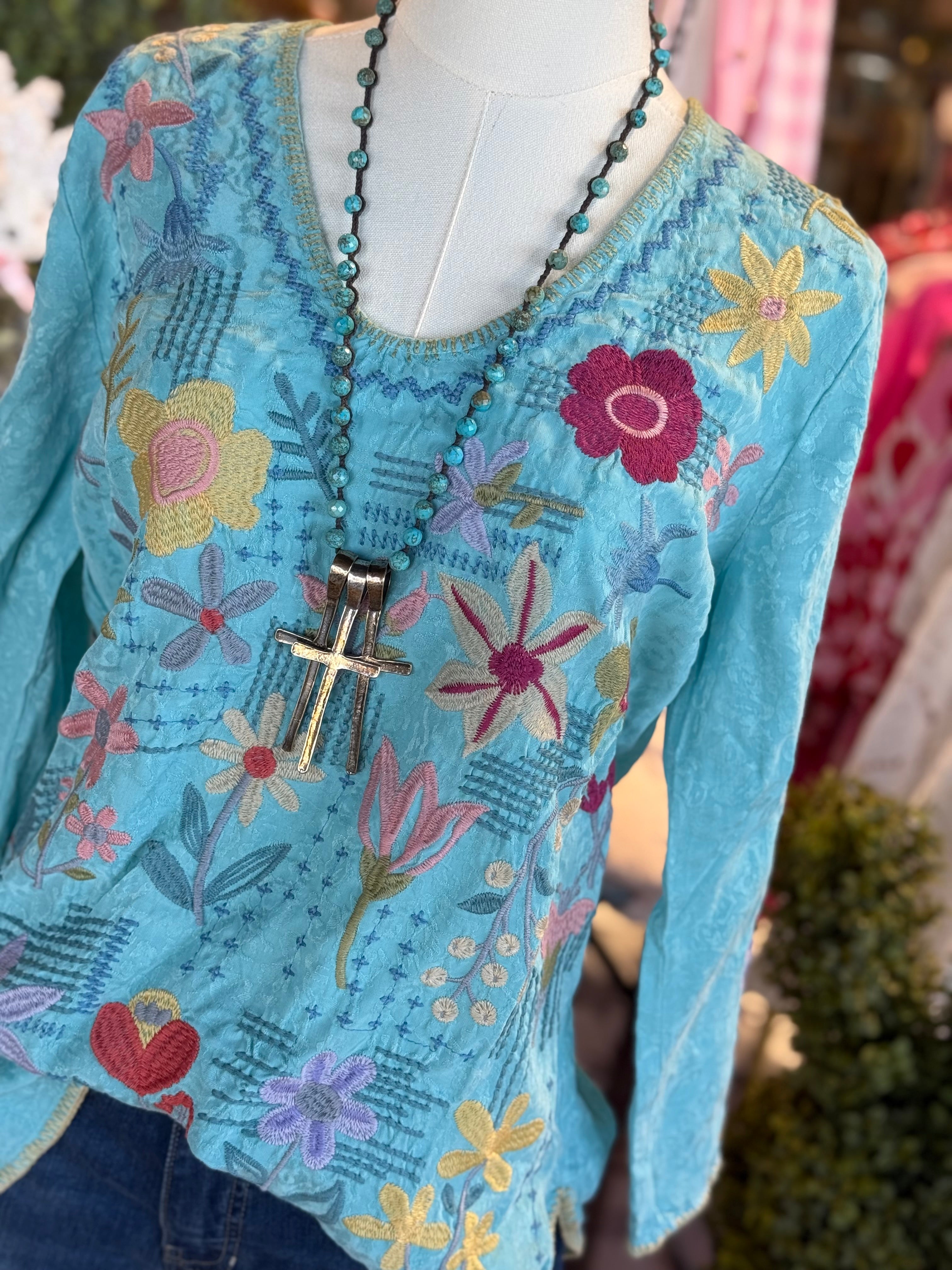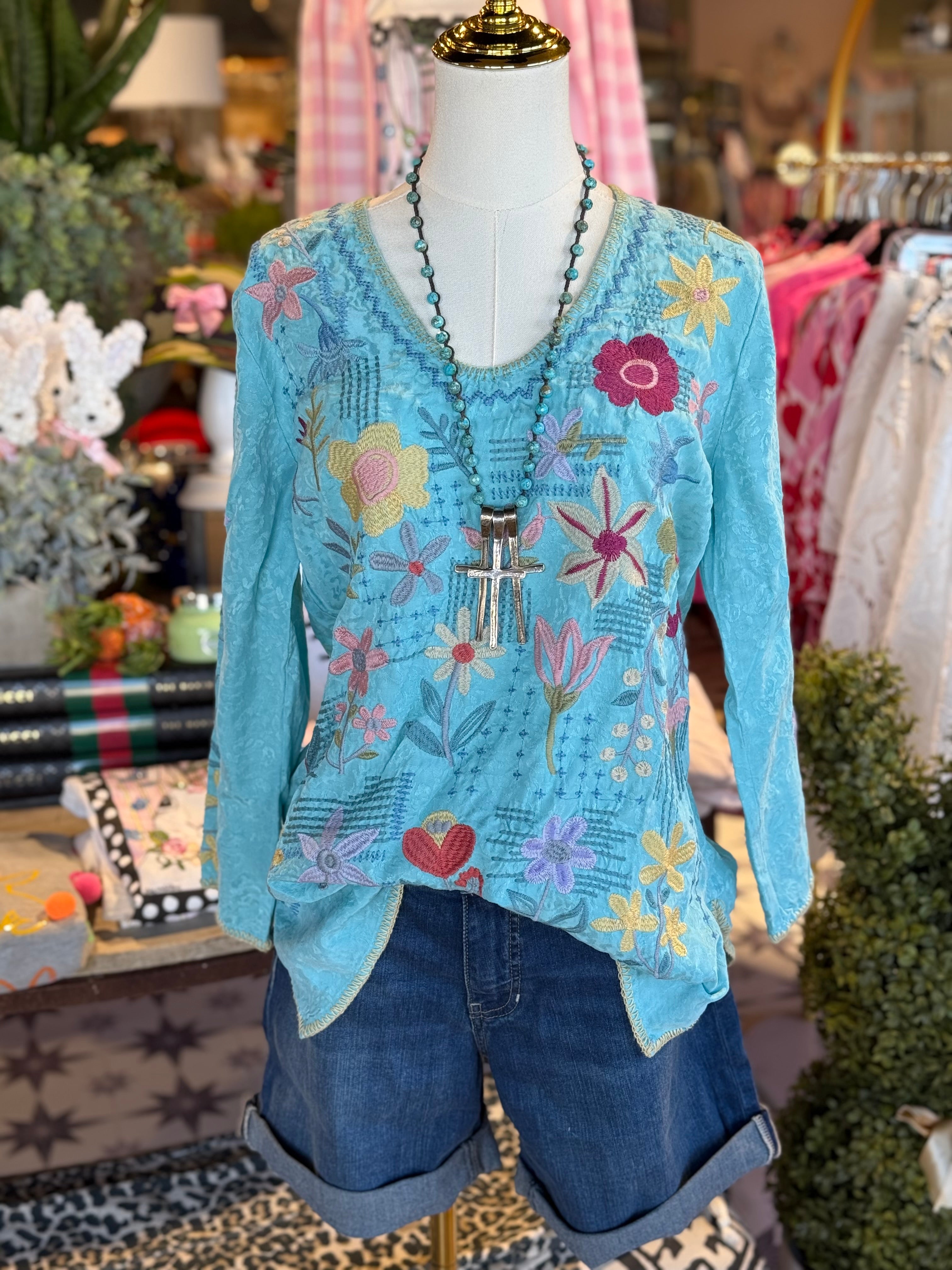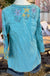 Piercing blue Cupra/tencel blend blouse with embroidery detailing. Stunning!