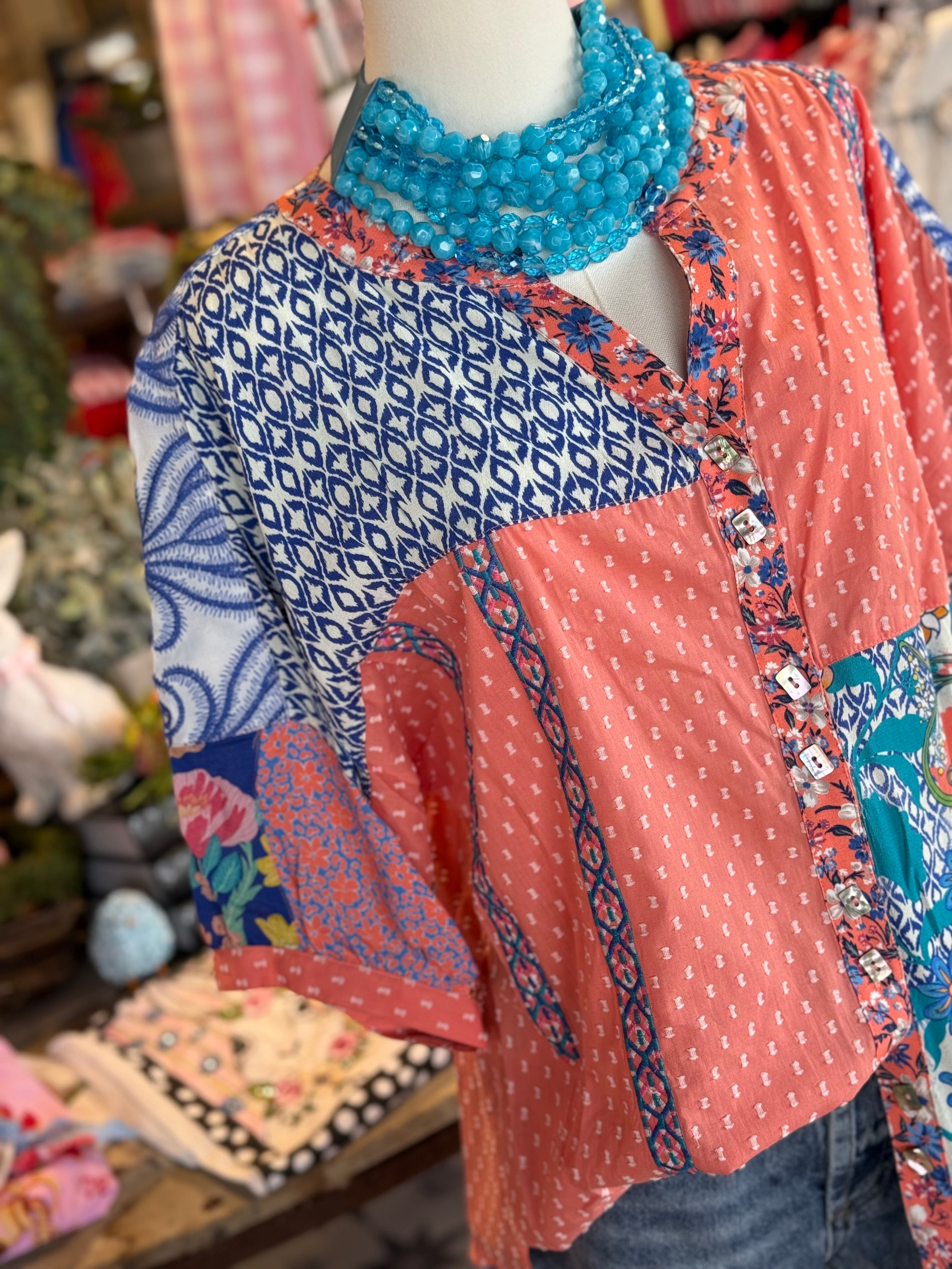 Mixed floral coral and blue print with embroidery detailing. Roomy fit. Would size down.