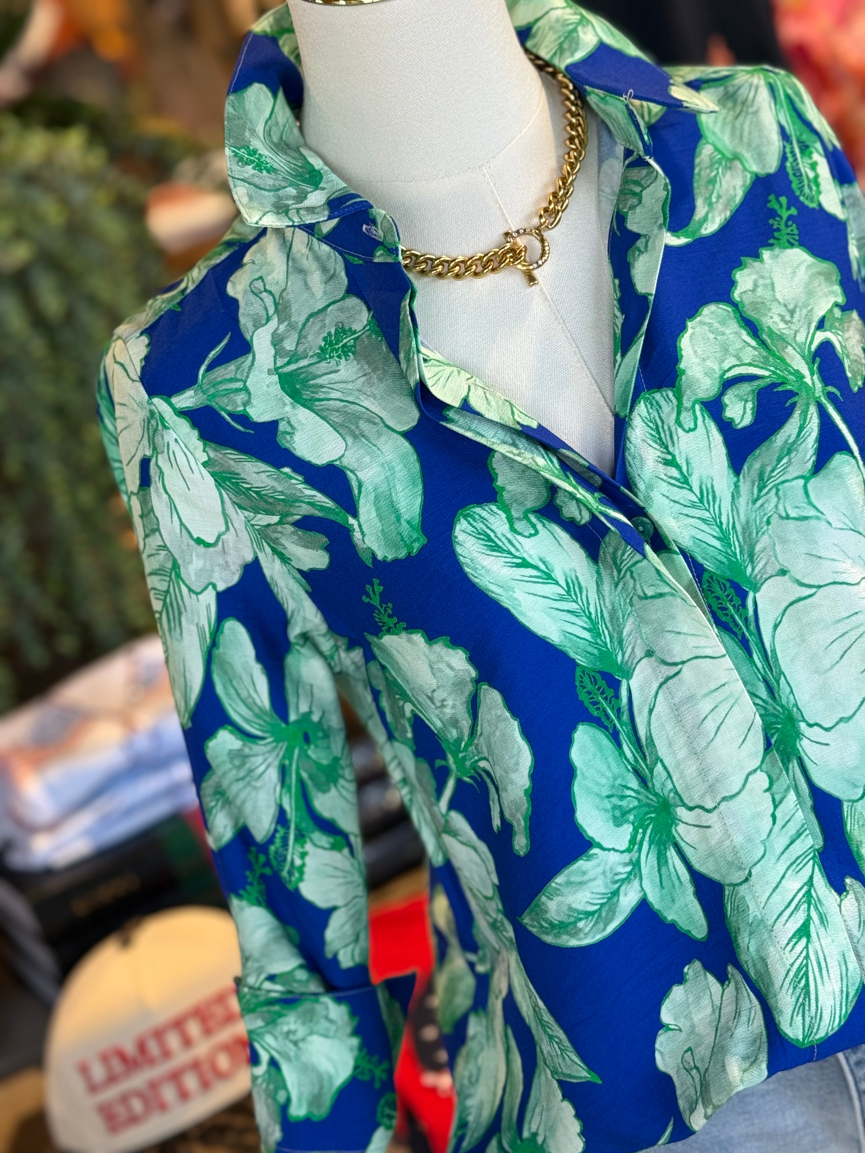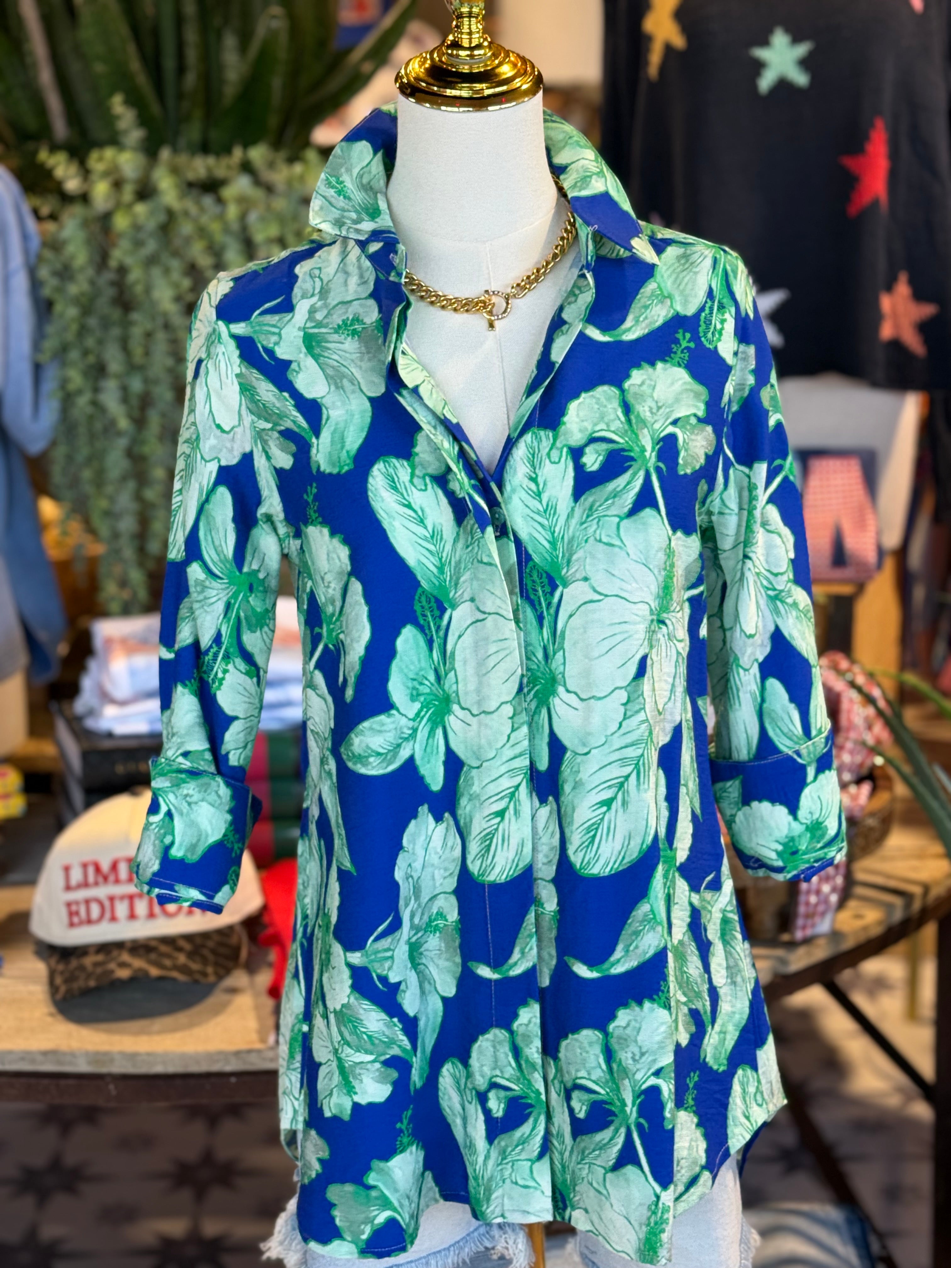 Embrace the island vibes in our top featuring a blue and green floral print. With hidden button-up detailing and 3/4 length sleeves, this top combines tropical flair with versatility. Perfect for any occasion, from beach days to weekend brunches. Get ready to feel the Island Vibes!