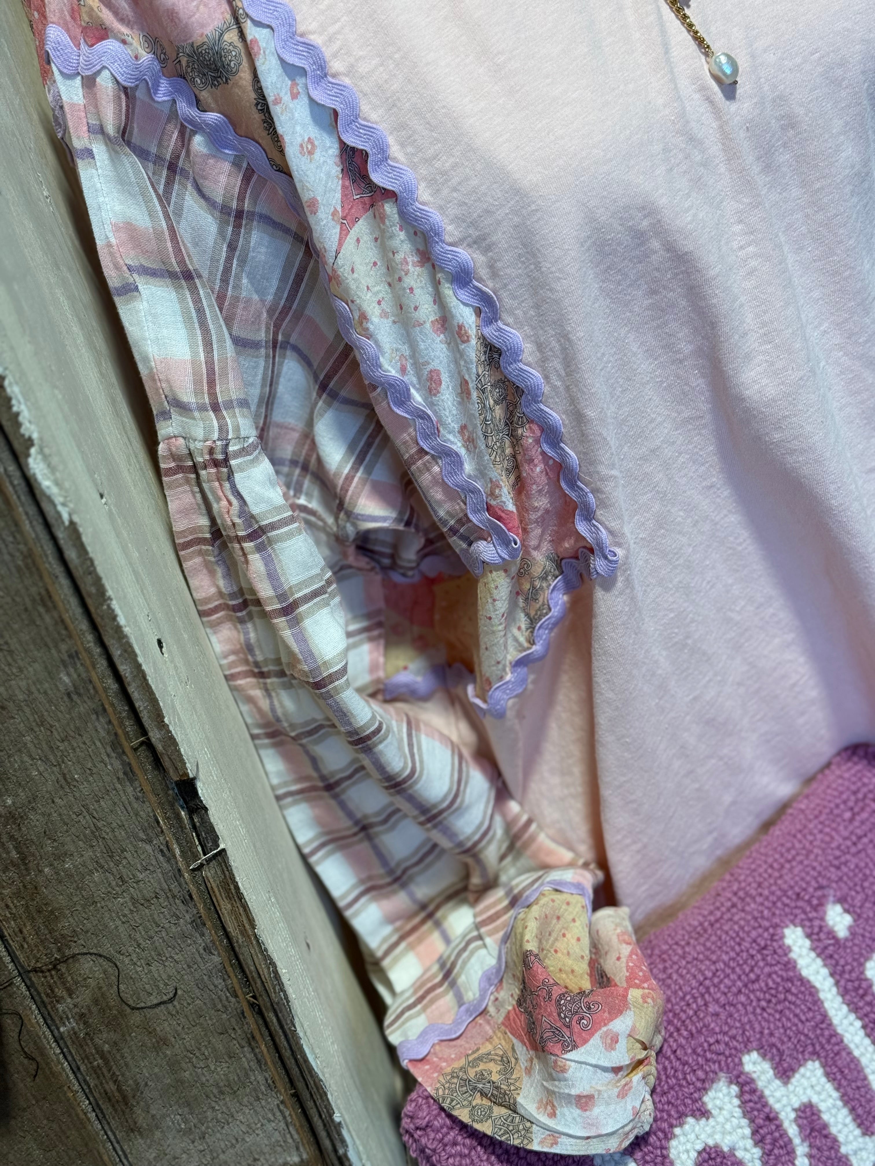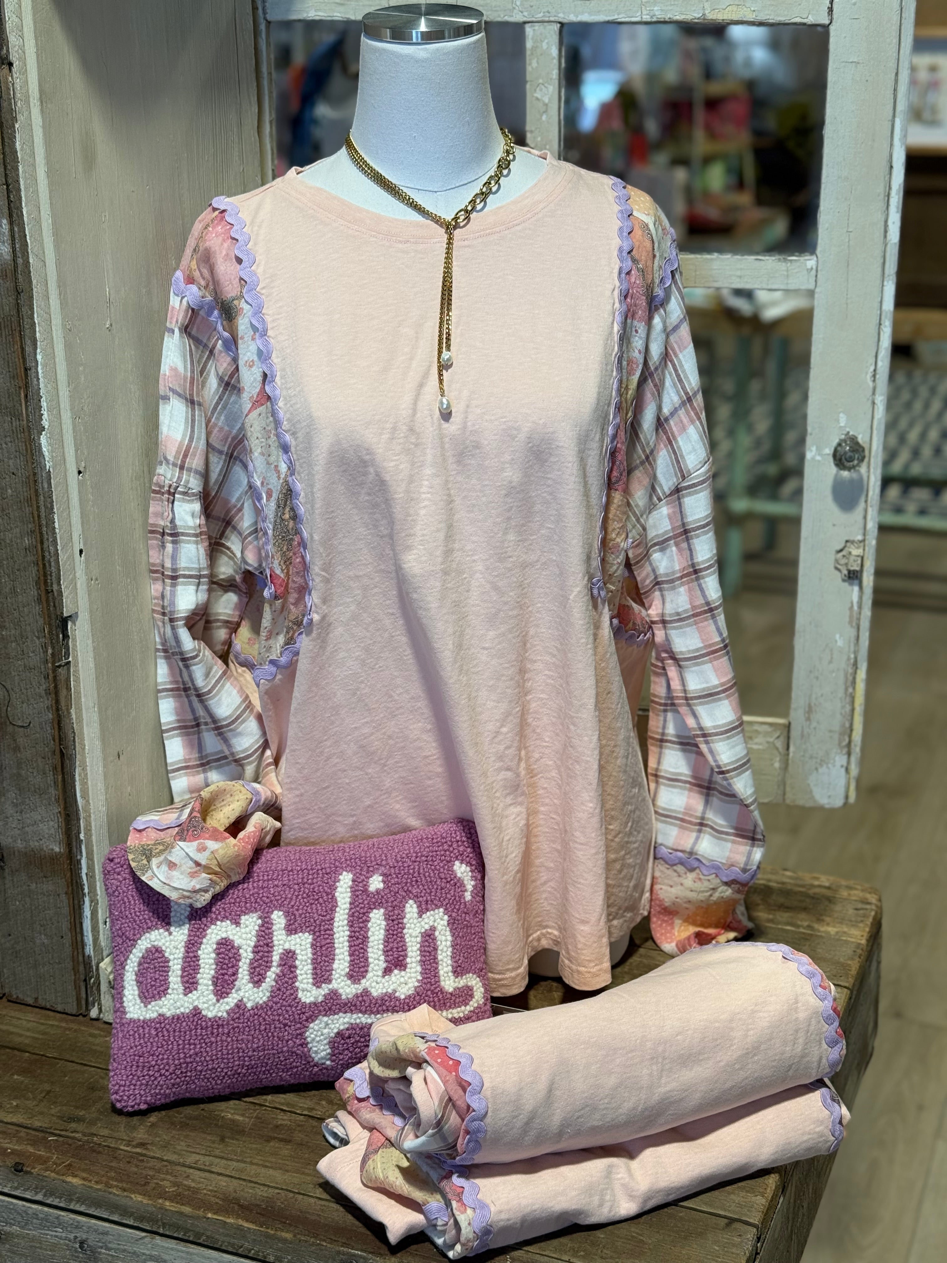 Cotton peach top with mixed fabric sleeves. Light weight.