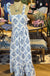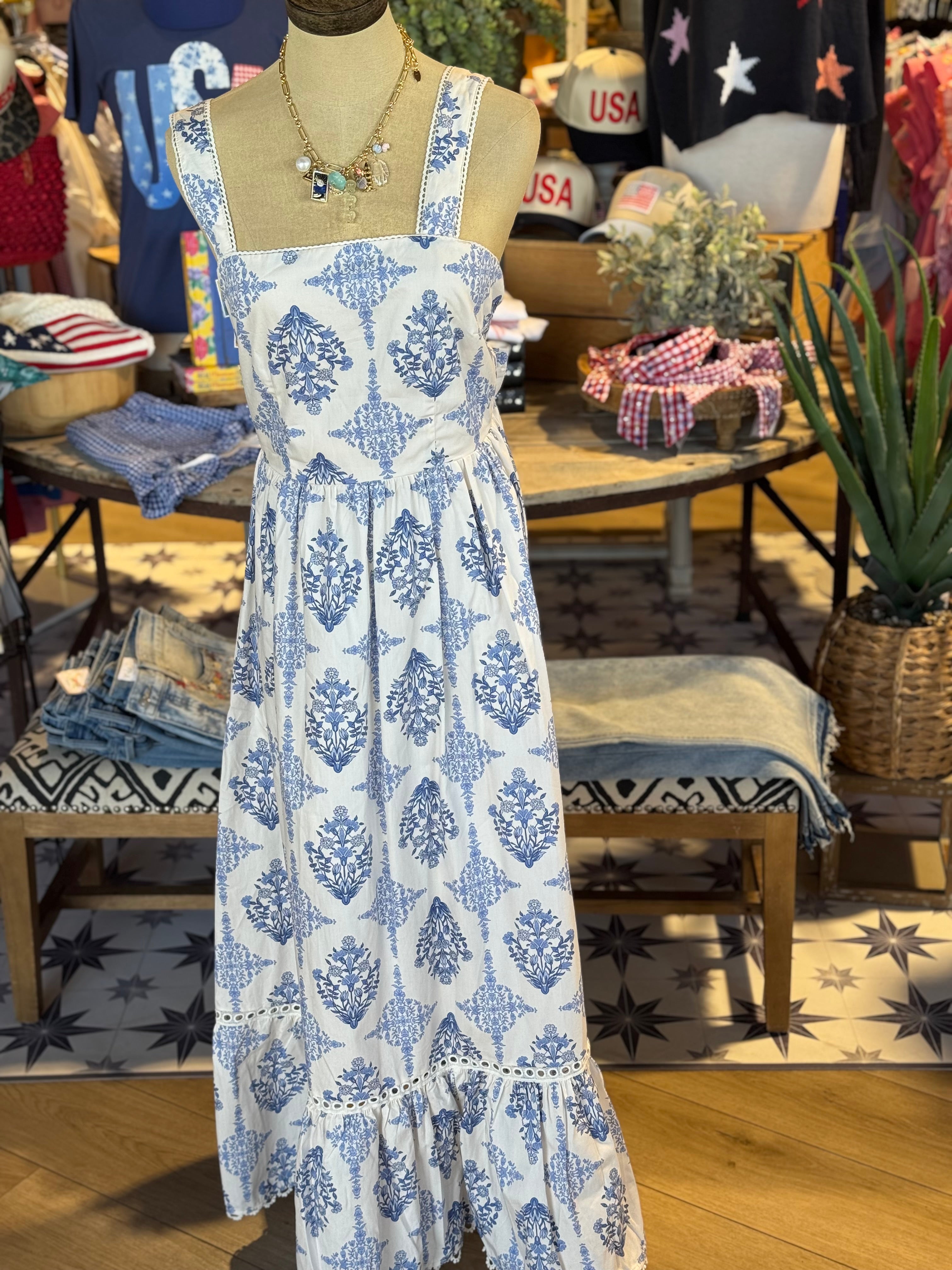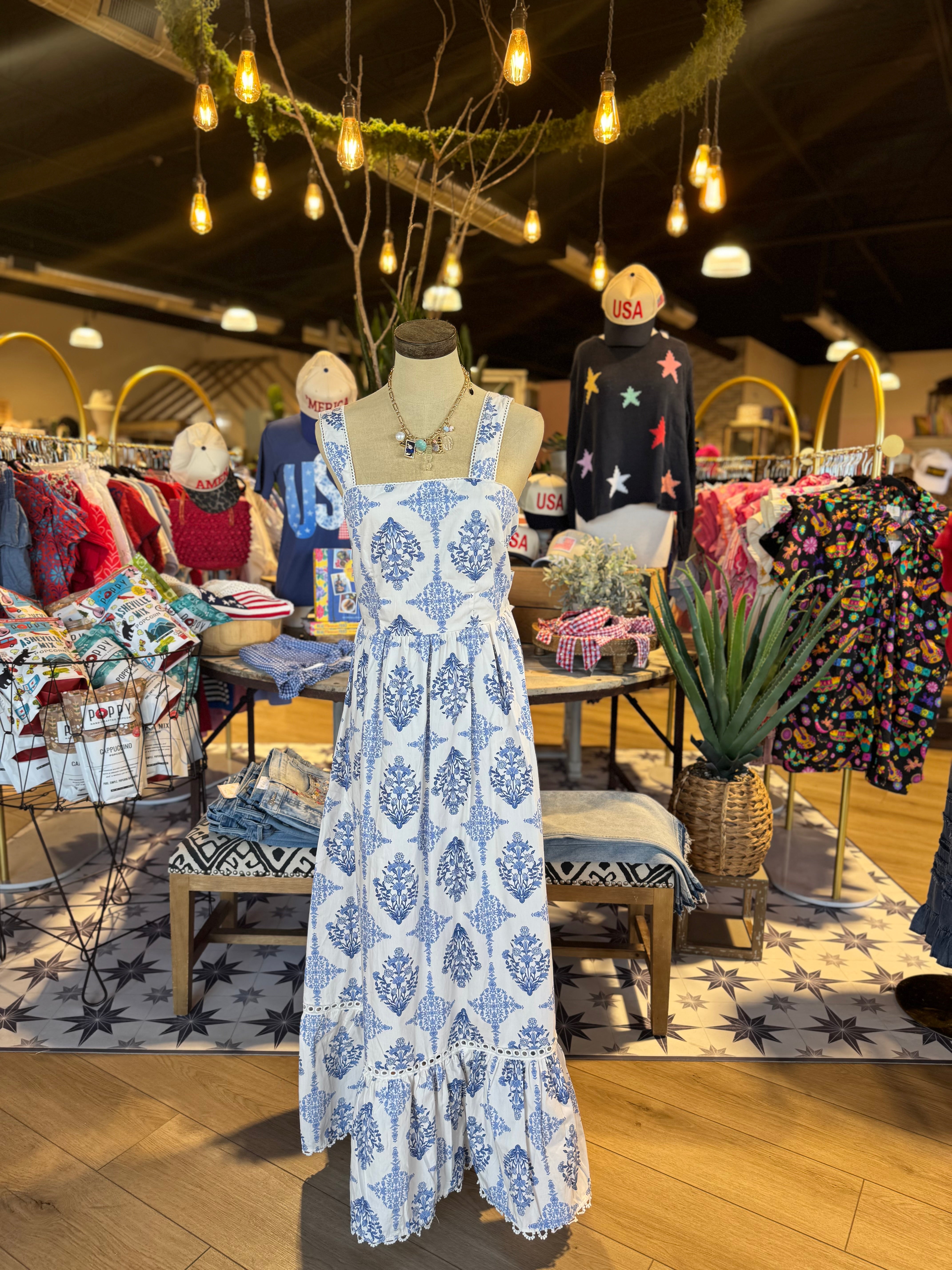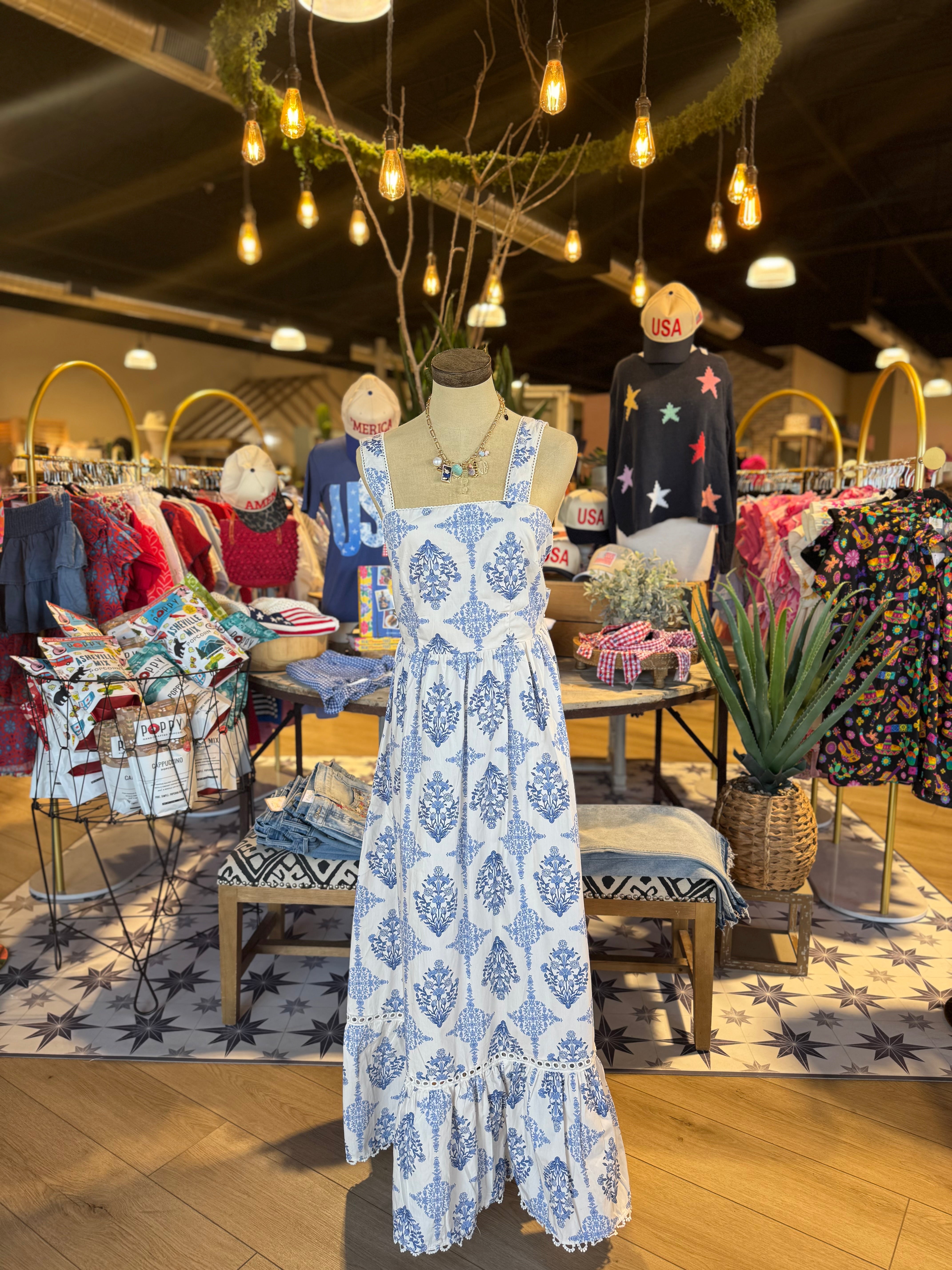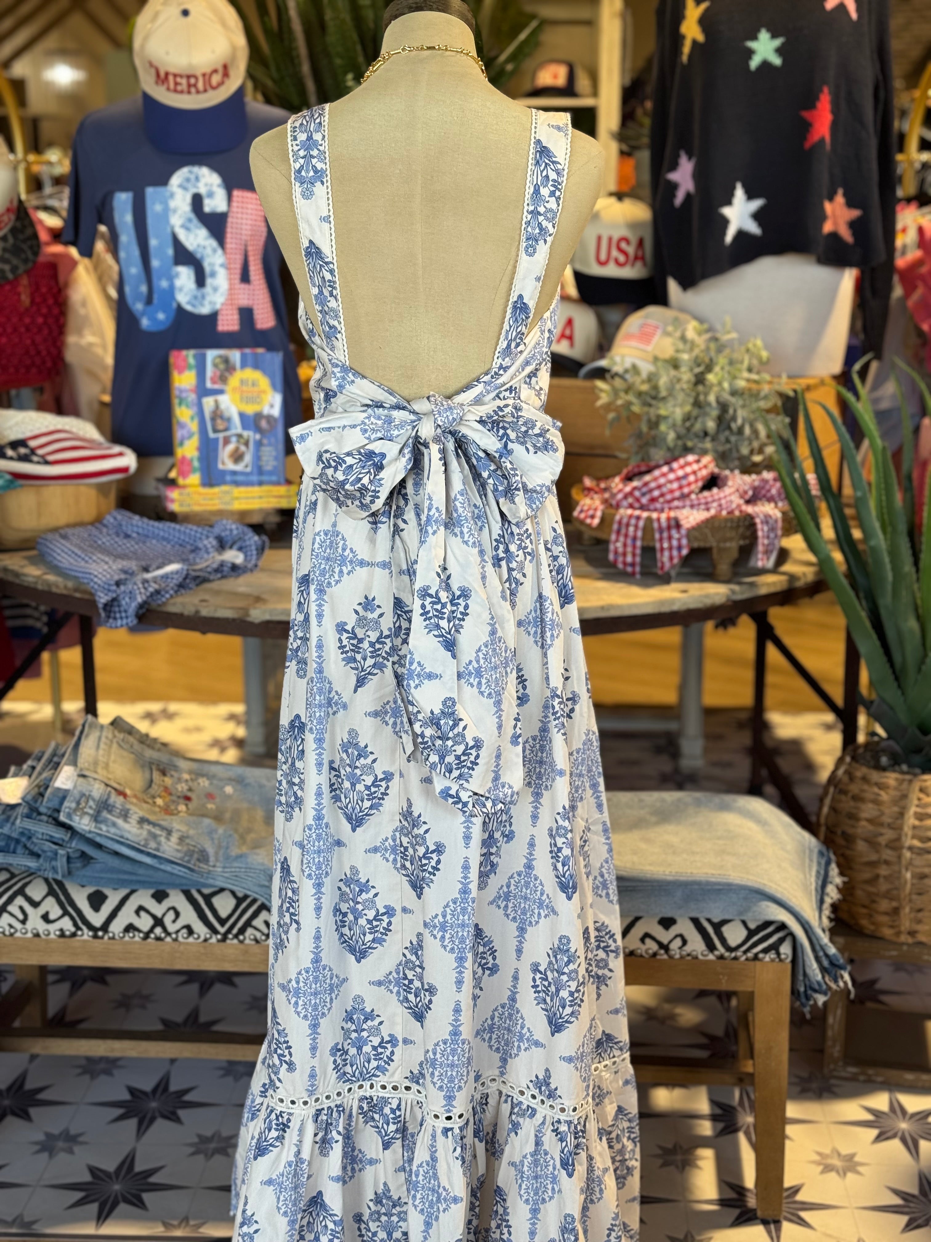 This Kaitlyn Ann Dress is the perfect addition to your summer wardrobe. Its stunning blue and white print will make you stand out, while the bow detail in the back adds a touch of elegance. Its maxi length provides both style and comfort. Perfect for any summer occasion. Cotton lined