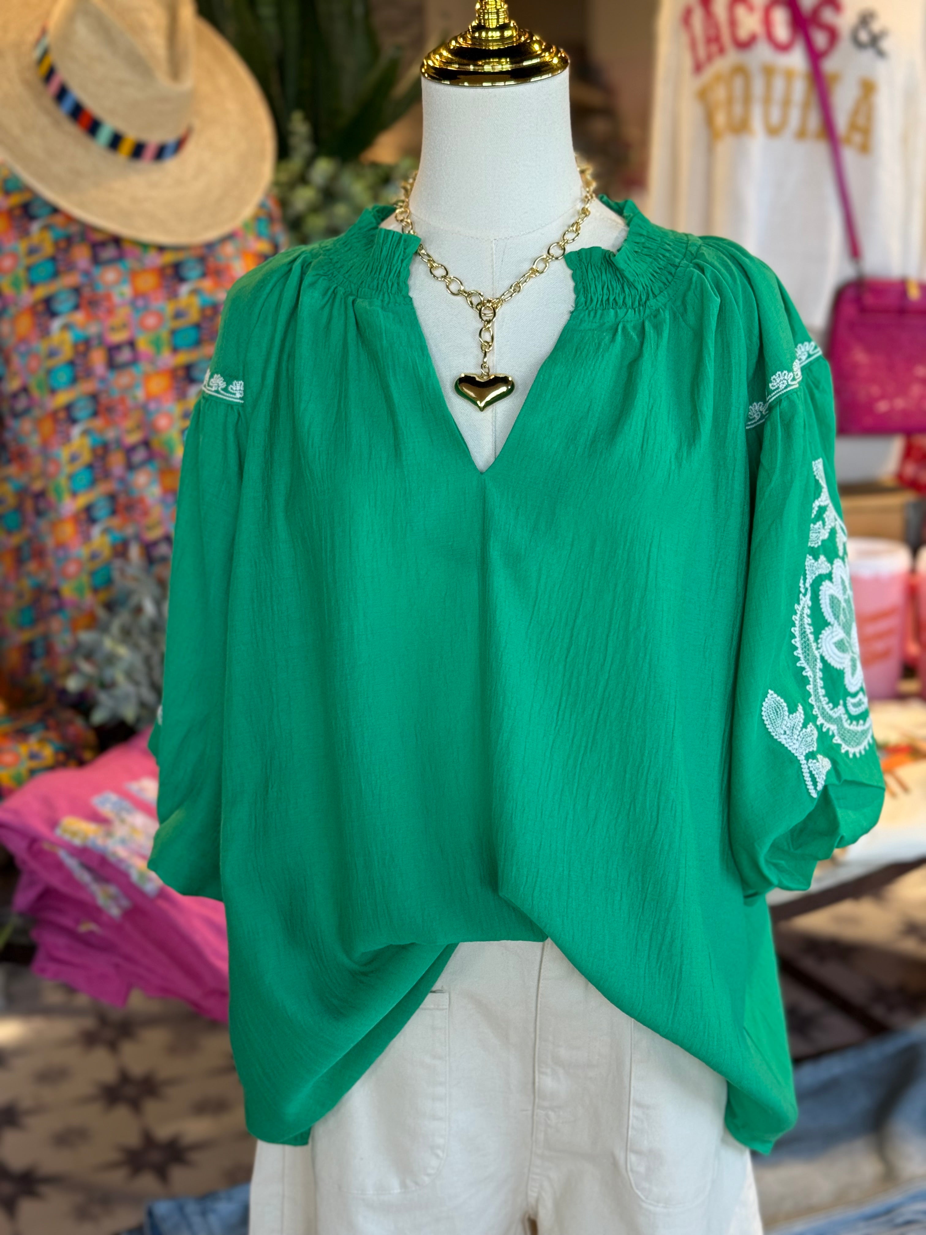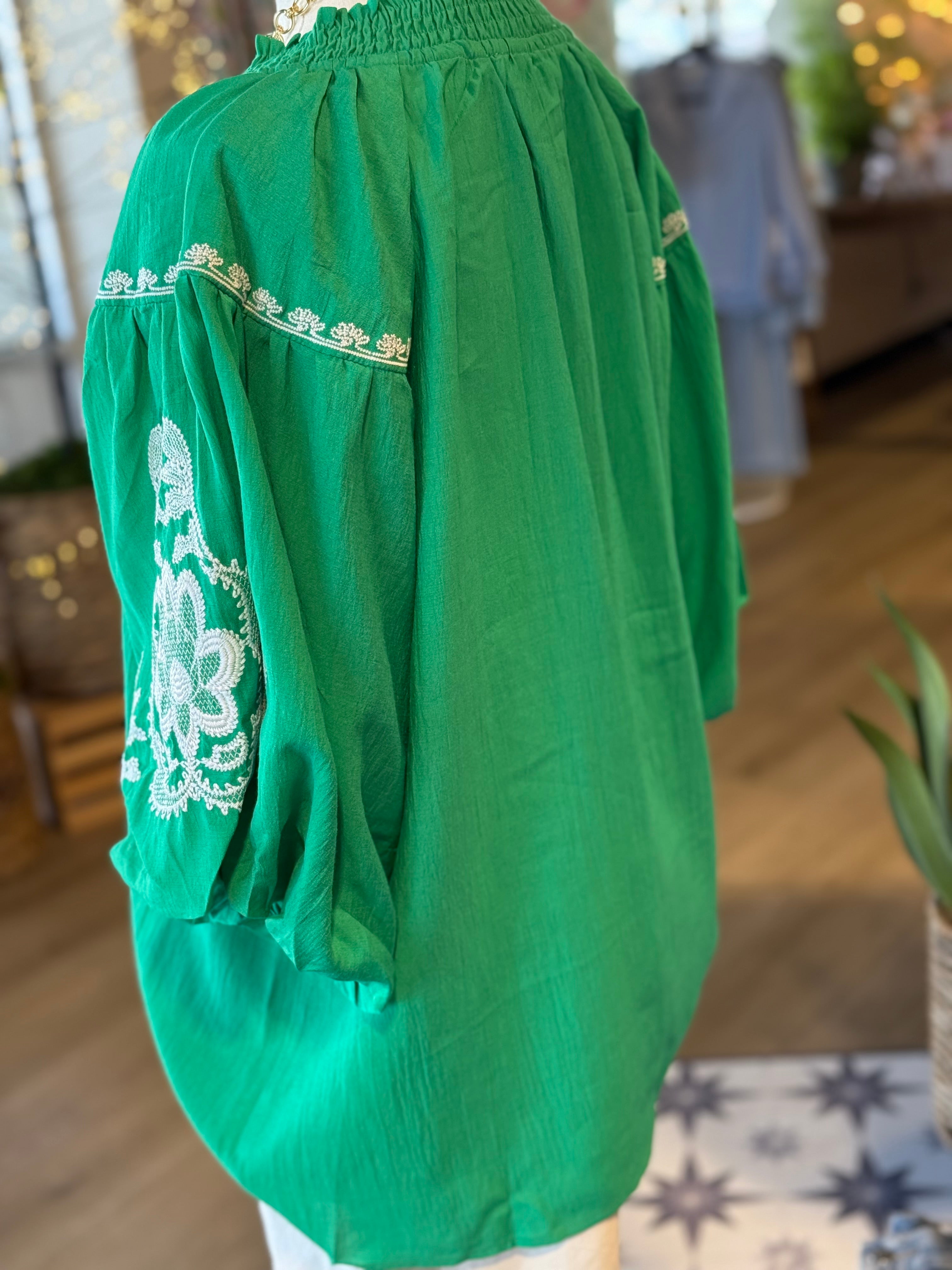 Gorgeous Kelly green blouse with white embroidery detailing. Rayon Blend