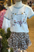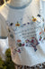 Off white tee with blue trim and embroidery detailing. Slightly roomy.