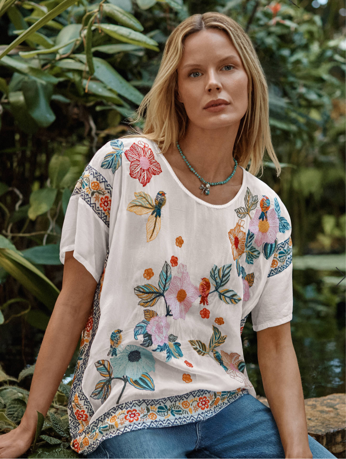 Charmingly adorned with a vibrant floral print, the Mariafe Blouse expertly combines casual comfort and impeccable style. Designed with a rounded neckline and short sleeves, this unique blouse features a handkerchief hem embellished with a vibrant embroidered trim. Pair with a colorful skirt and fashion sneakers for a casual vacation look.