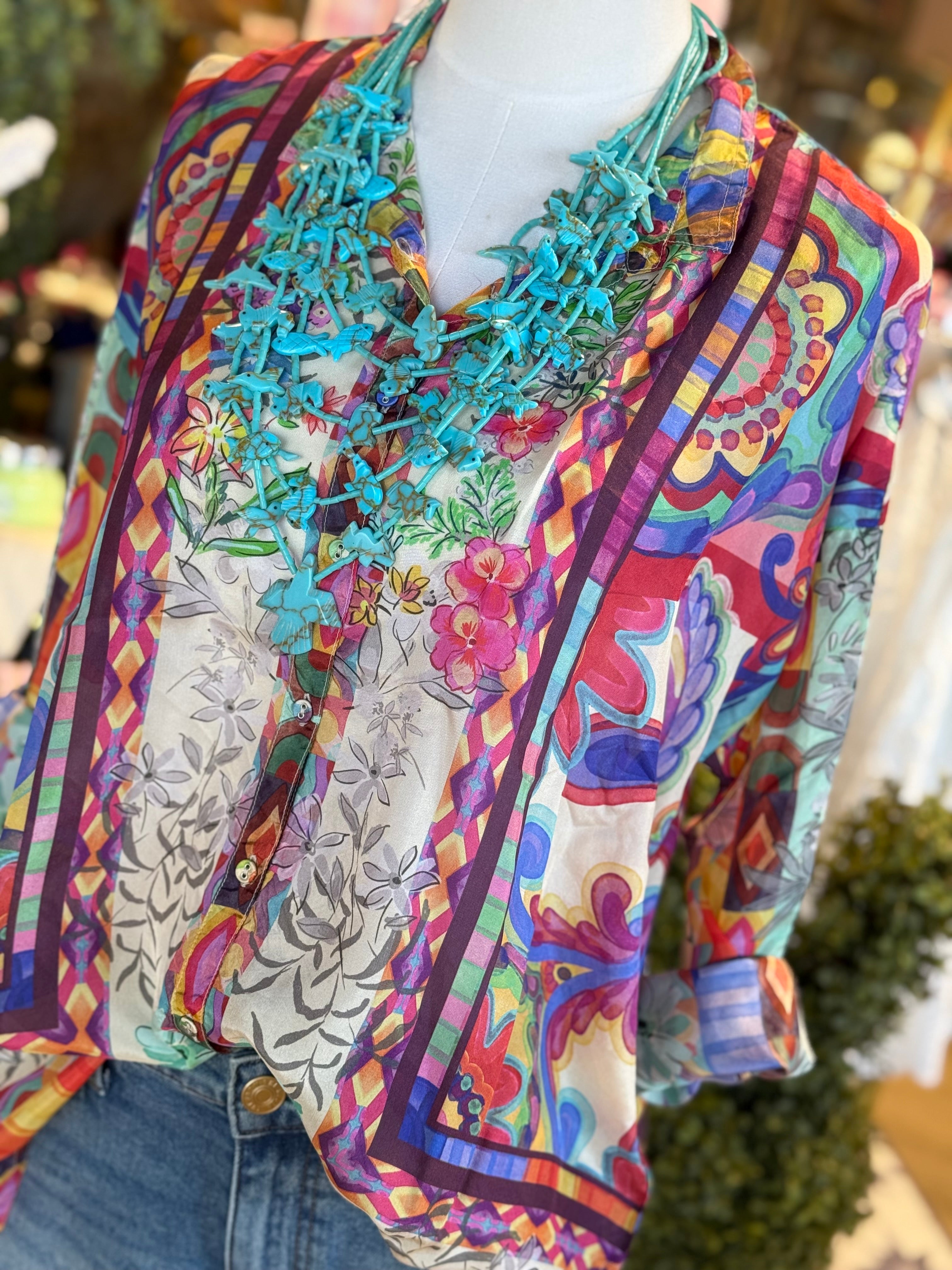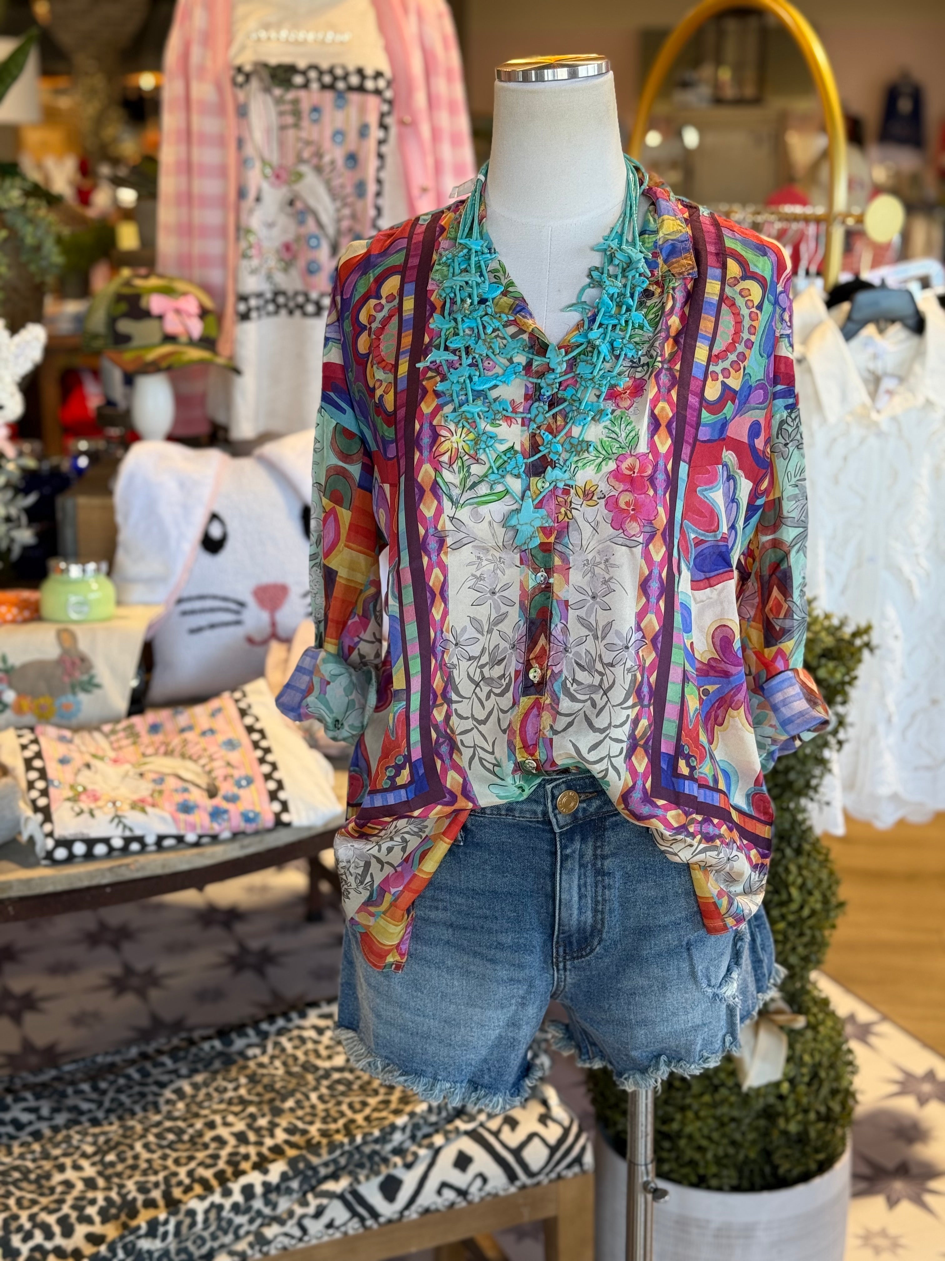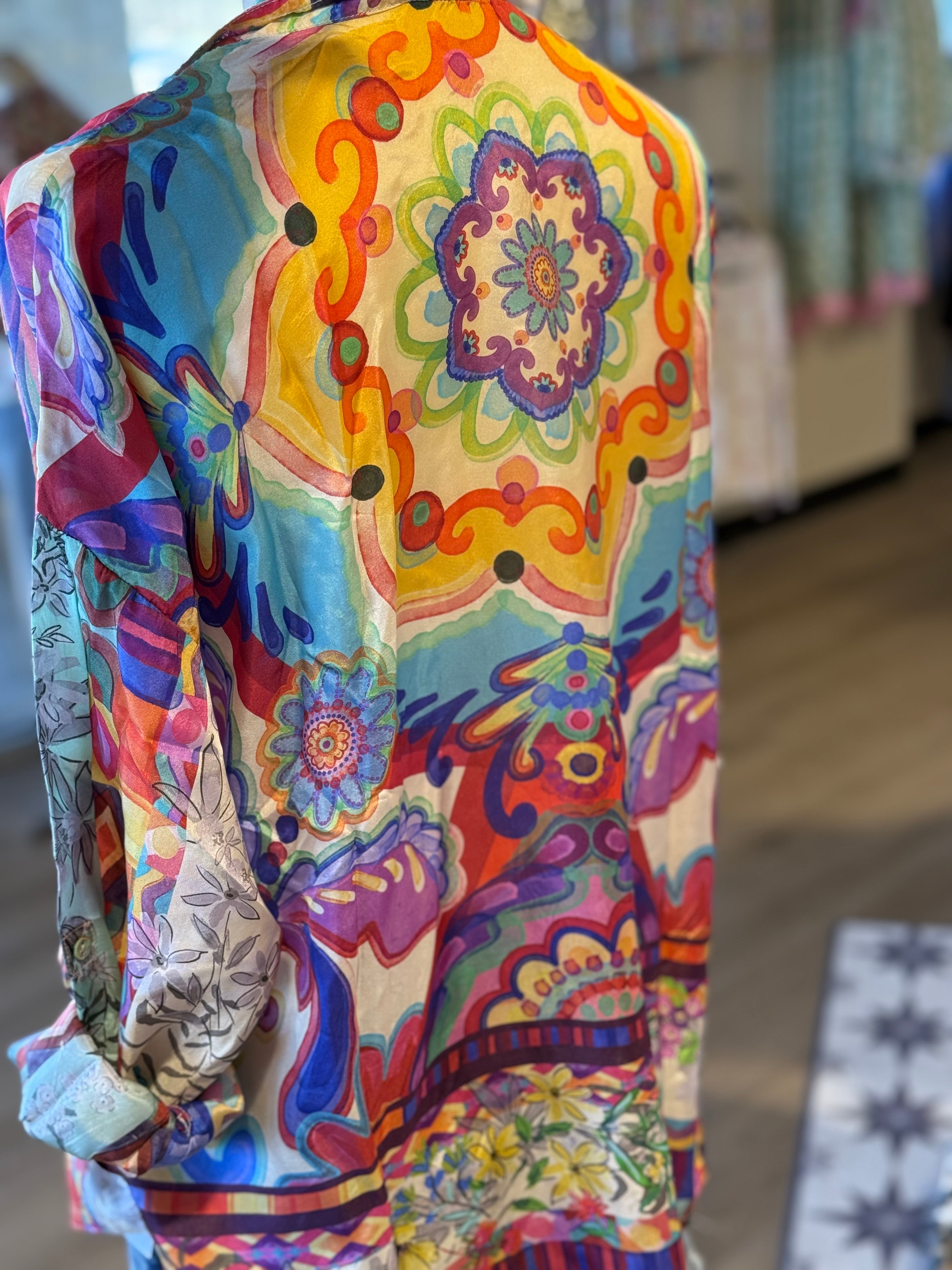 Beautifully embellished with a blended watercolor floral motif, the Oversized Audrey Shirt offers a boyfriend oversized silhouette and a relaxed fit. Crafted from 100% luxurious silk, this button-front shirt is finished with a drop shoulder and roll-tab sleeves. Pair with dark wash denim and flats for a vibrant casual ensemble.