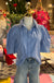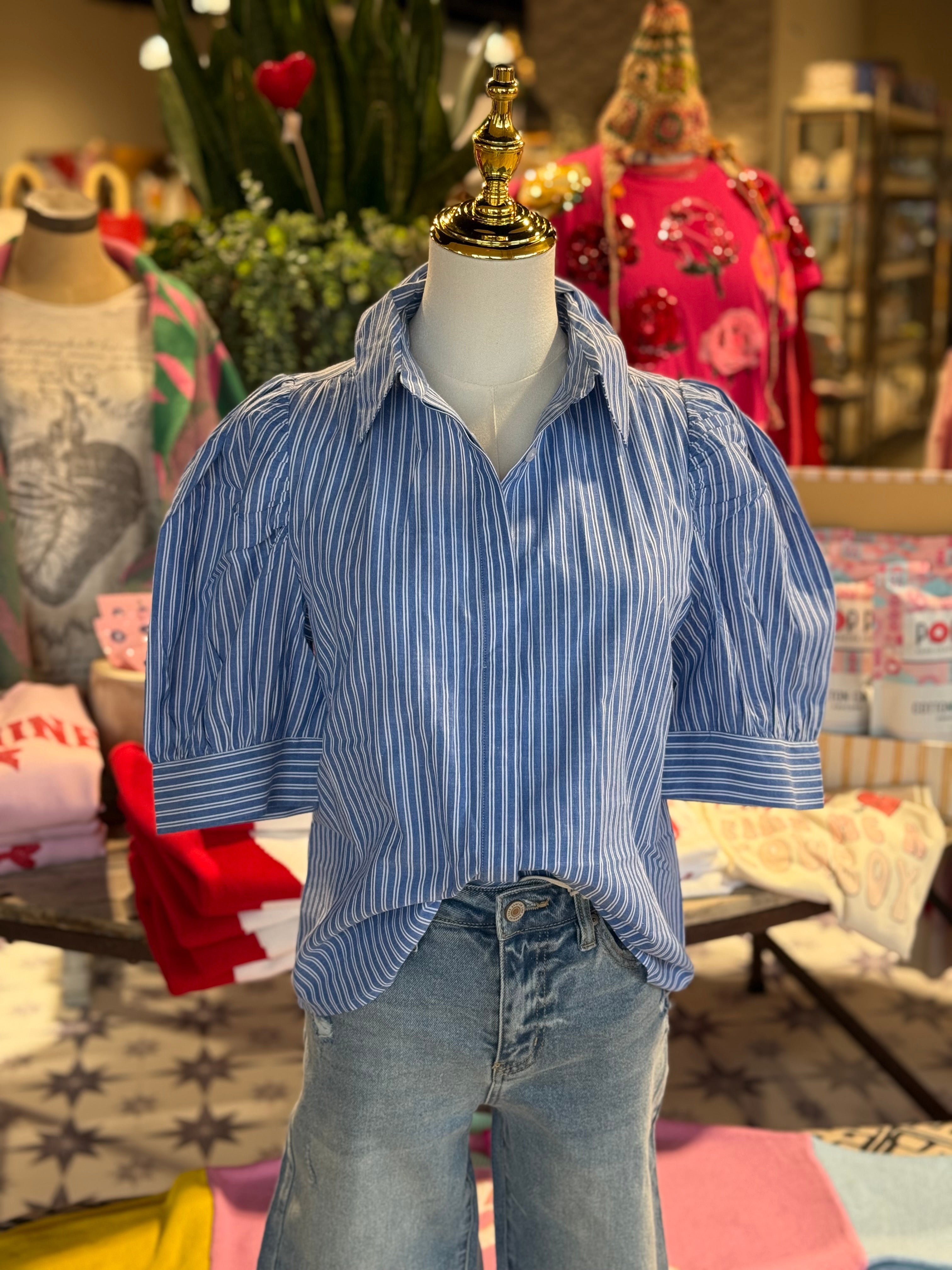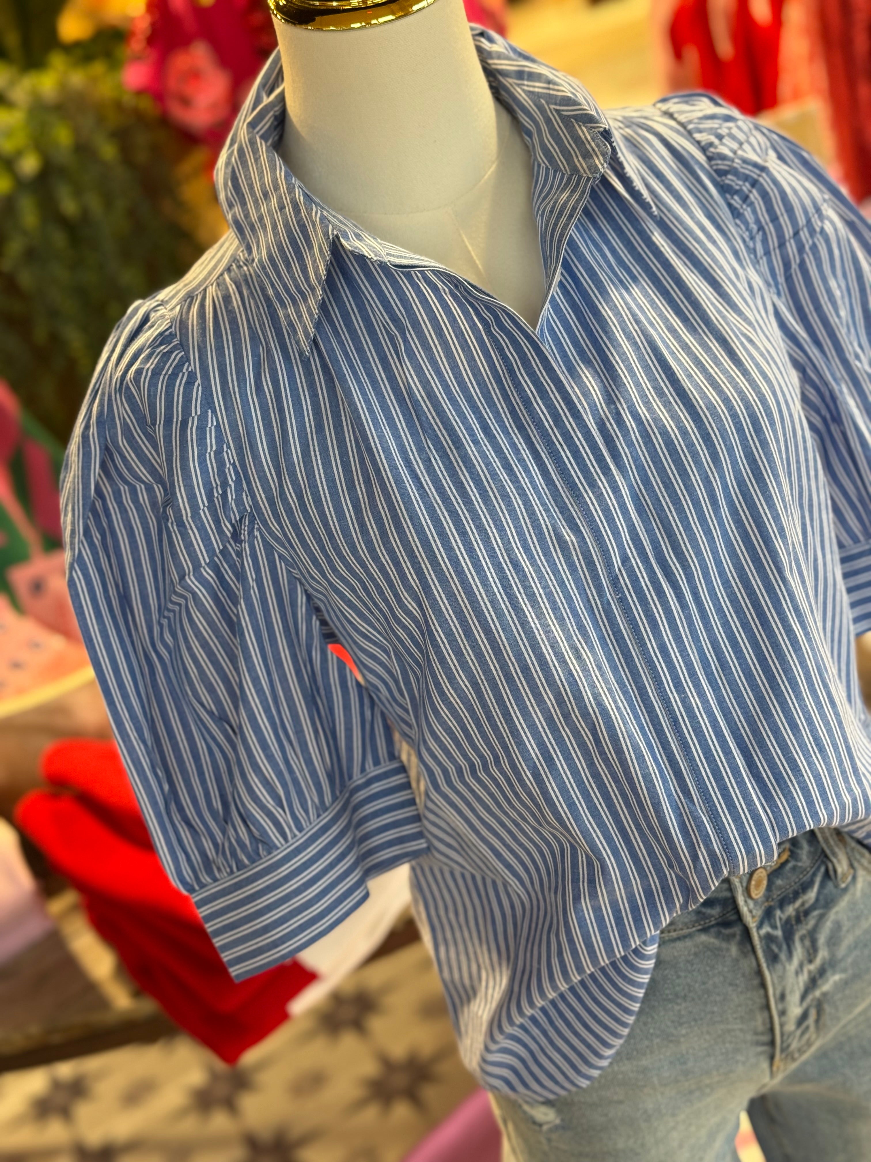 100% cotton blue and white stripe button up. Puff sleeve.